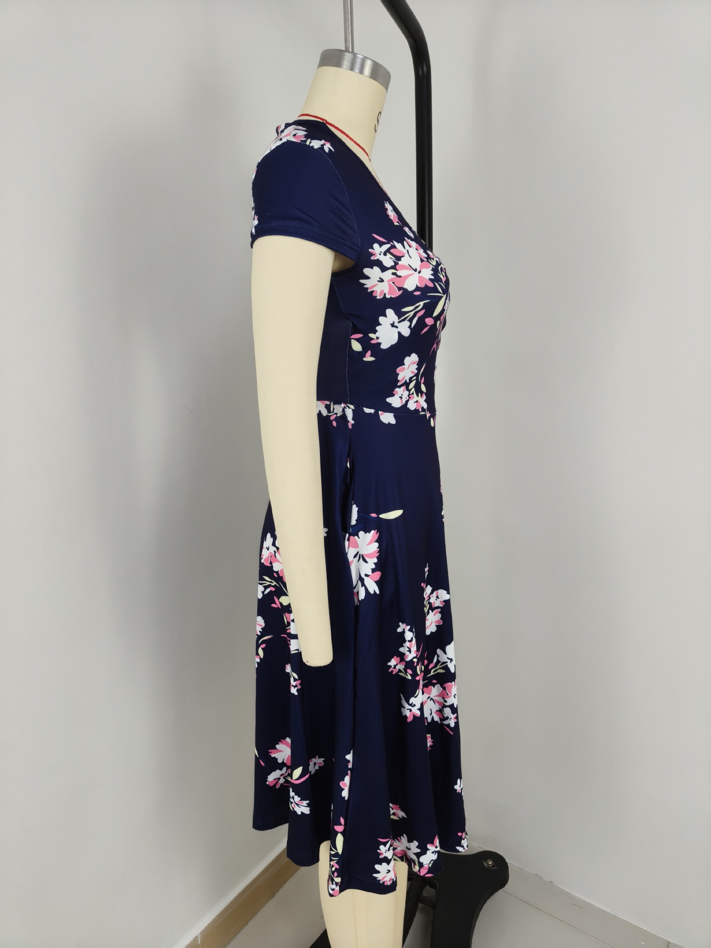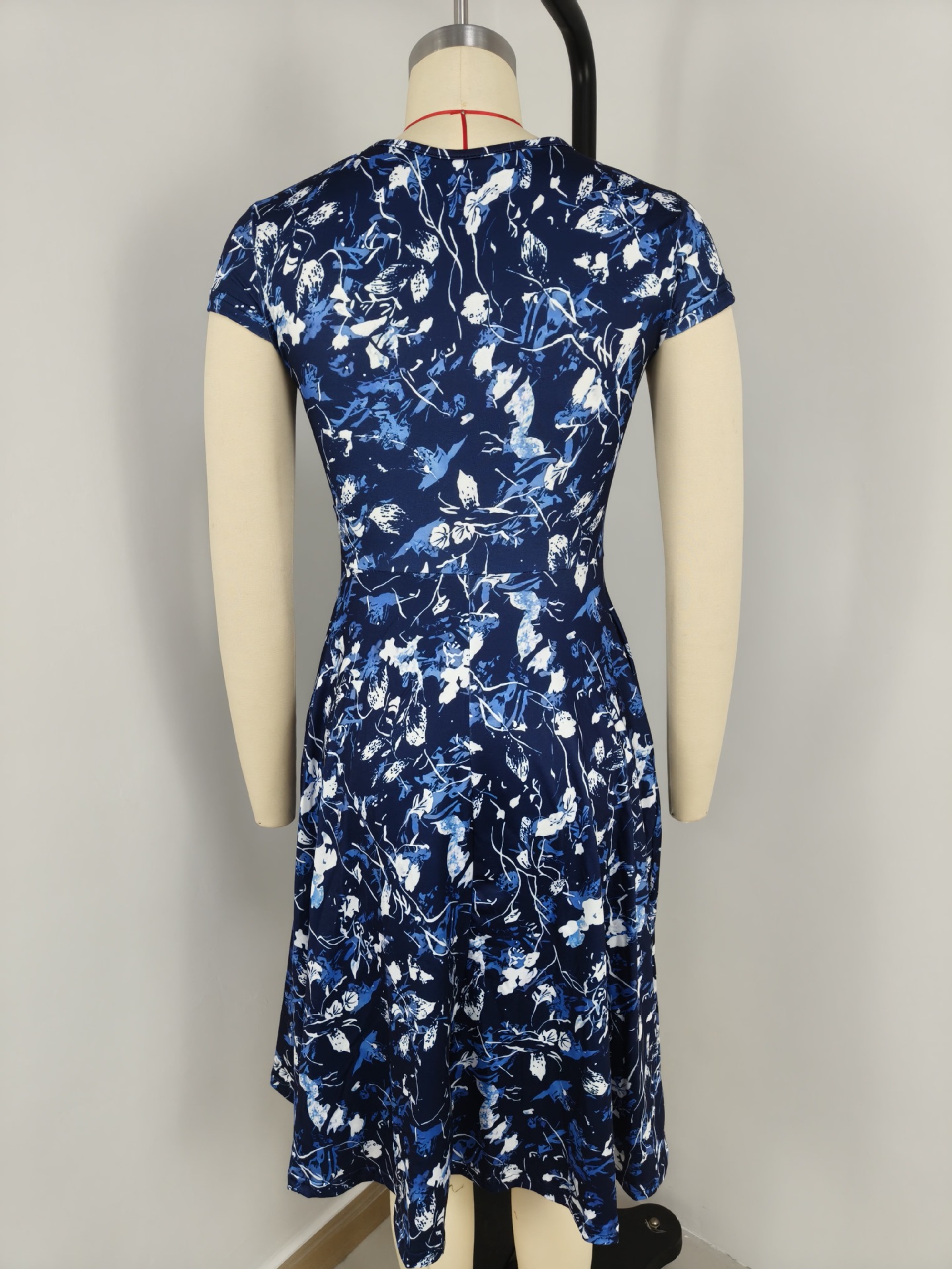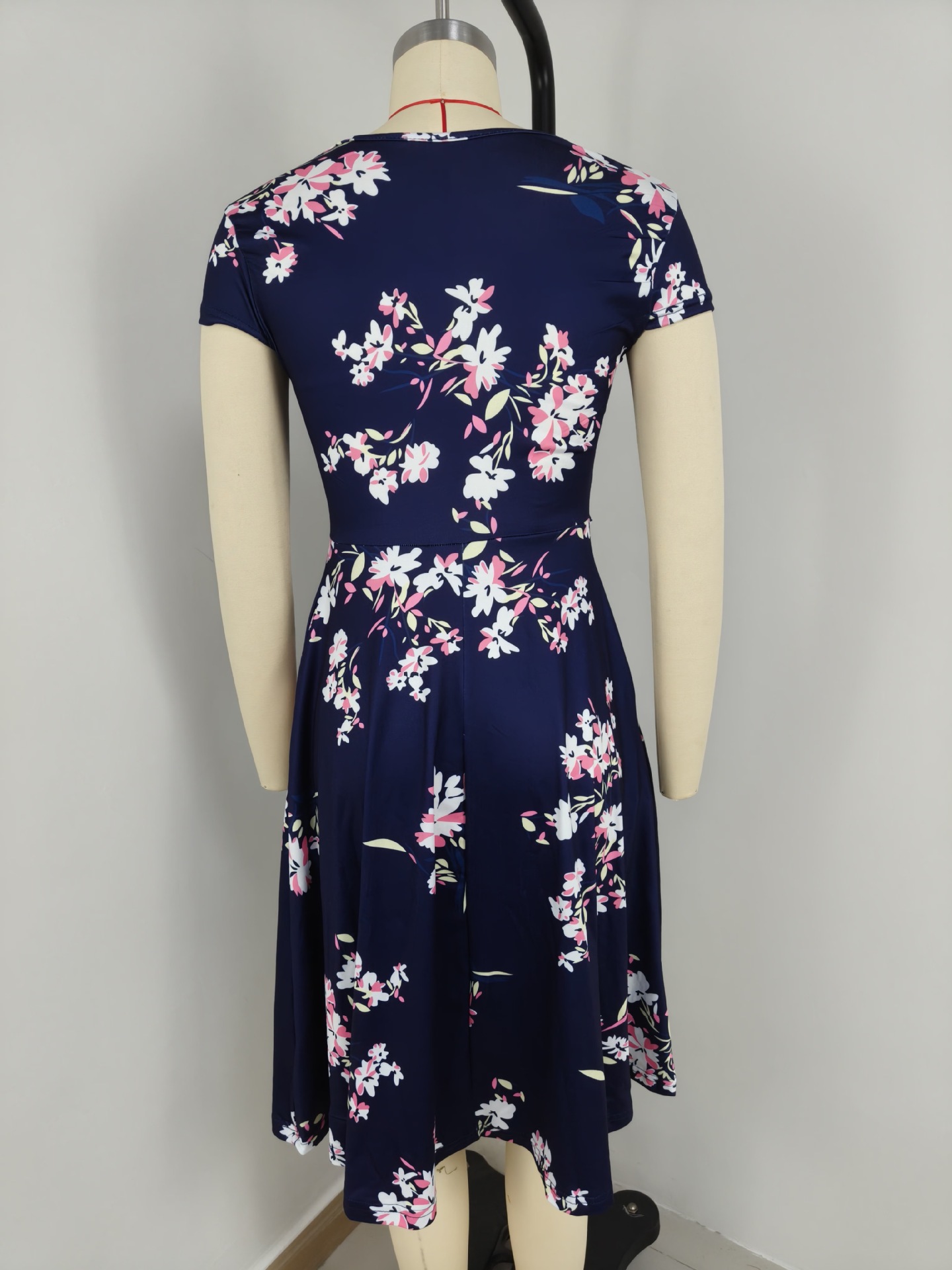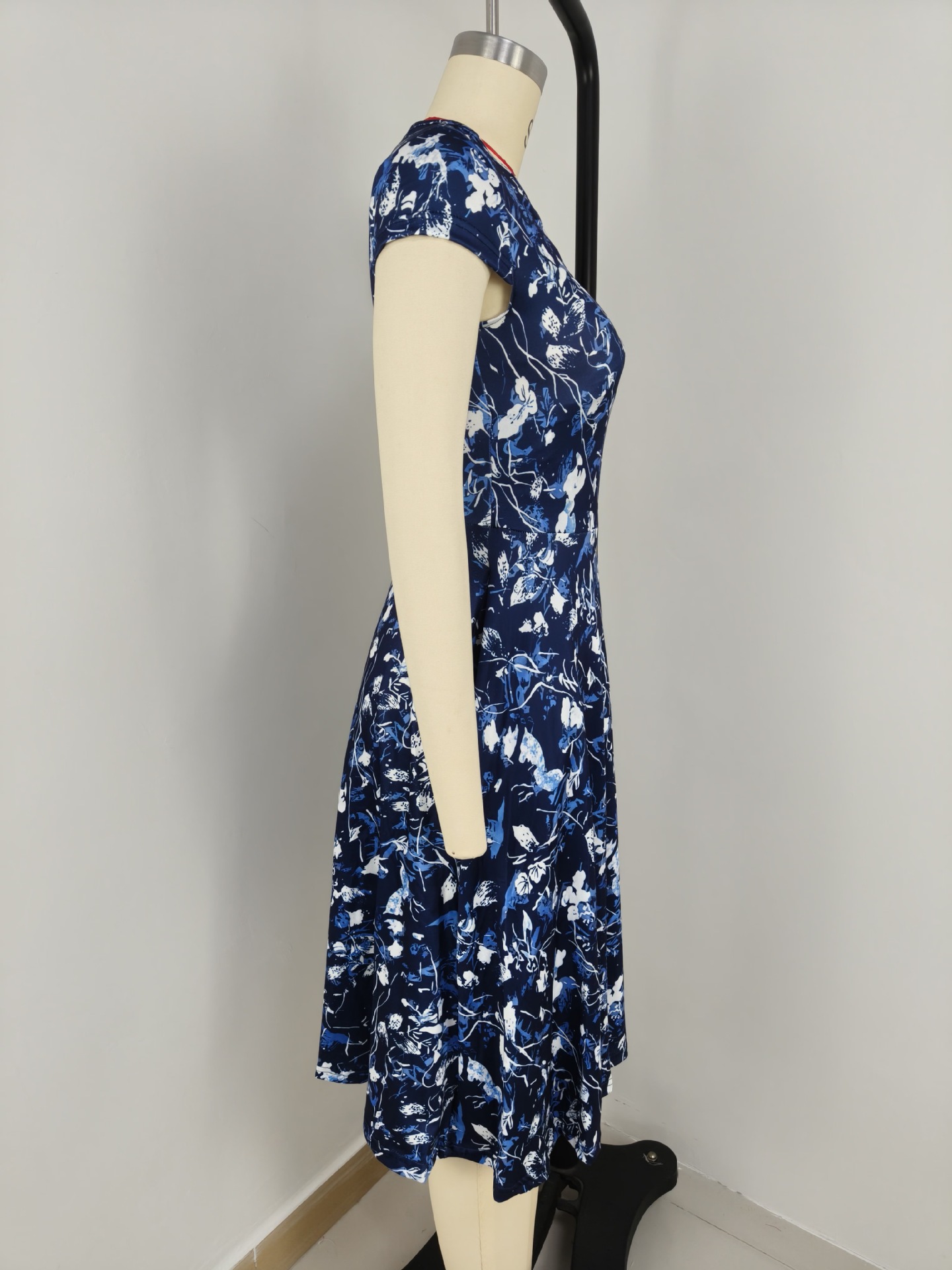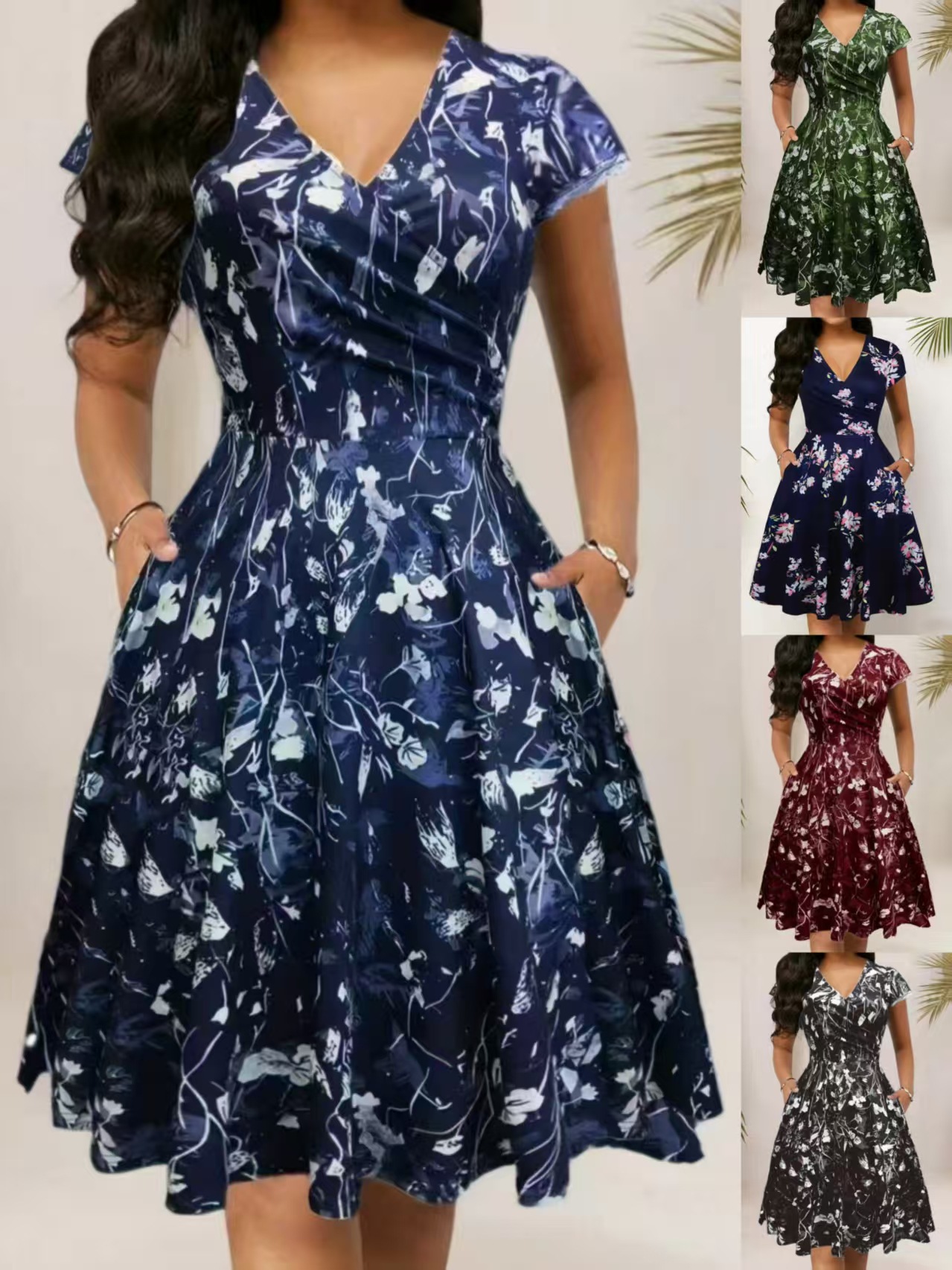 유럽과 미국의 아마존 새로운 여름 새로운 라운드 넥 포켓 짧은 소매 인기있는 인쇄 긴 원피스 우아한 원피스