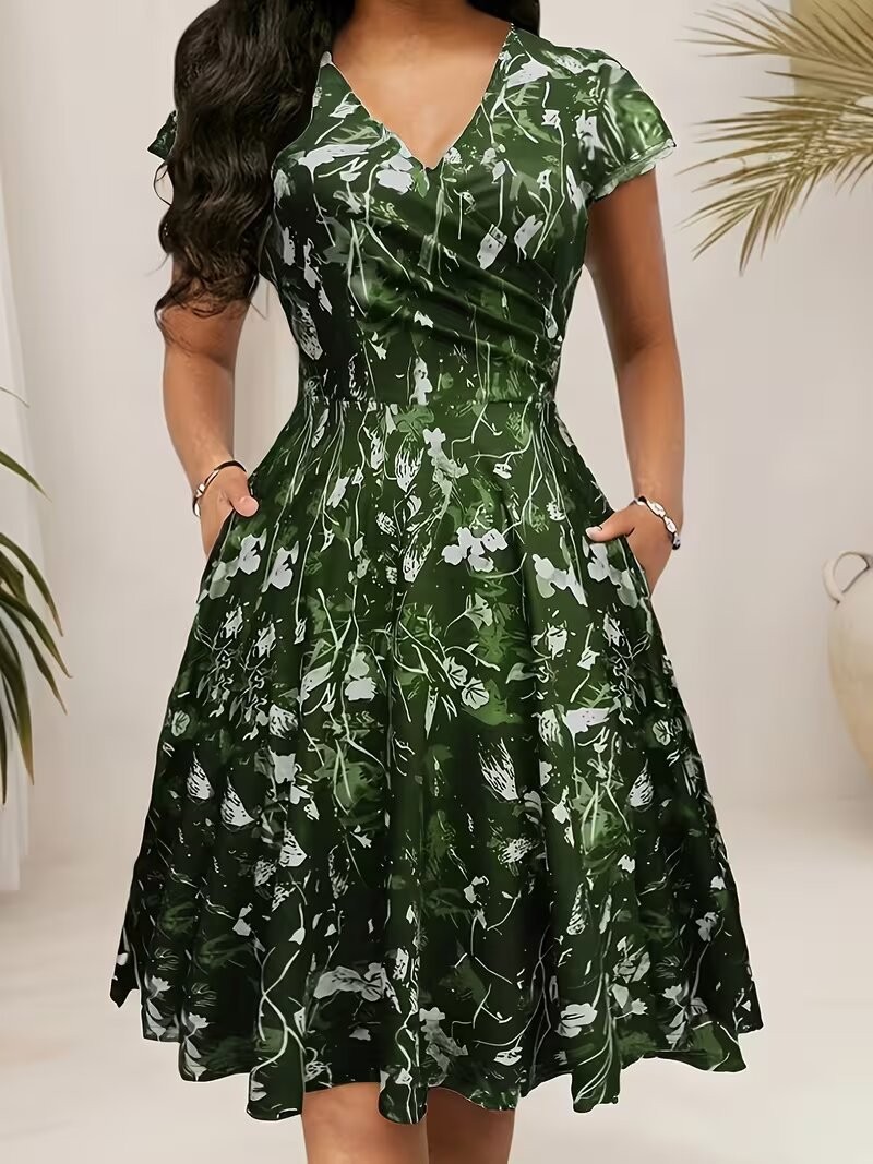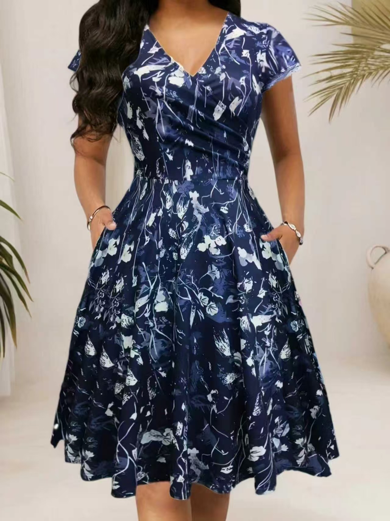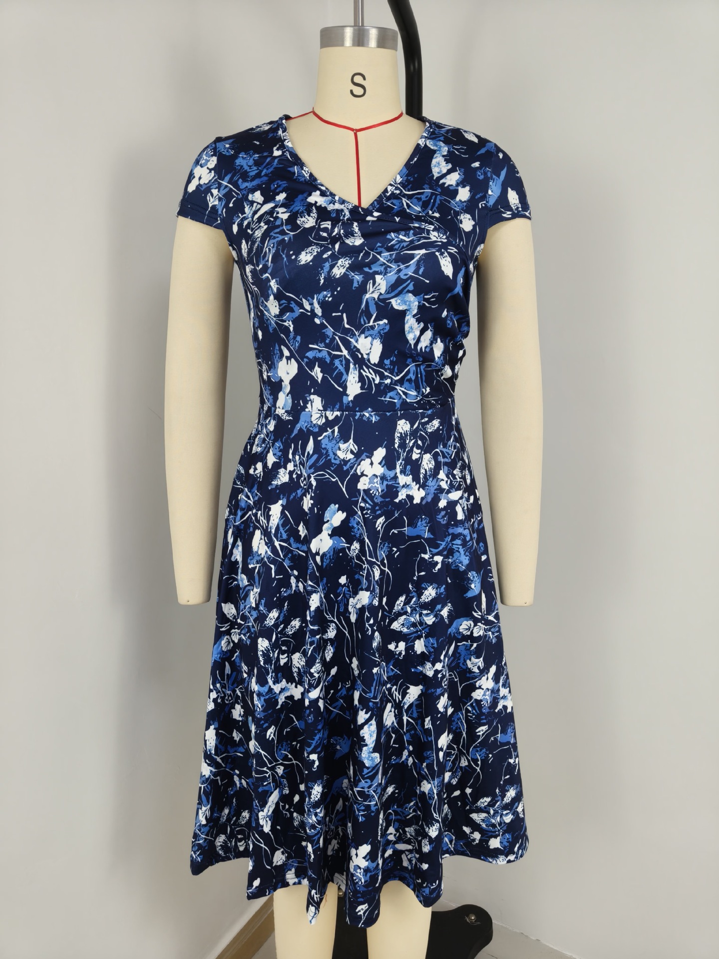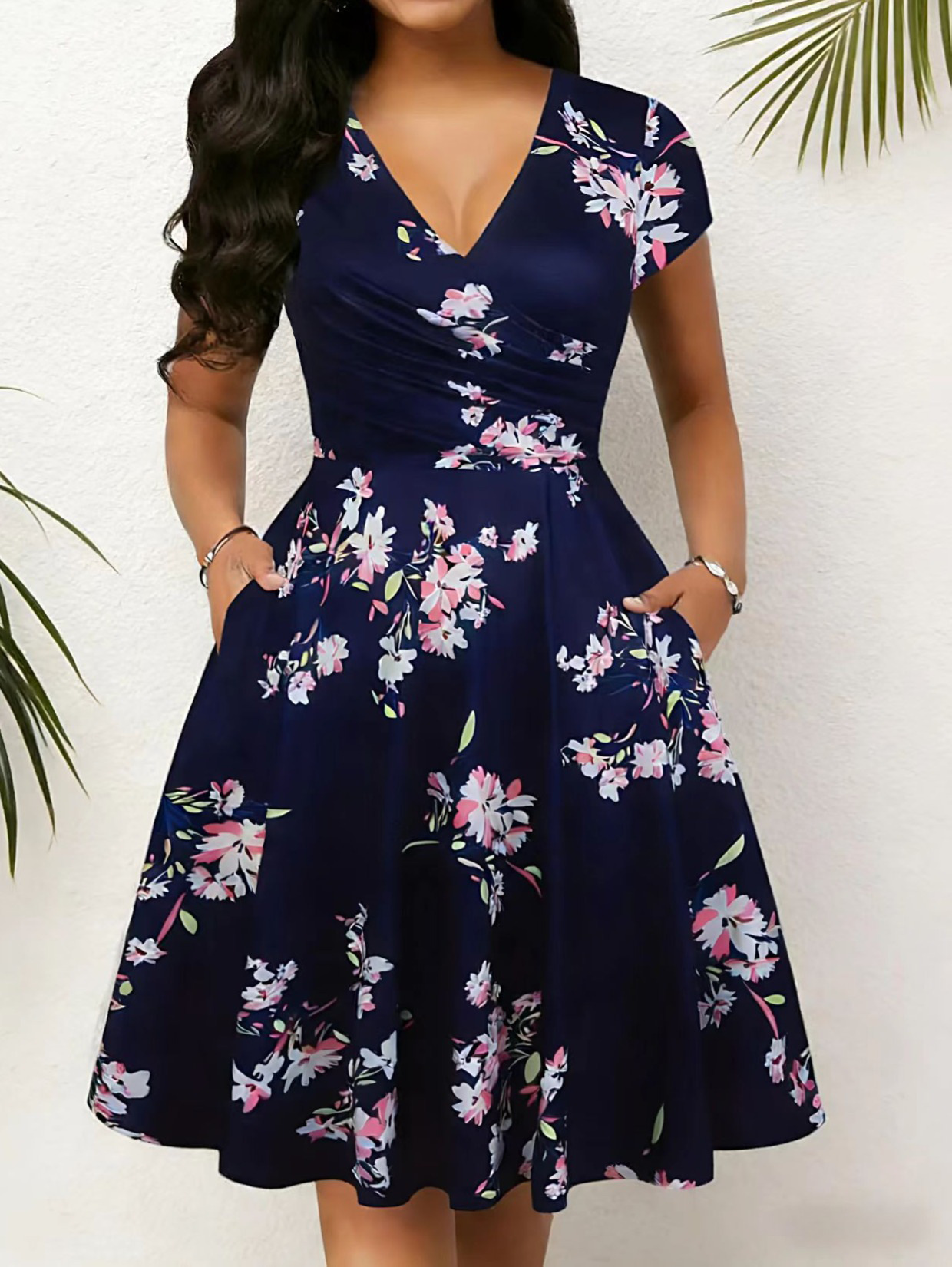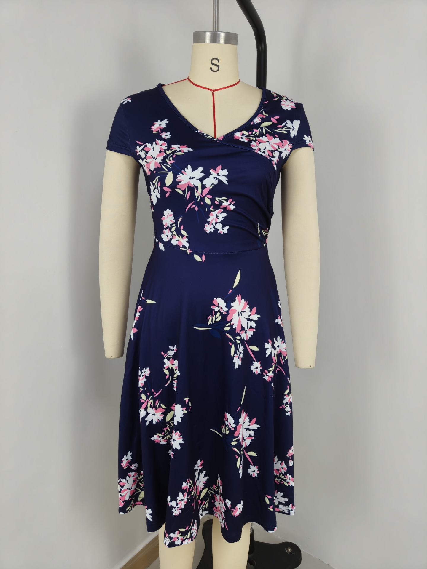 유럽과 미국의 아마존 새로운 여름 새로운 라운드 넥 포켓 짧은 소매 인기있는 인쇄 긴 원피스 우아한 원피스