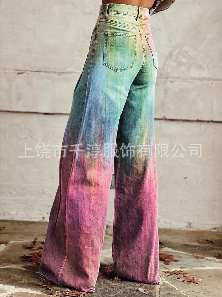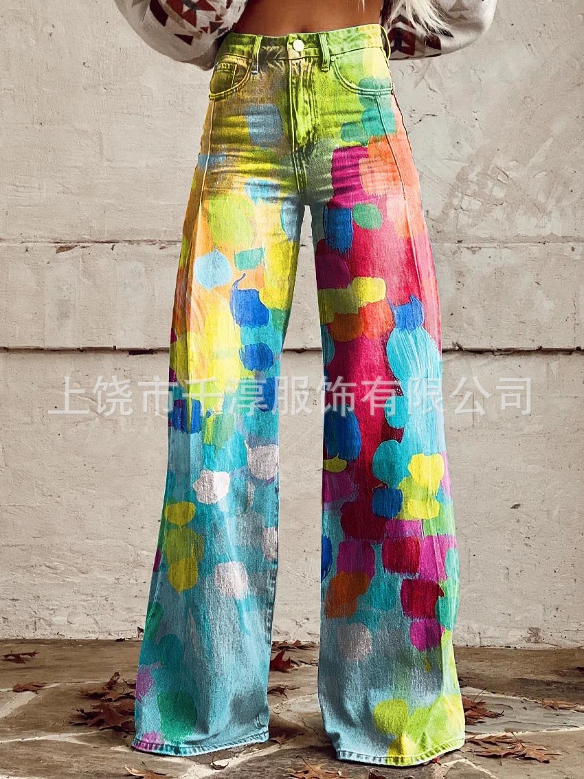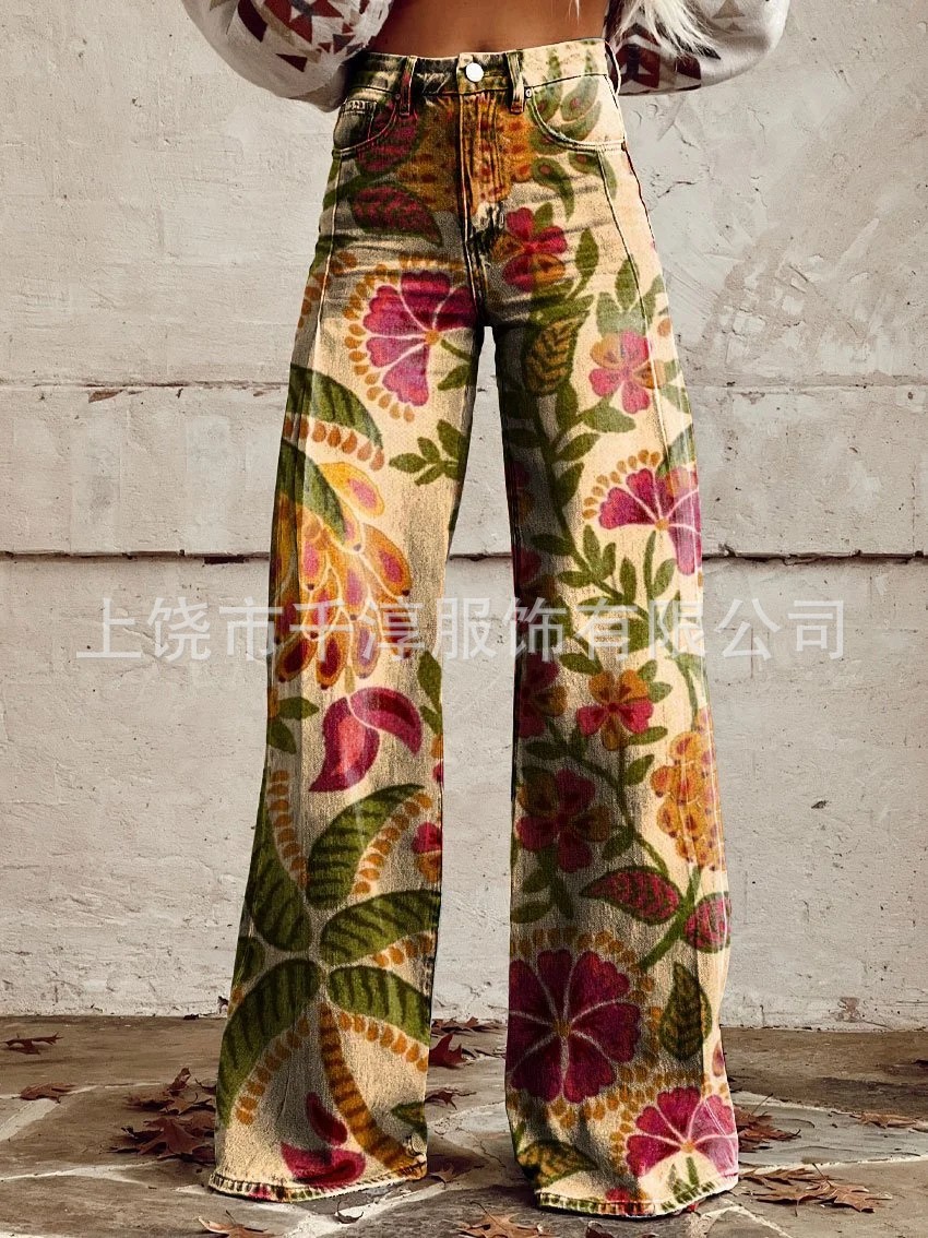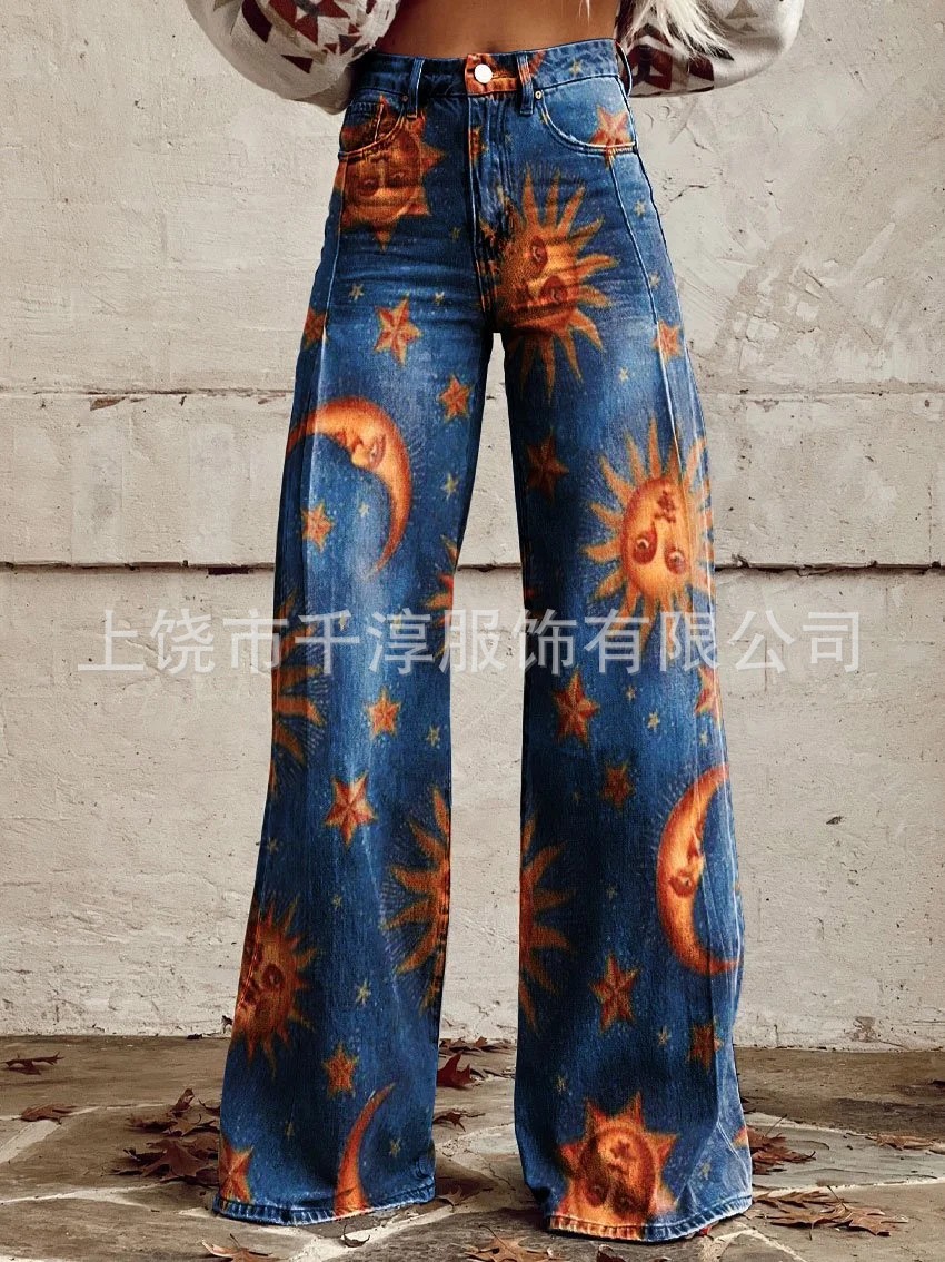 독립 역 Xiyin 유럽과 미국의 대외 무역 국경 여성 캐주얼 바지 인쇄 모방 청바지 넓은 다리 3D 패션 여성