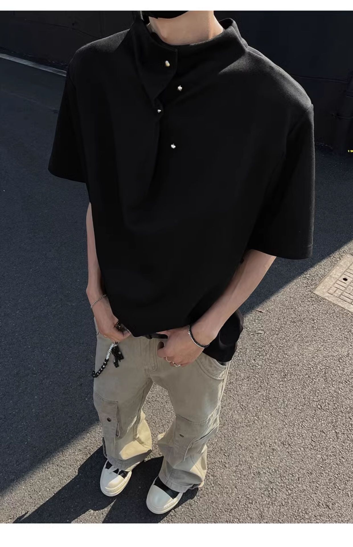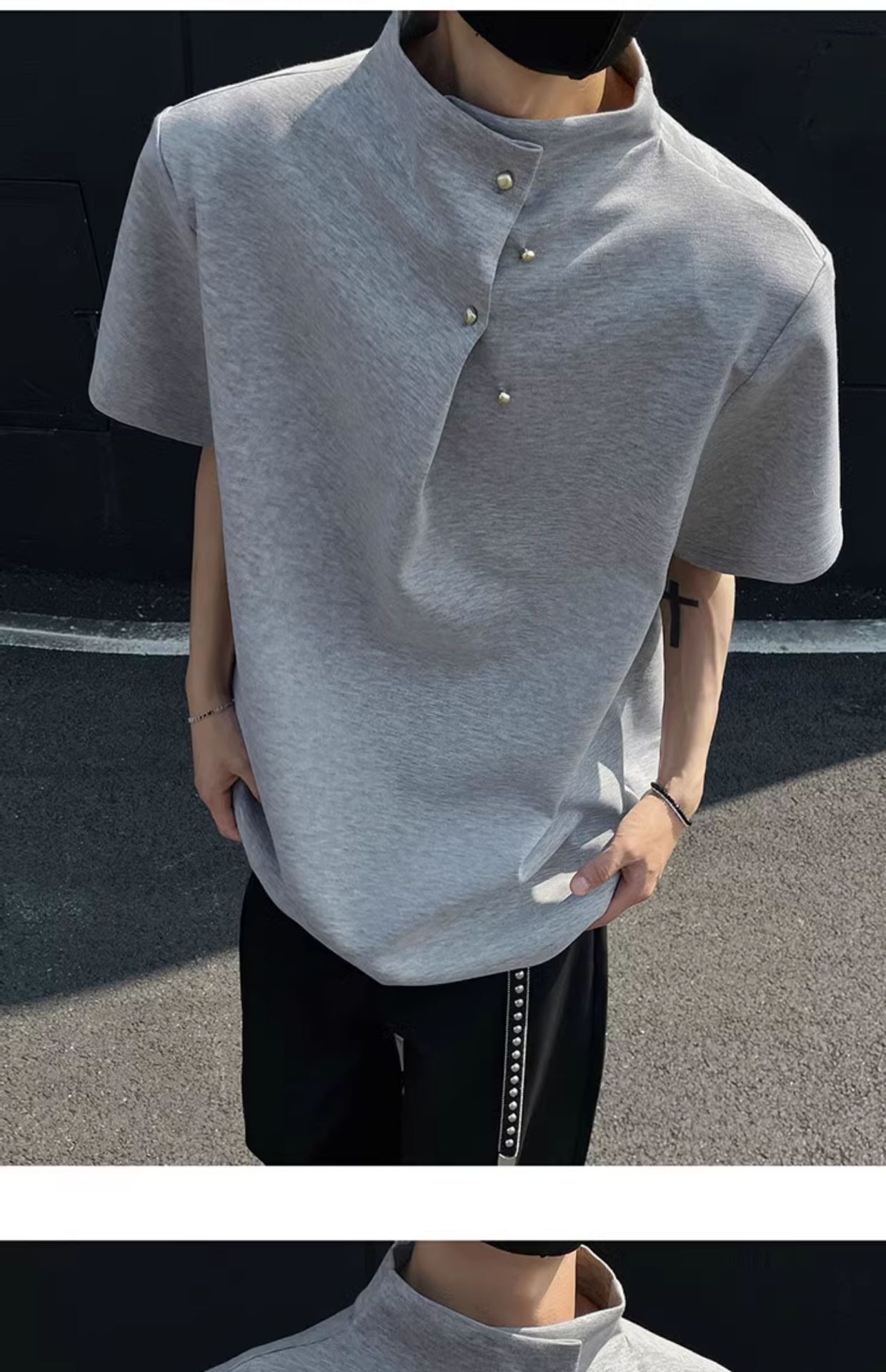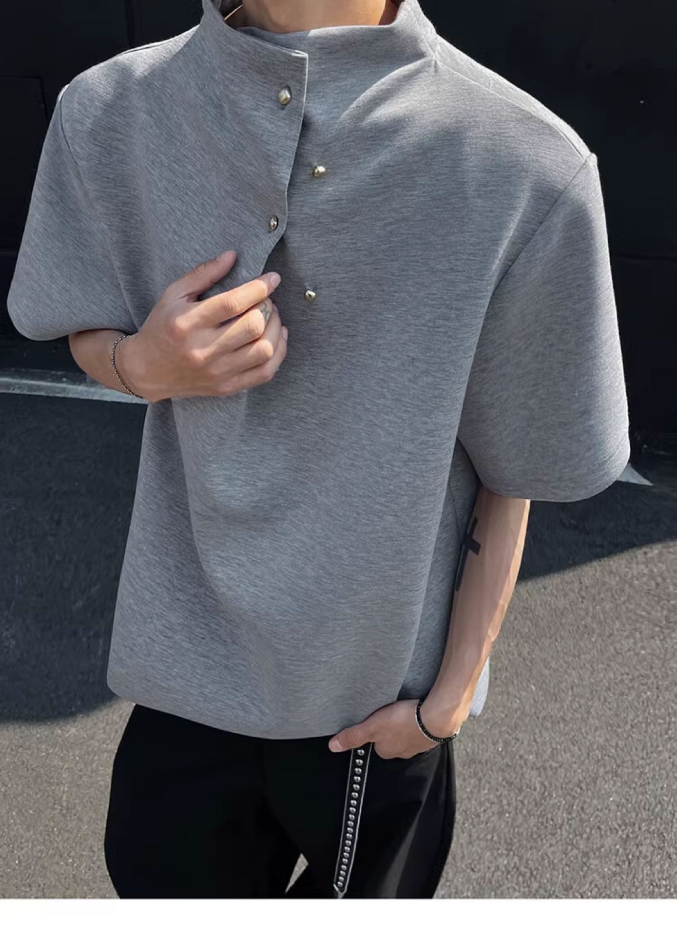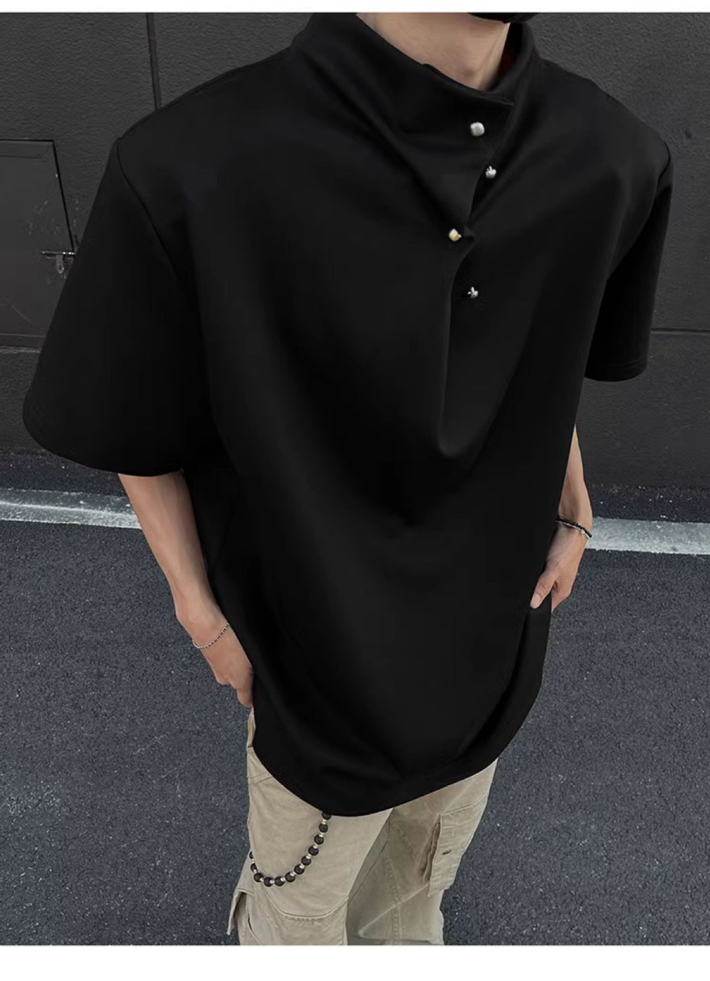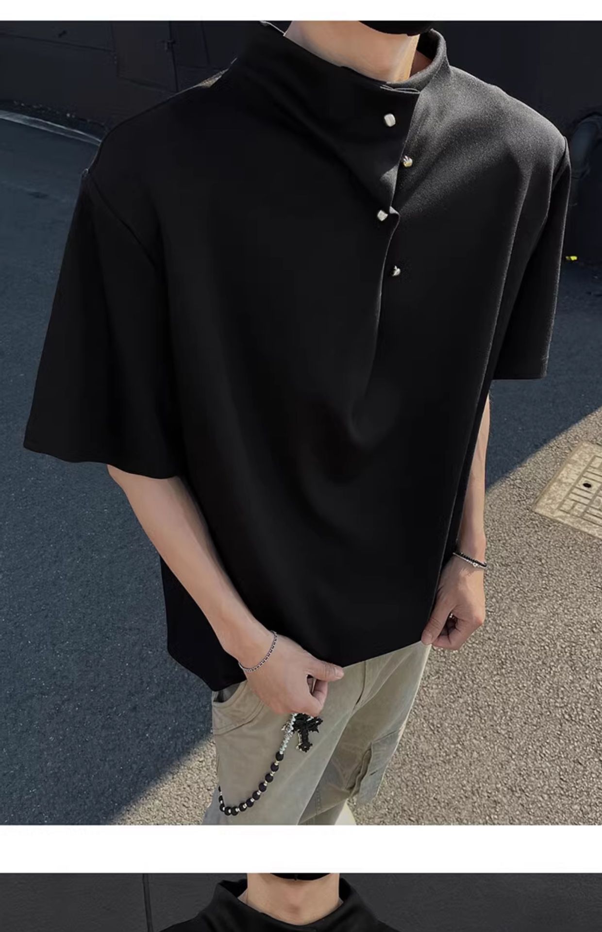 불규칙한 버튼 디자인 센스 짧은 소매 티셔츠 남성 여름 미국 스타일 패션 무거운 패드 어깨 반 높은 칼라 반 소매
