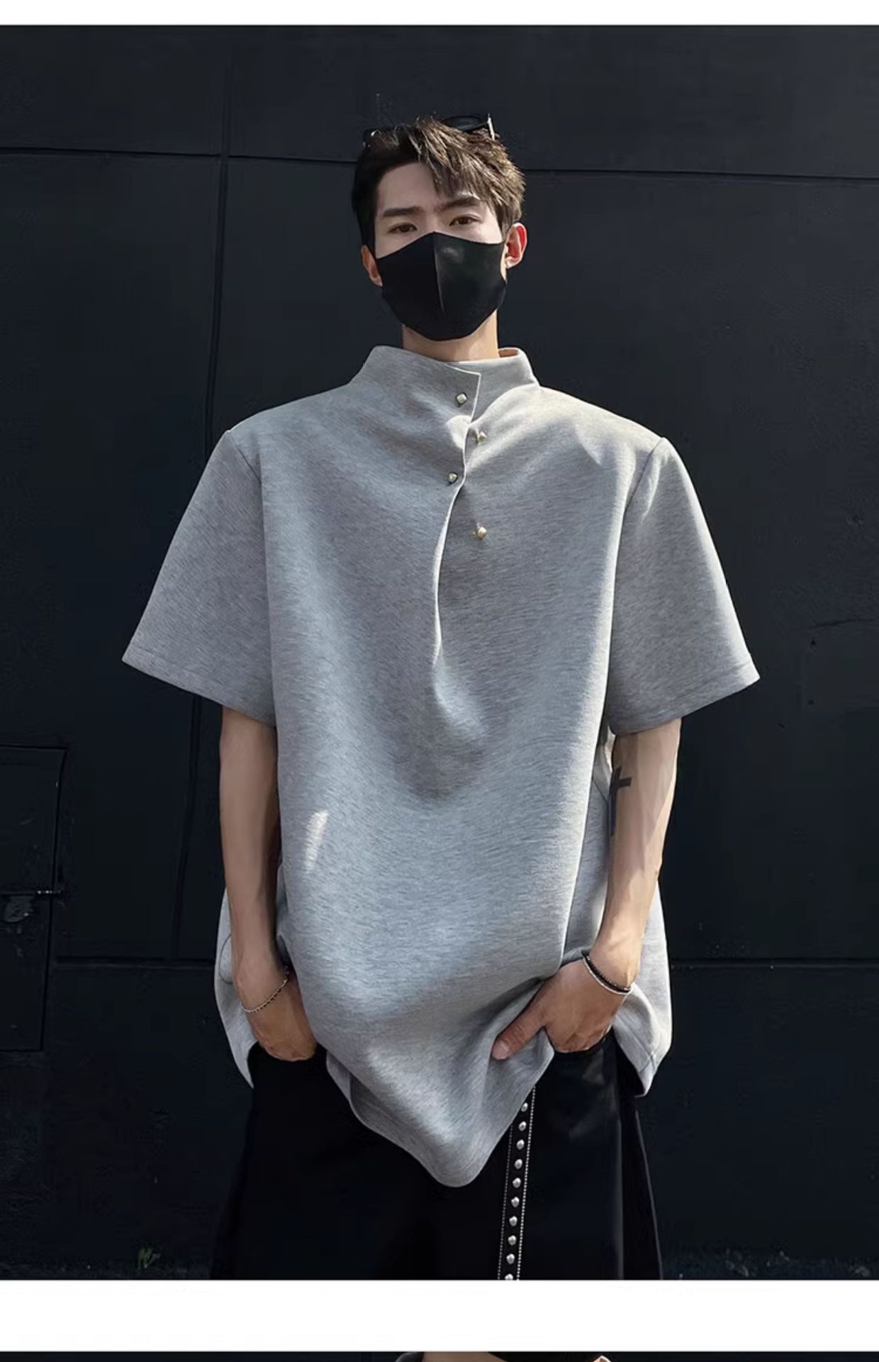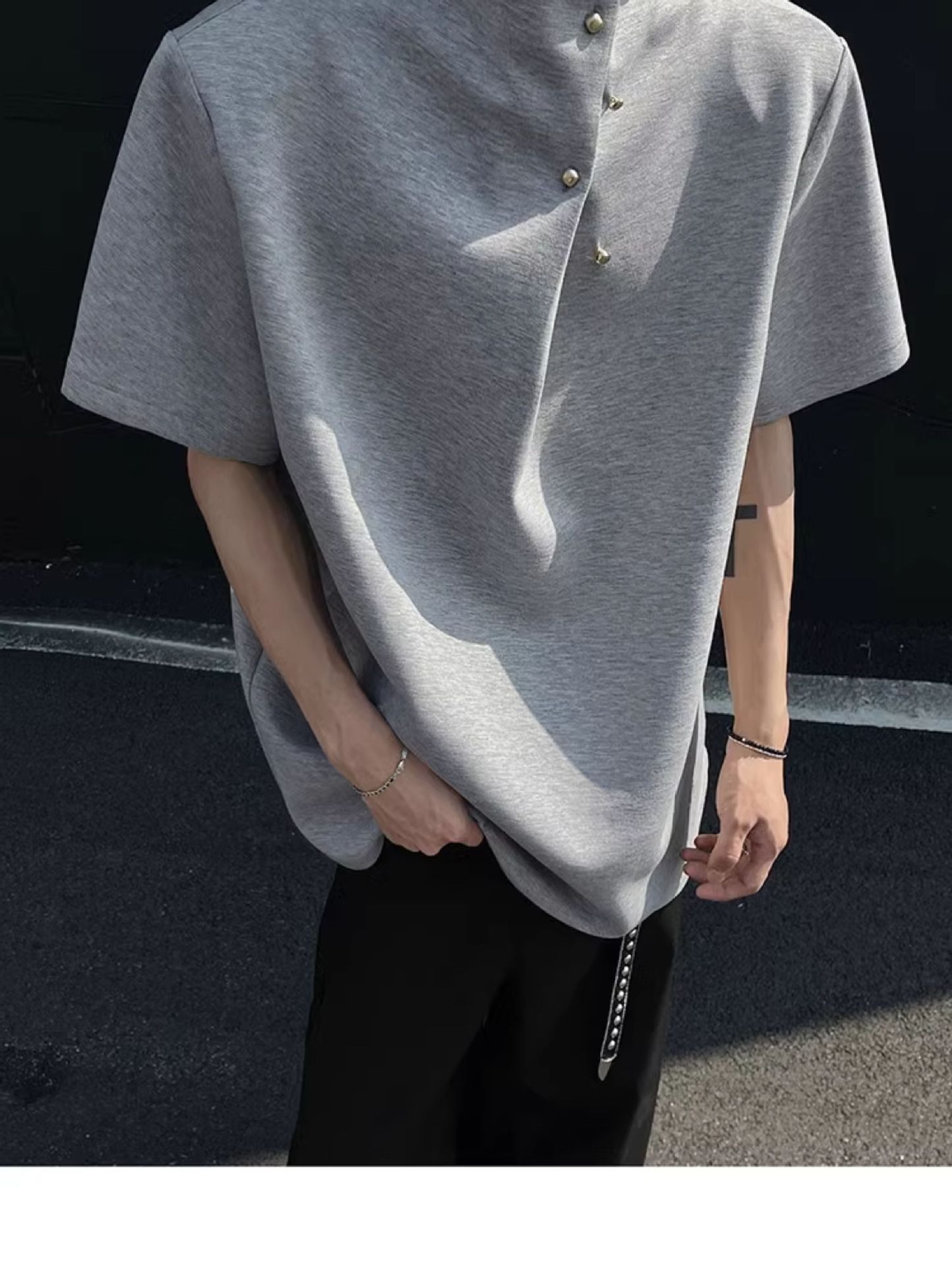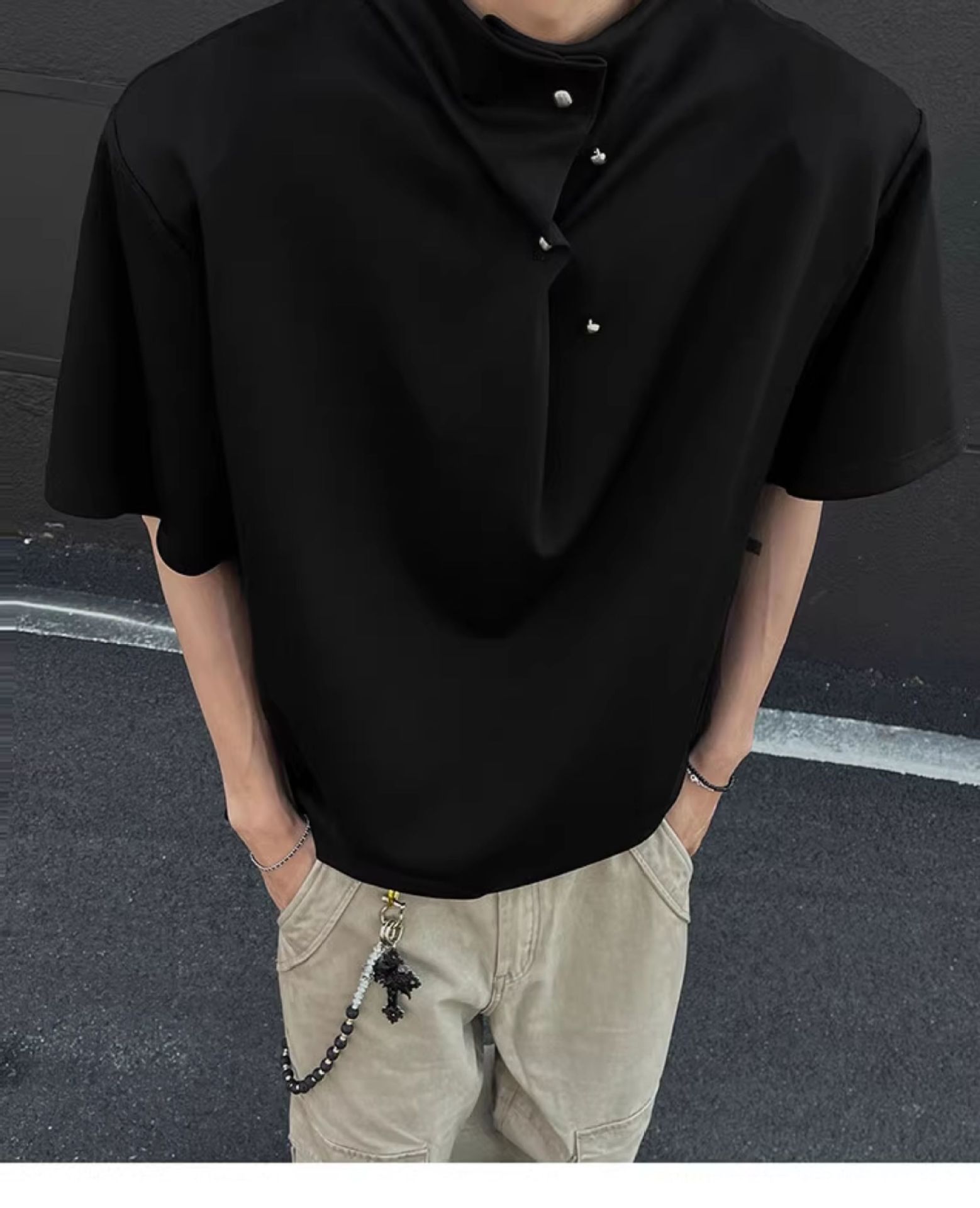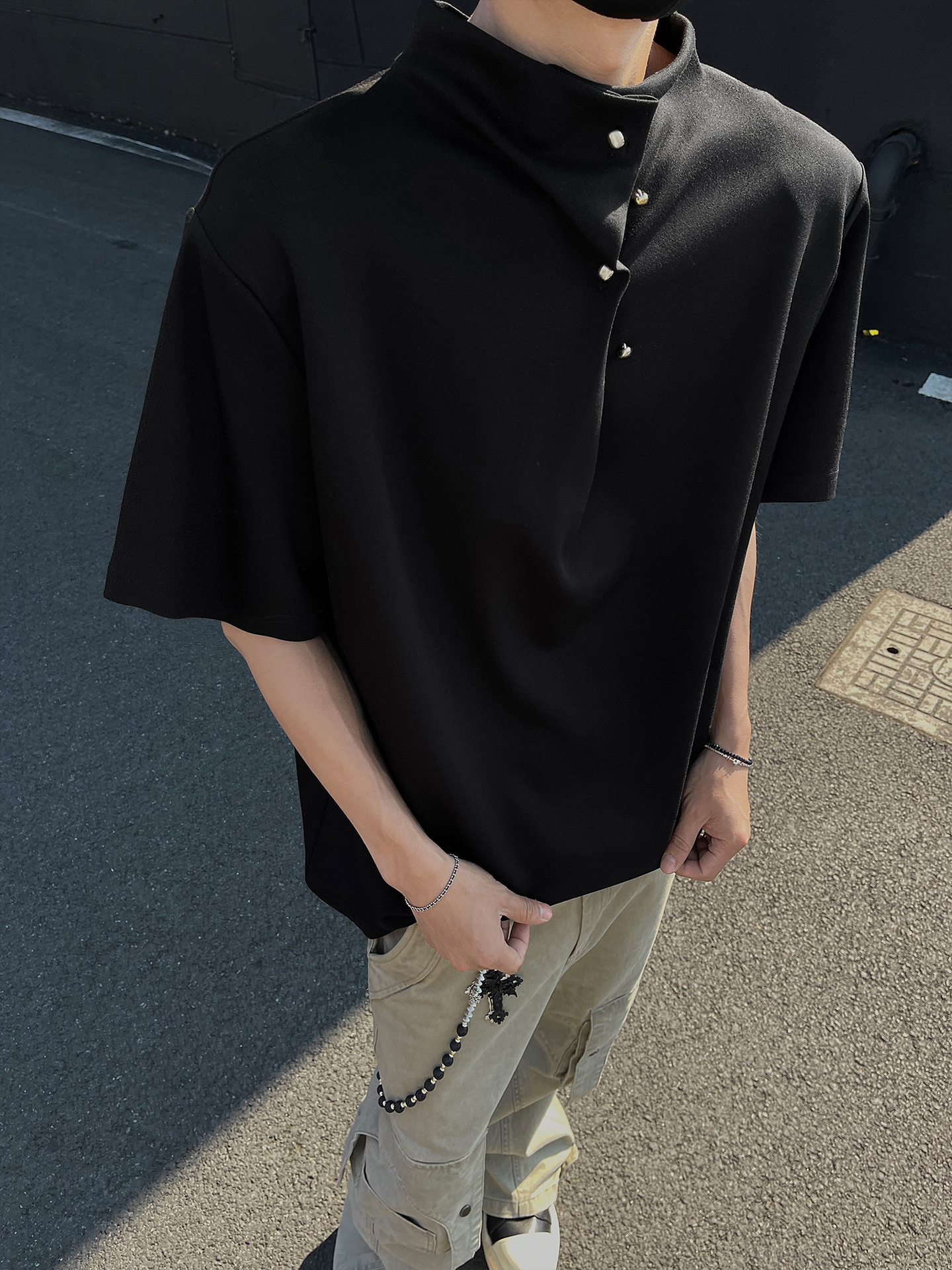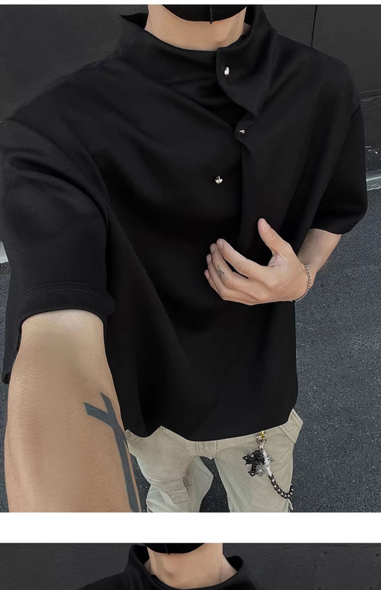 불규칙한 버튼 디자인 센스 짧은 소매 티셔츠 남성 여름 미국 스타일 패션 무거운 패드 어깨 반 높은 칼라 반 소매
