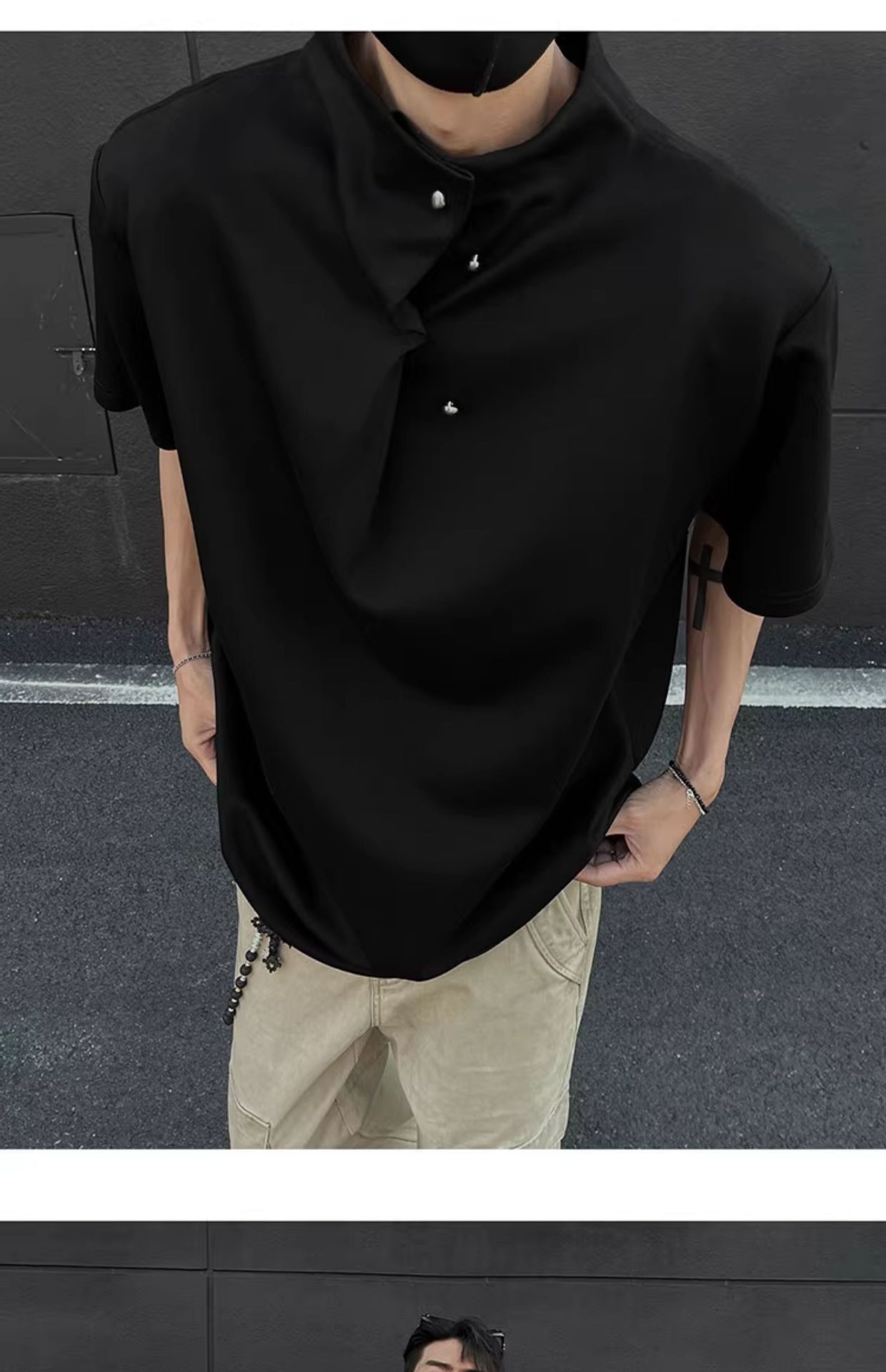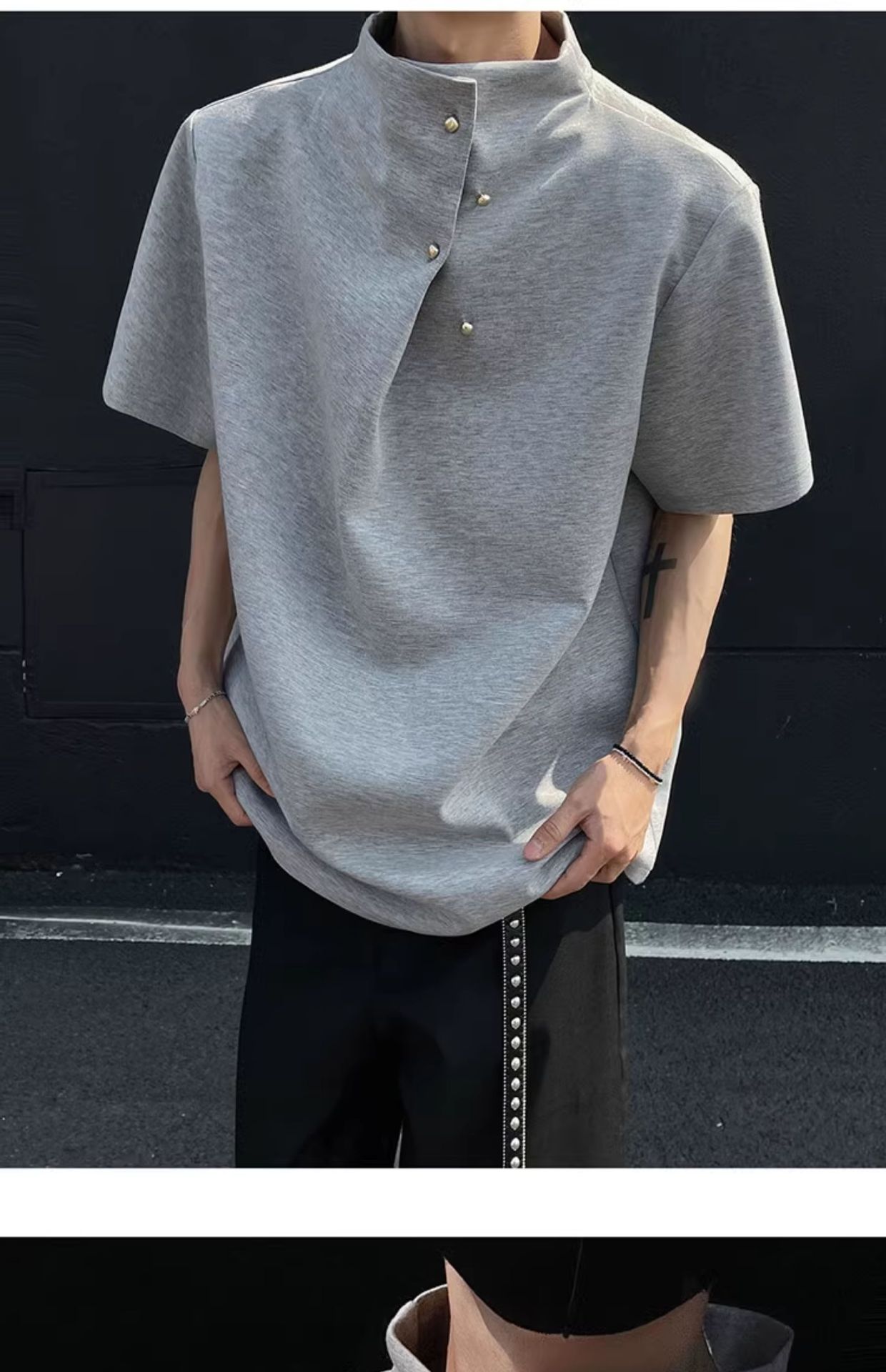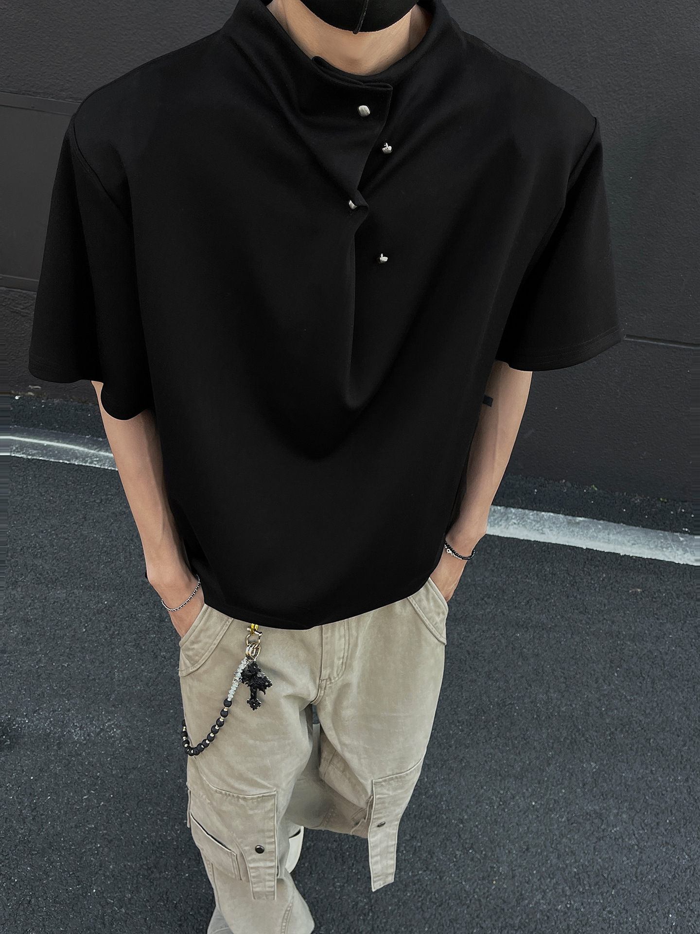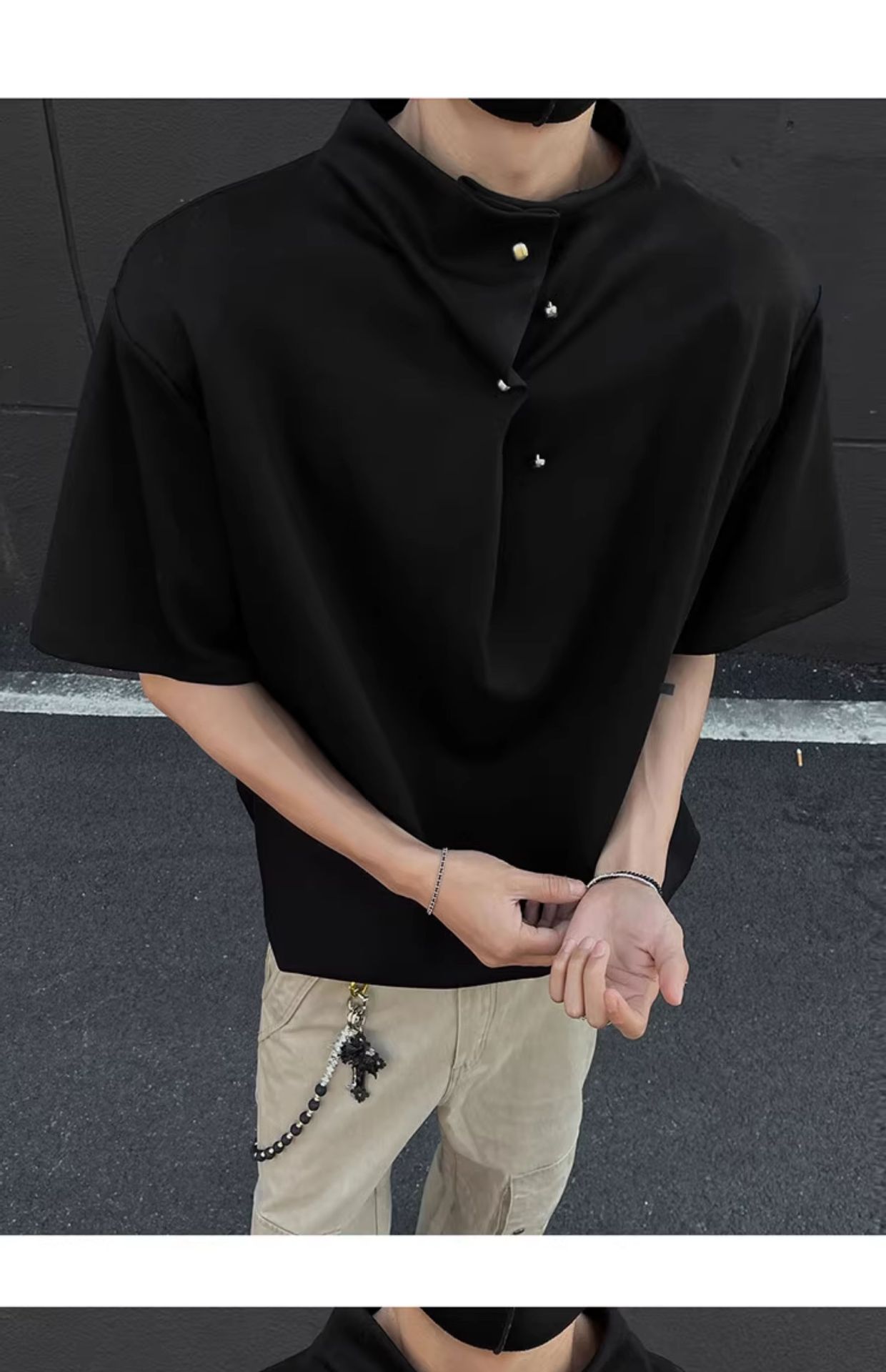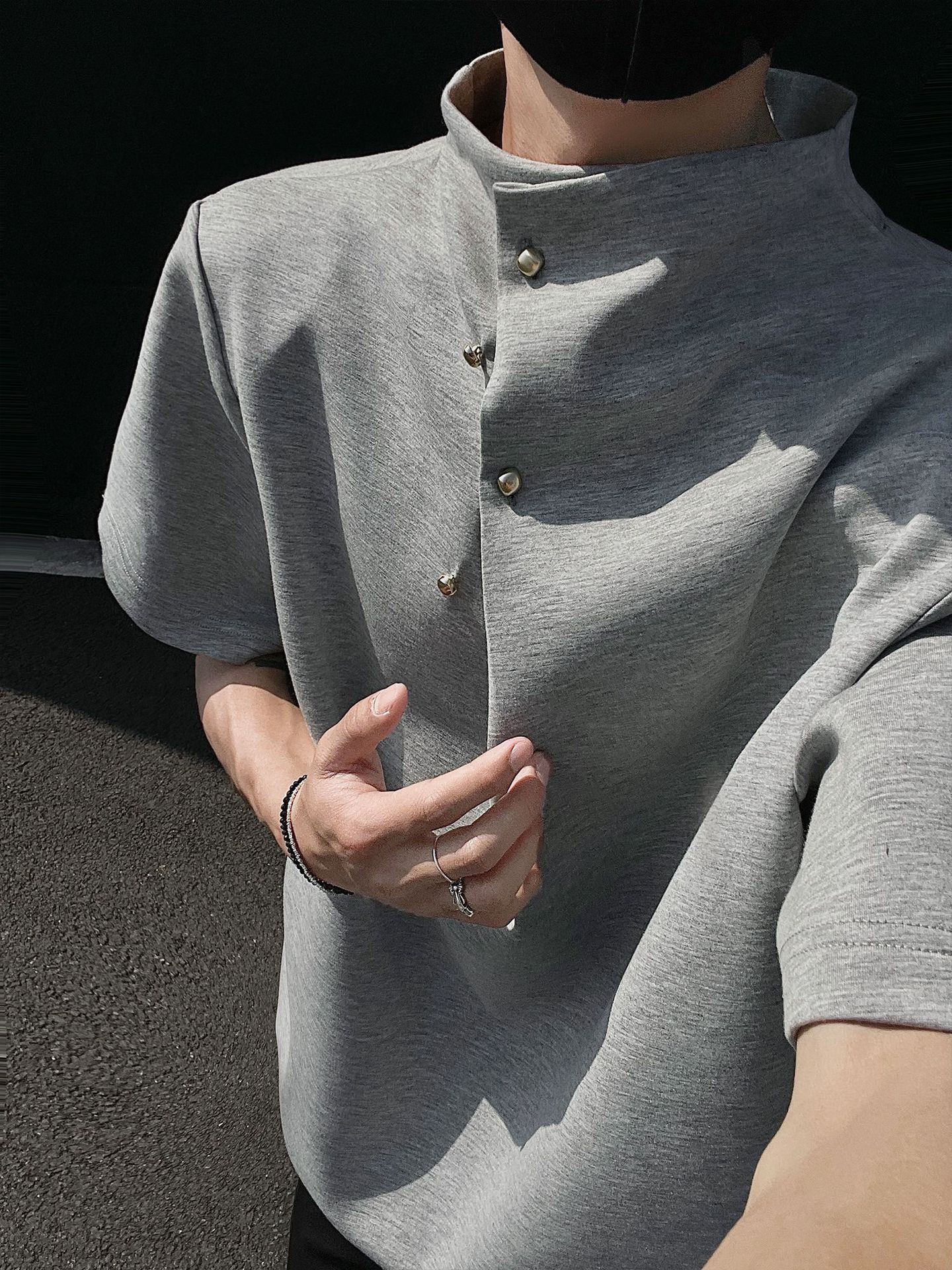 불규칙한 버튼 디자인 센스 짧은 소매 티셔츠 남성 여름 미국 스타일 패션 무거운 패드 어깨 반 높은 칼라 반 소매