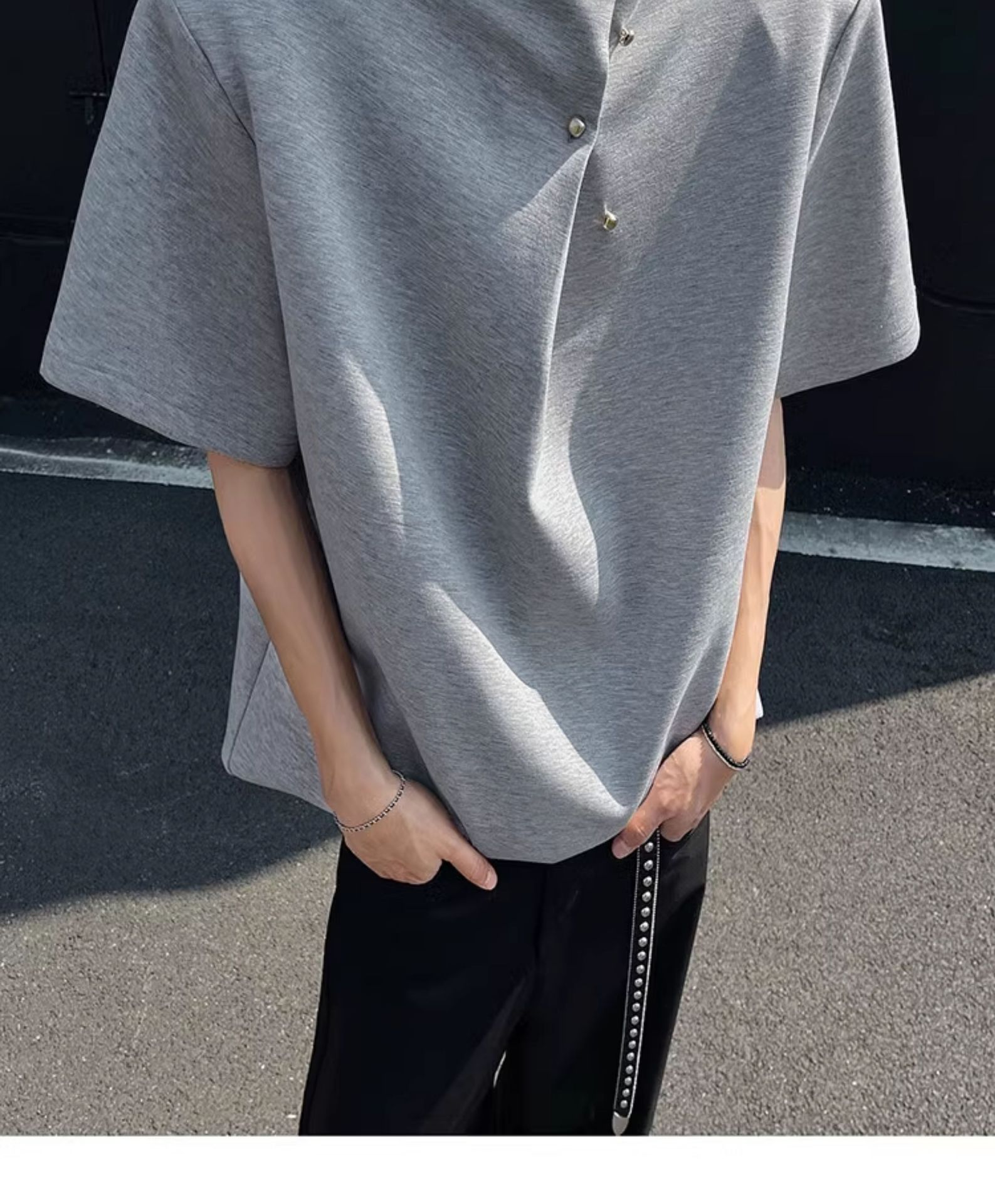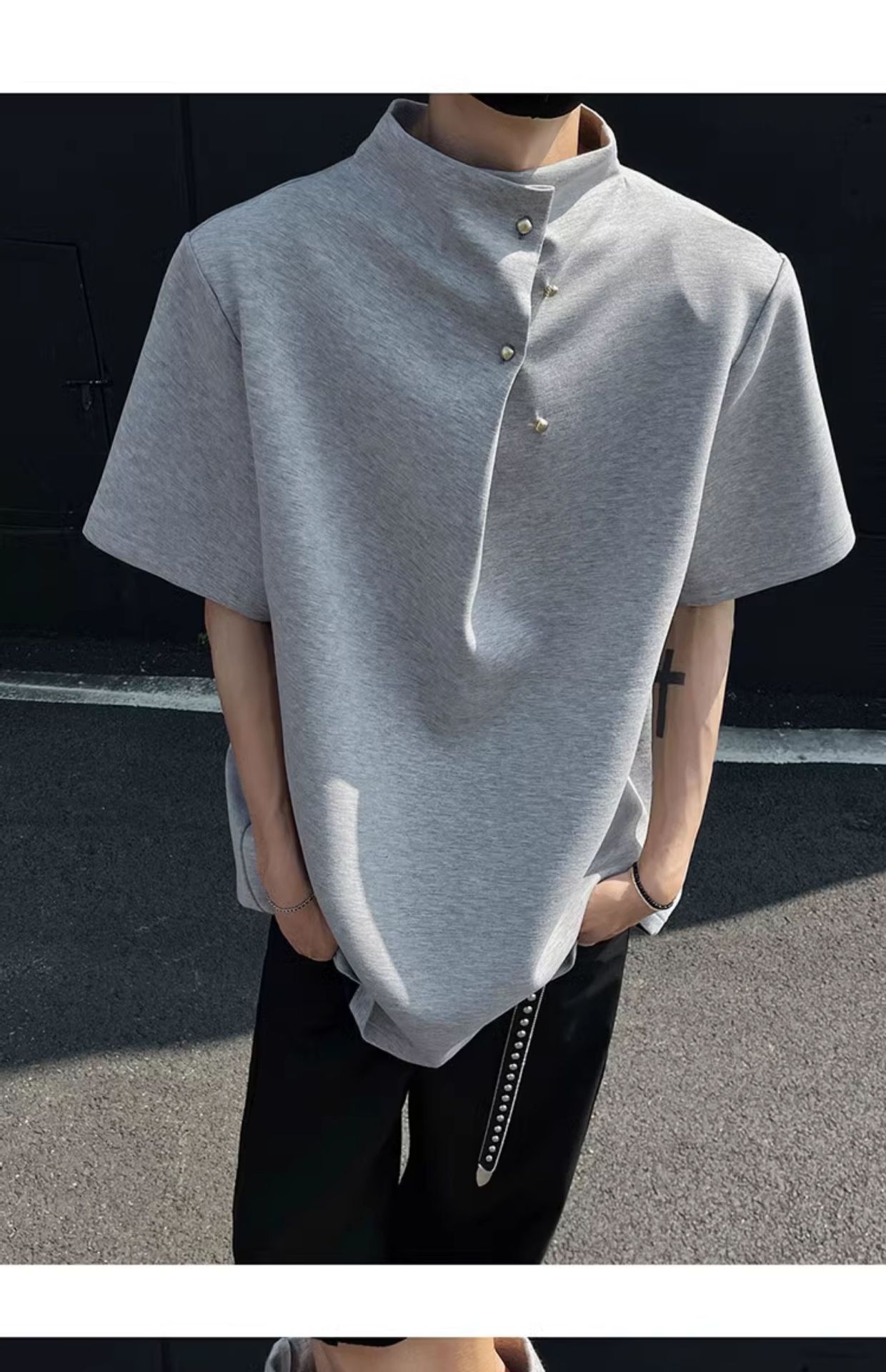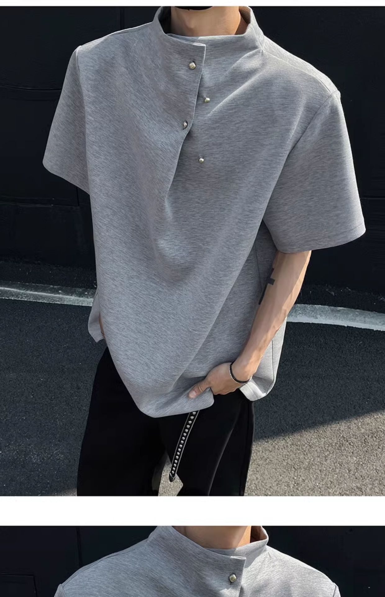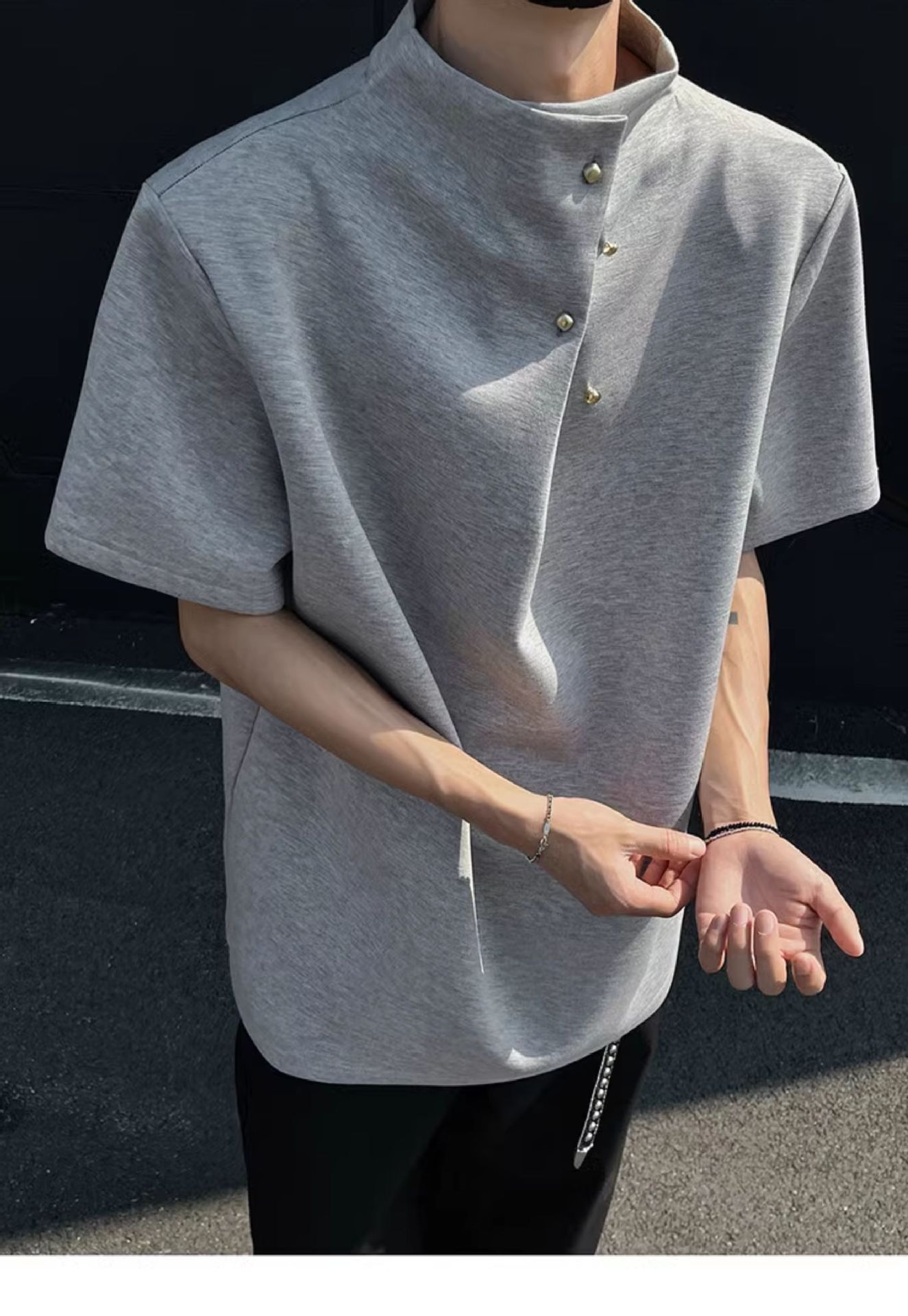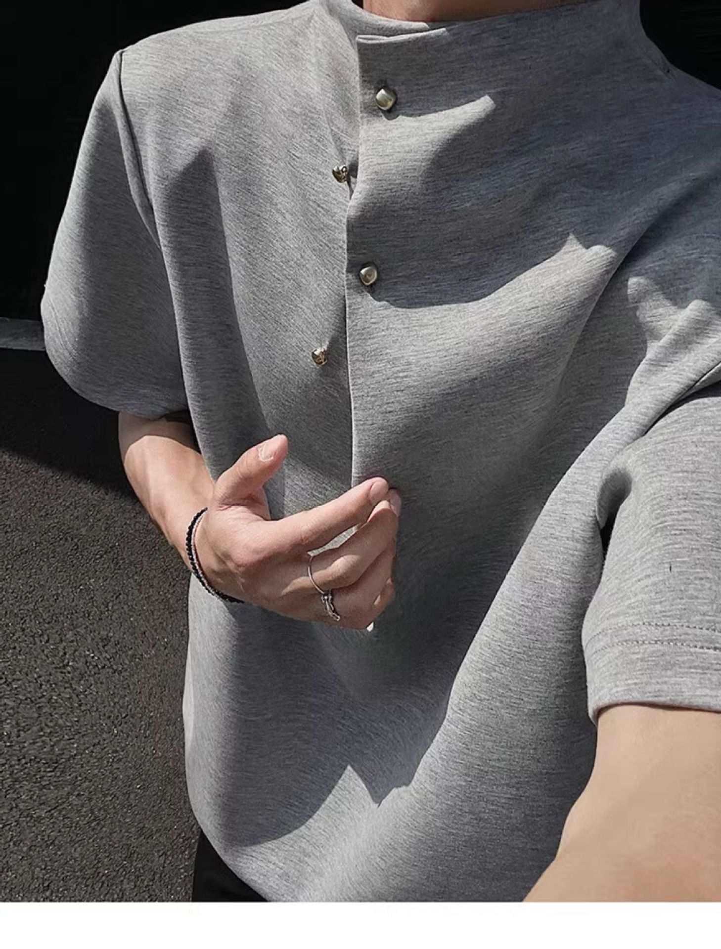 불규칙한 버튼 디자인 센스 짧은 소매 티셔츠 남성 여름 미국 스타일 패션 무거운 패드 어깨 반 높은 칼라 반 소매