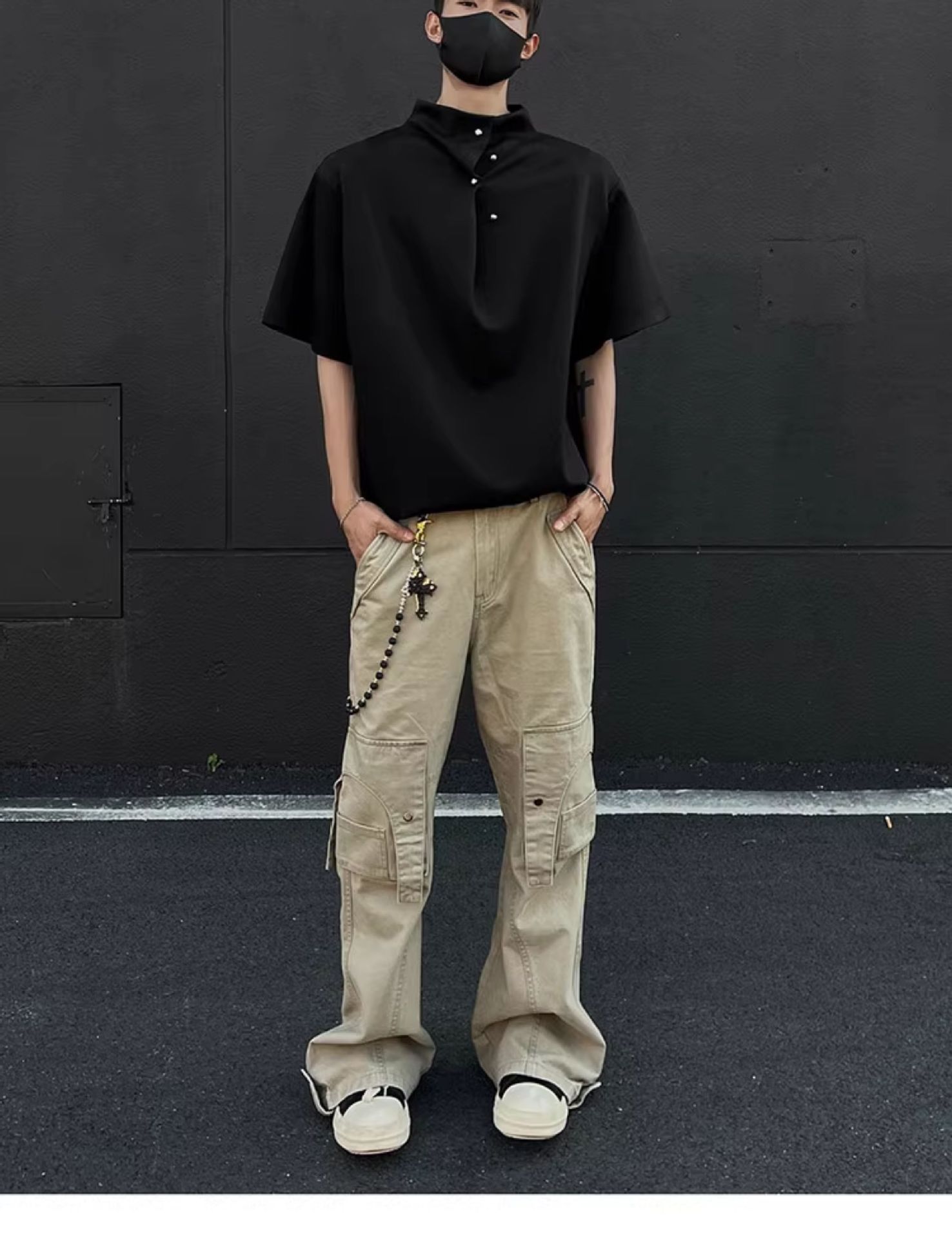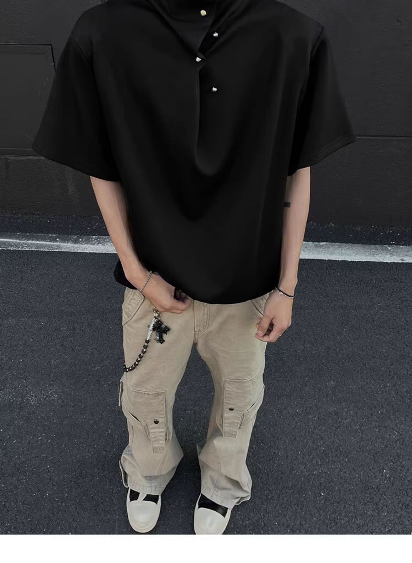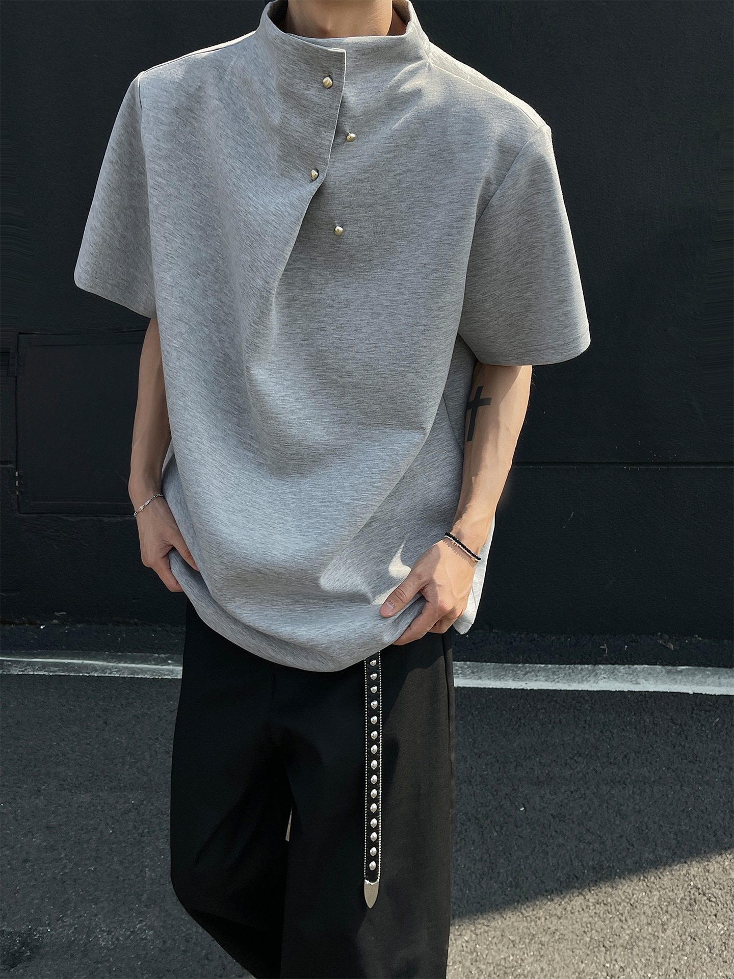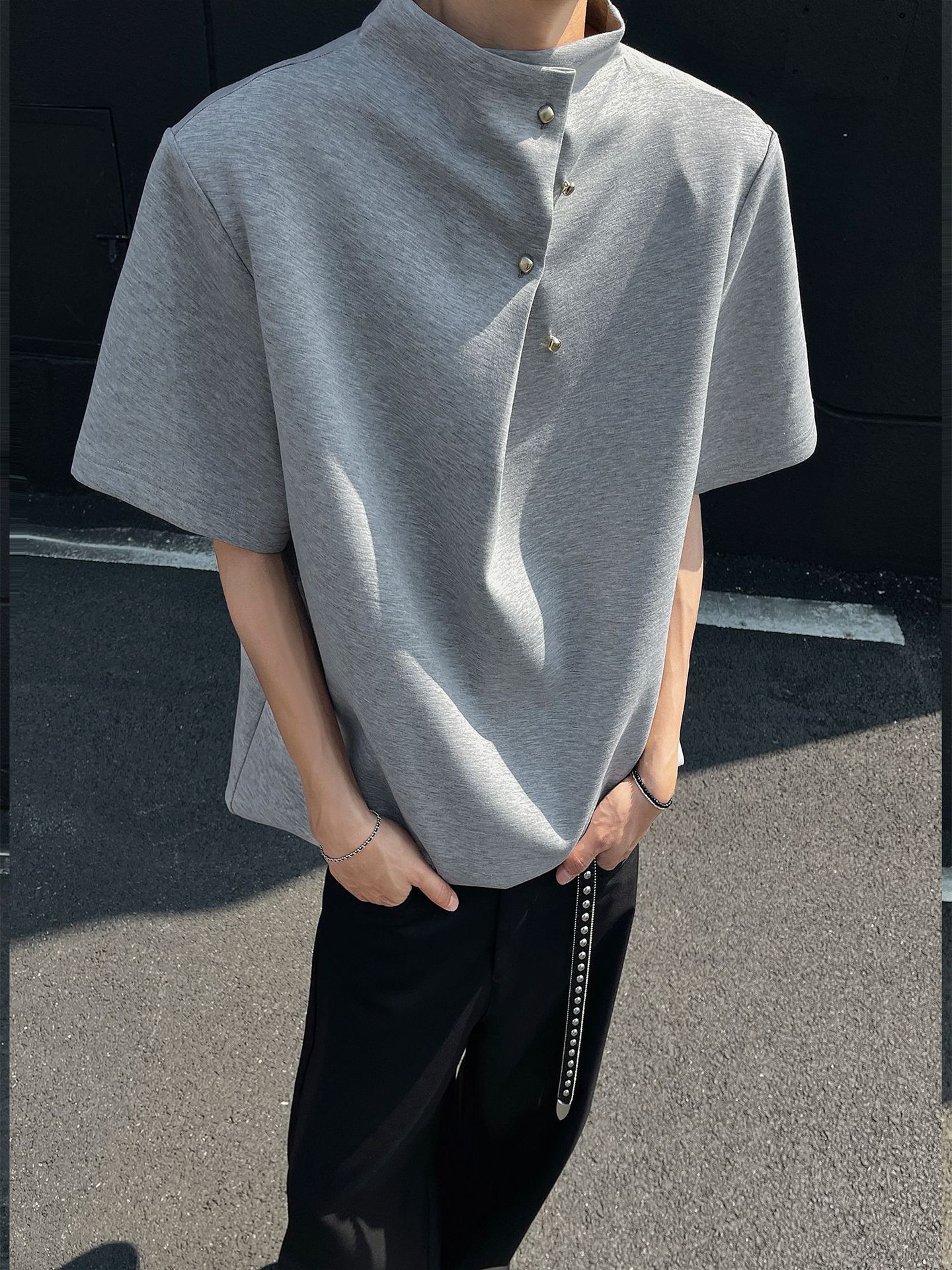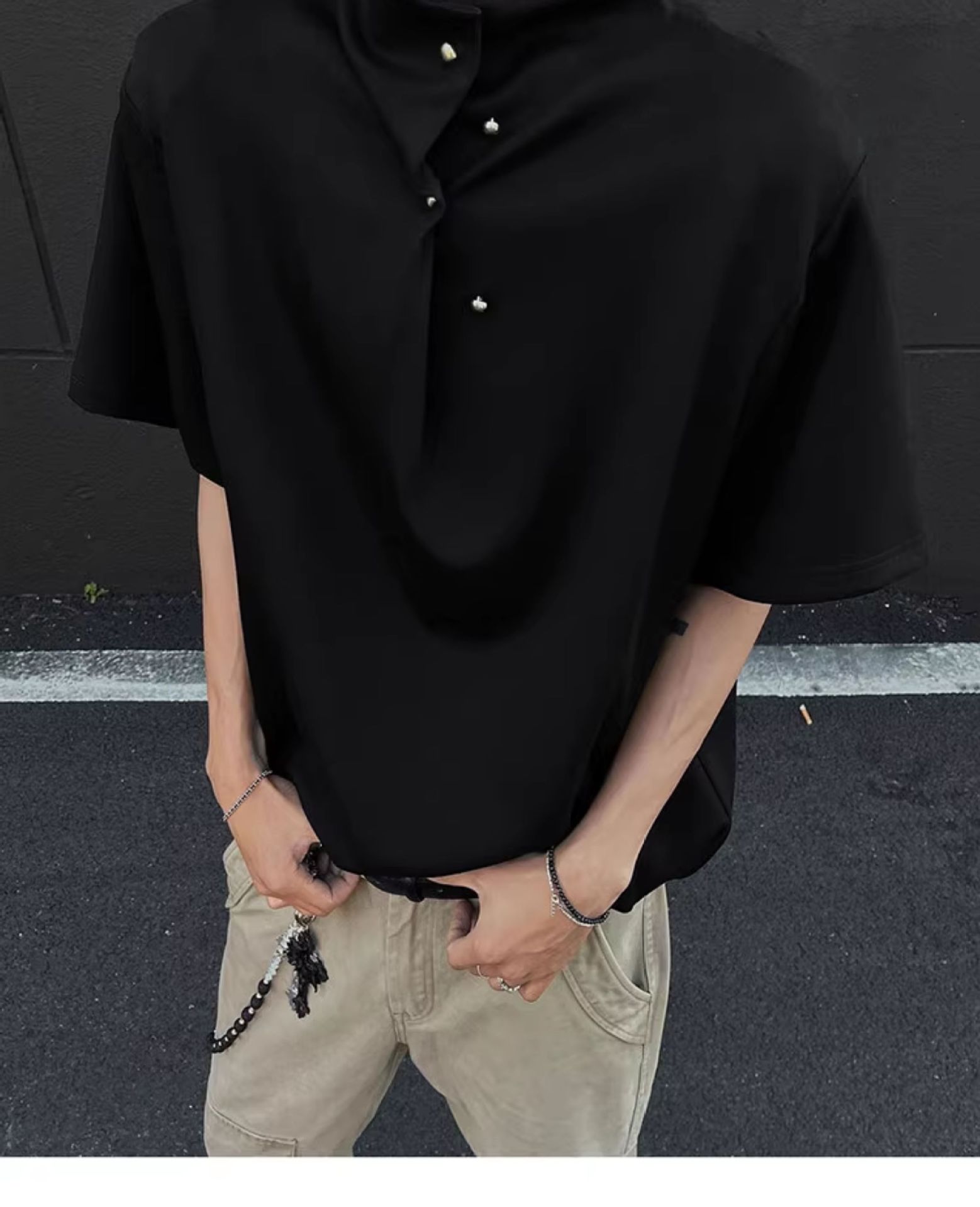 불규칙한 버튼 디자인 센스 짧은 소매 티셔츠 남성 여름 미국 스타일 패션 무거운 패드 어깨 반 높은 칼라 반 소매