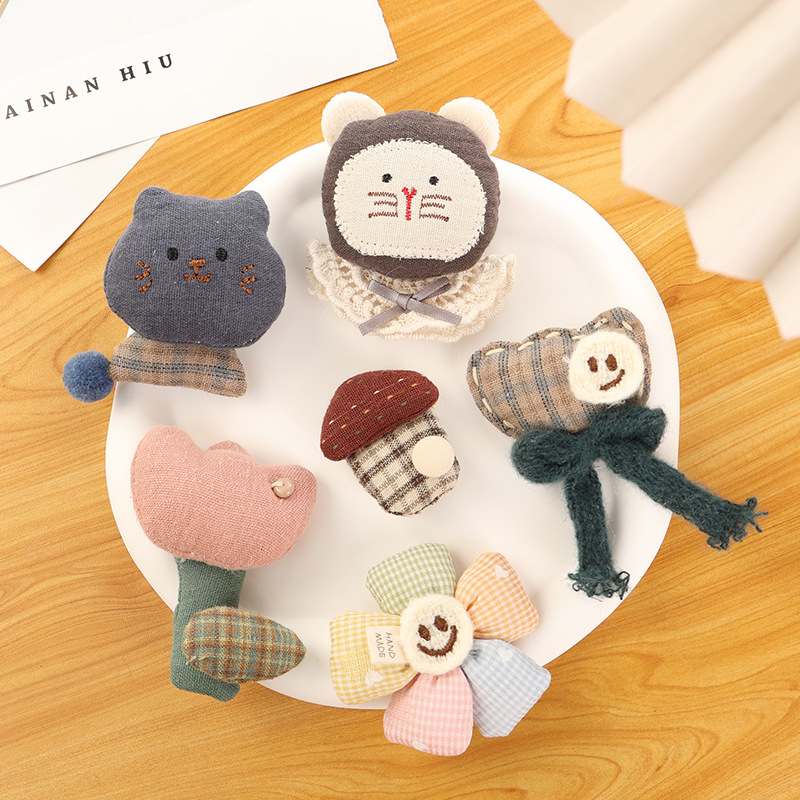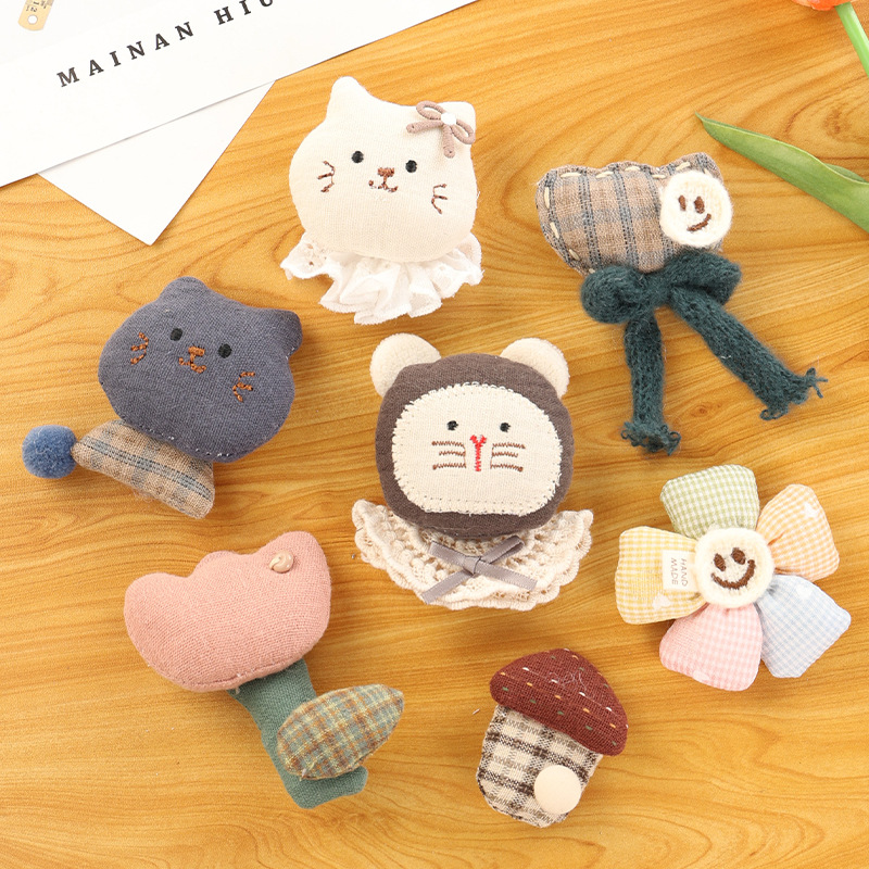 새로운 스타일의 패브릭 채워진 면화 동물 고양이 사랑 꽃 어린이 머리핀 펜던트 브로치 쥬얼리 액세서리 의류 액세서리