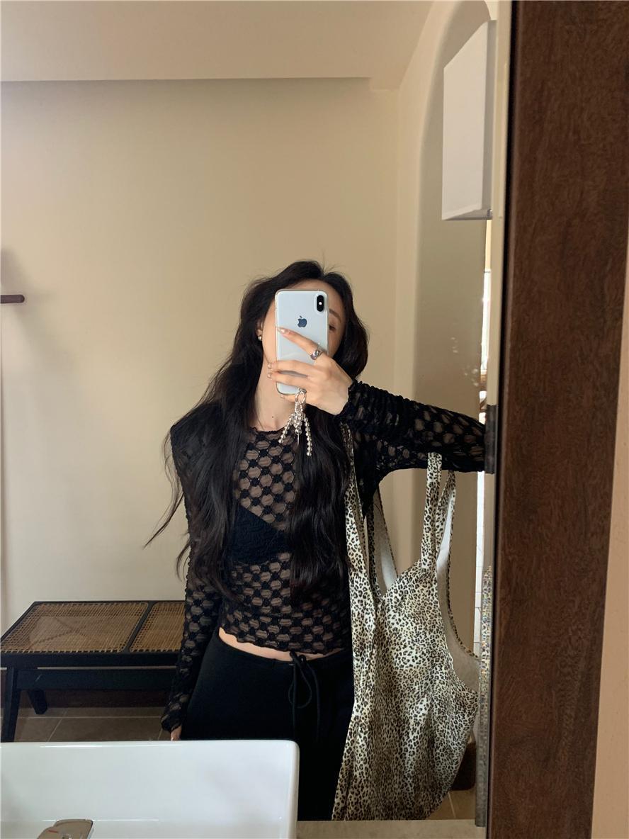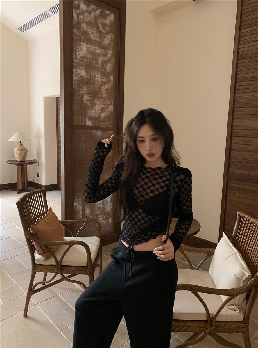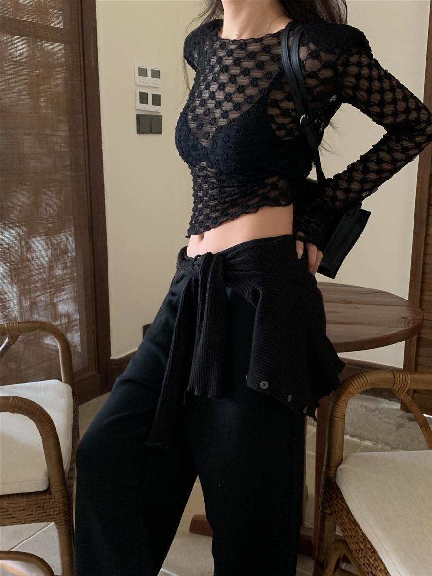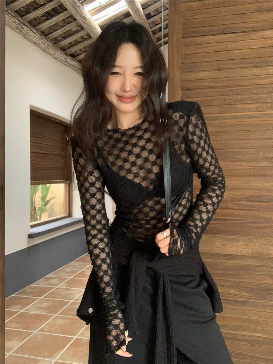 메쉬 시스루 블랙 라운드 넥 오른쪽 어깨 티셔츠 여성 여름 슬림핏 틈새 슬리밍 순수한 욕망 긴팔 시크 탑