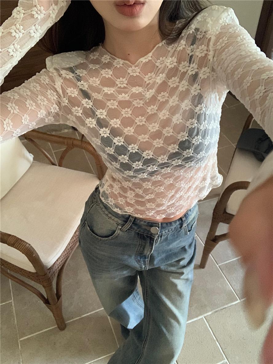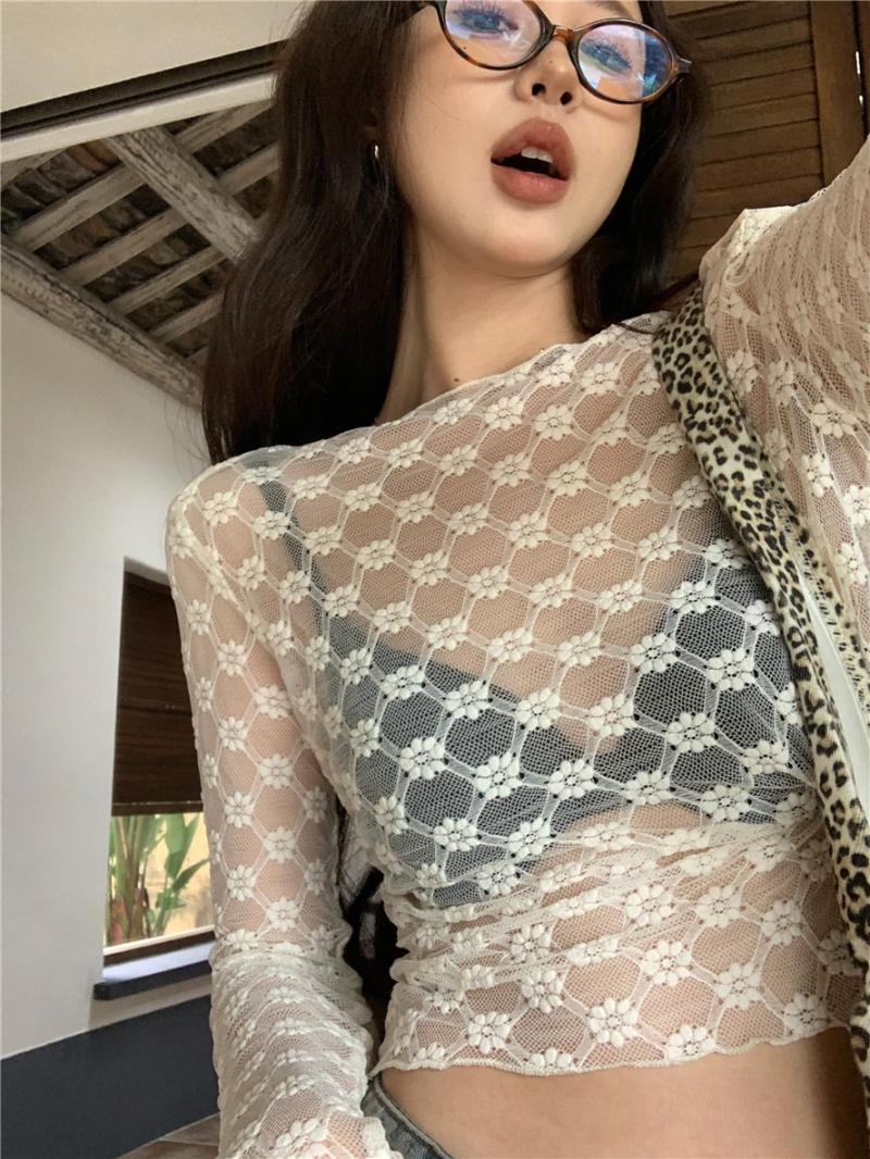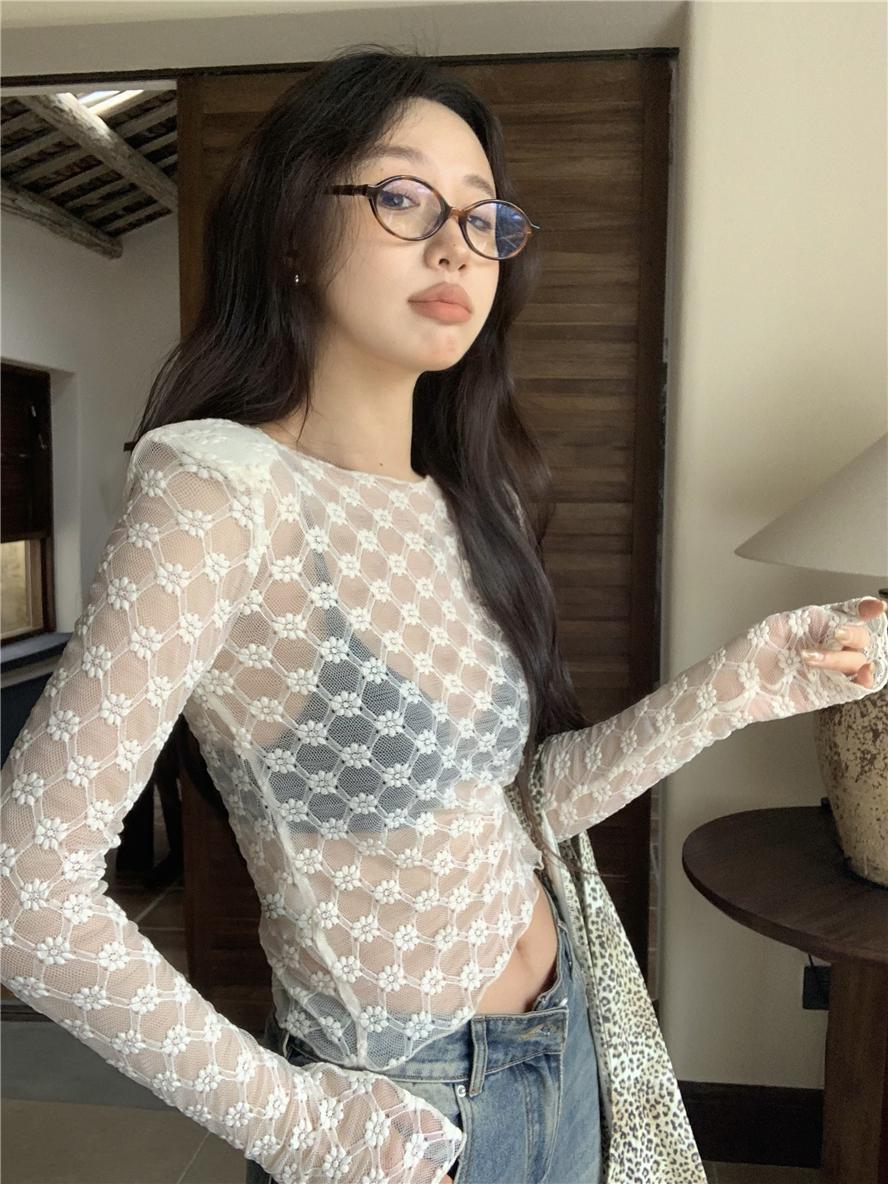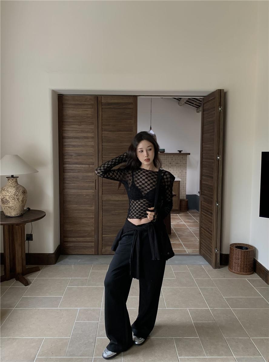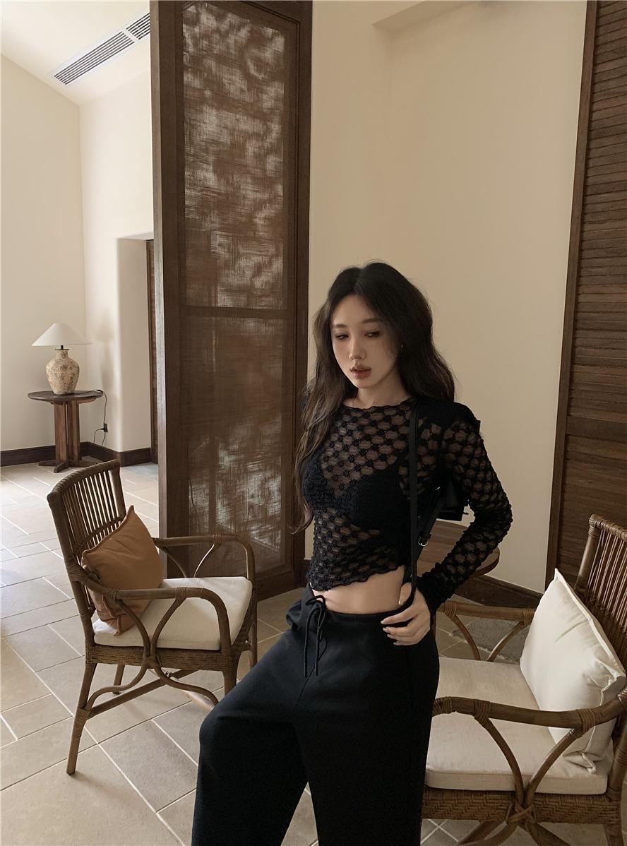 메쉬 시스루 블랙 라운드 넥 오른쪽 어깨 티셔츠 여성 여름 슬림핏 틈새 슬리밍 순수한 욕망 긴팔 시크 탑
