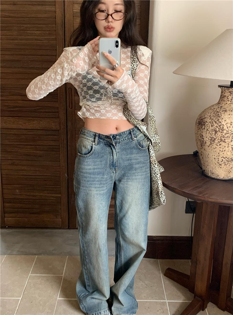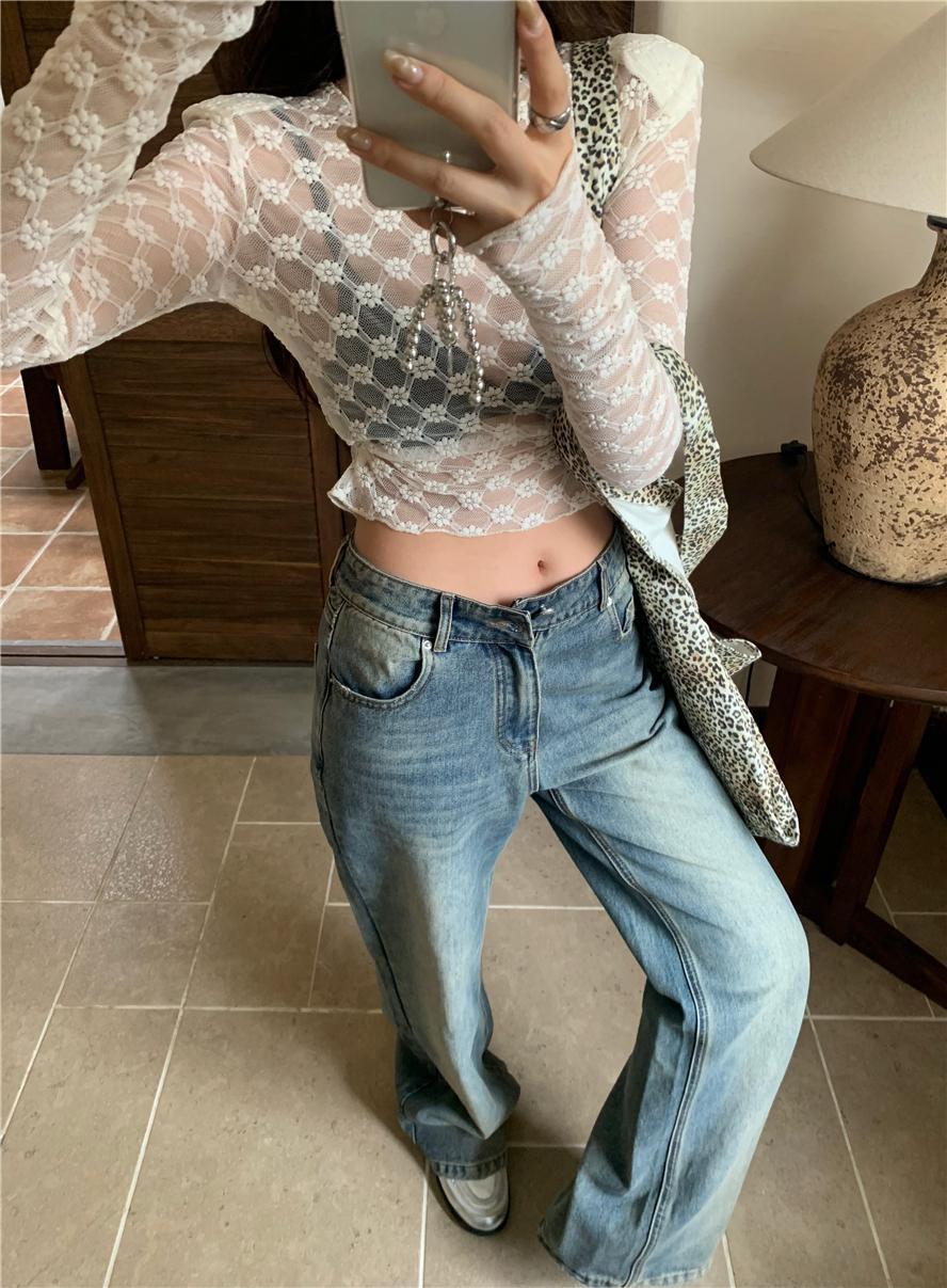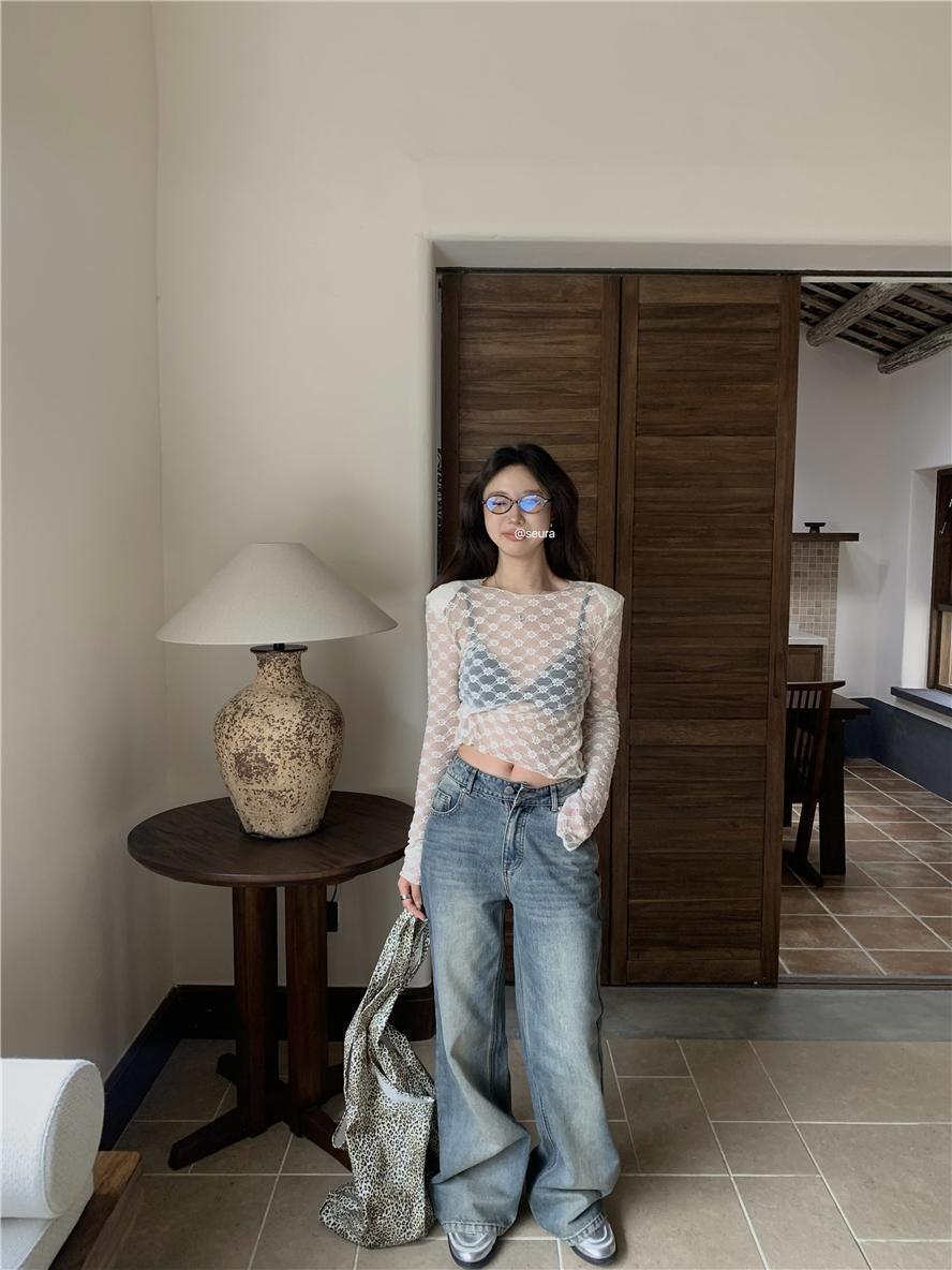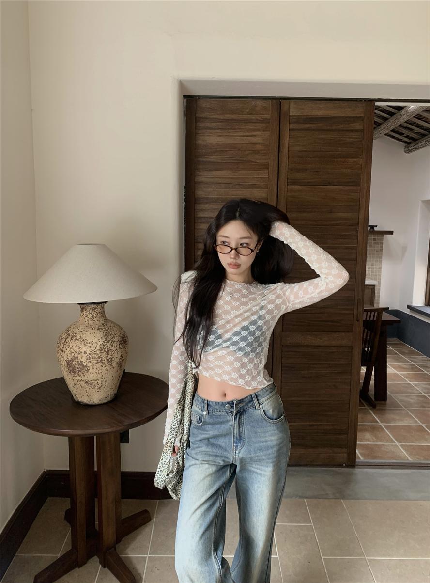 메쉬 시스루 블랙 라운드 넥 오른쪽 어깨 티셔츠 여성 여름 슬림핏 틈새 슬리밍 순수한 욕망 긴팔 시크 탑