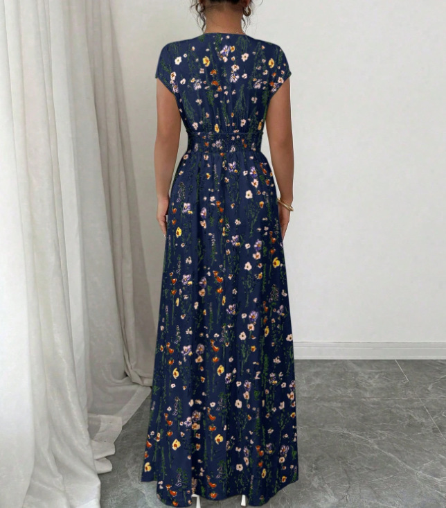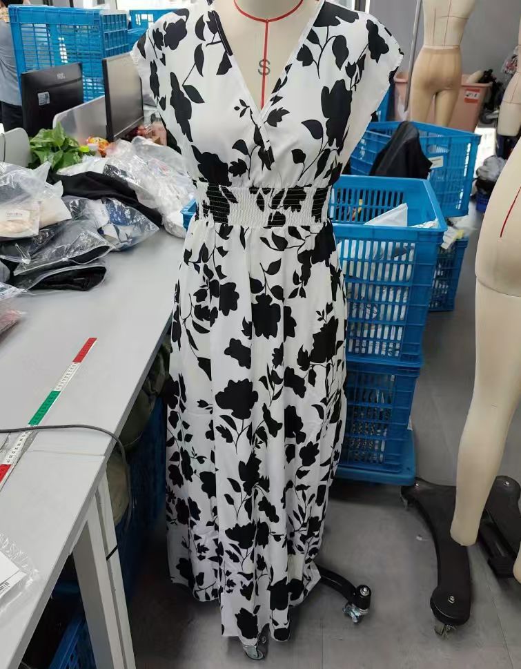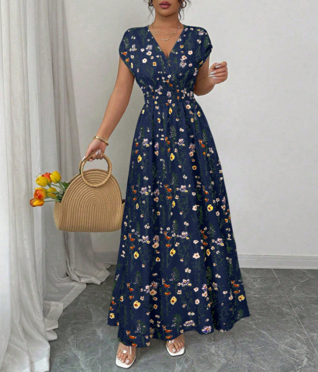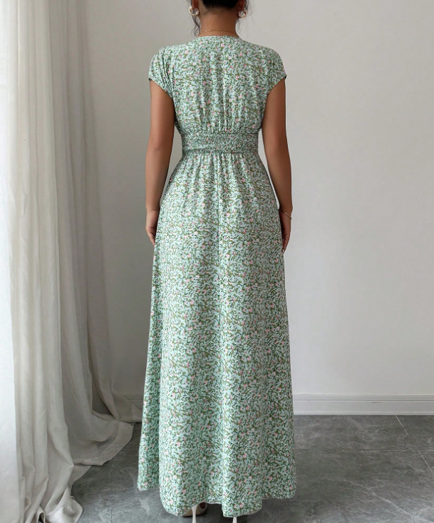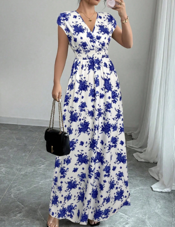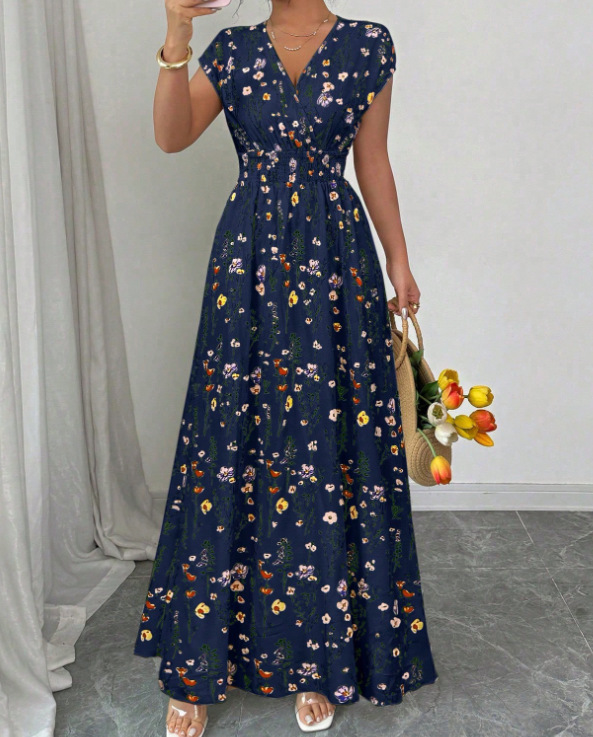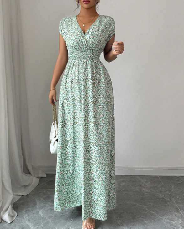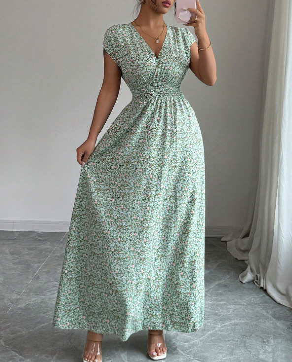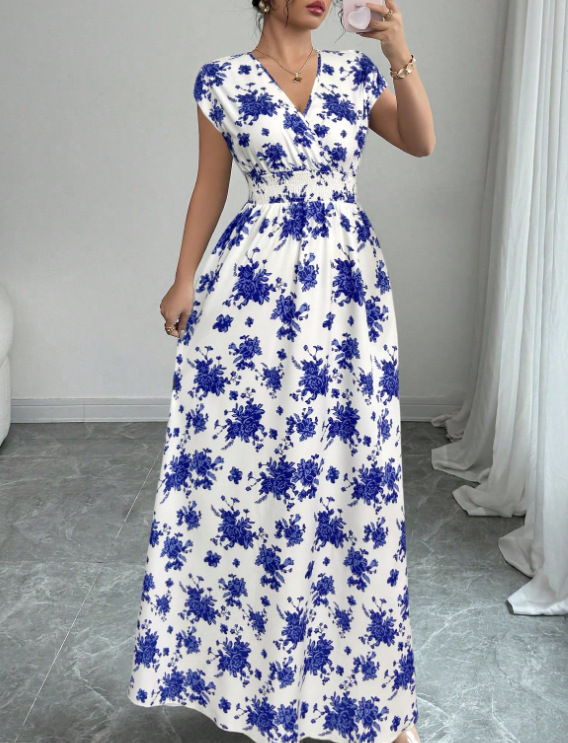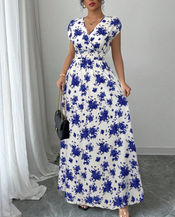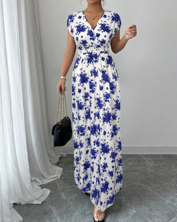 반팔 레이스 업 원피스 아마존 새로운 인쇄 된 V-목 긴 원피스 국경 여름 허리 여성복