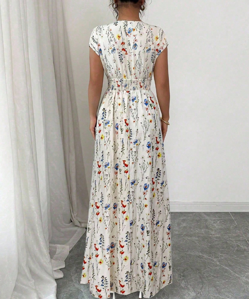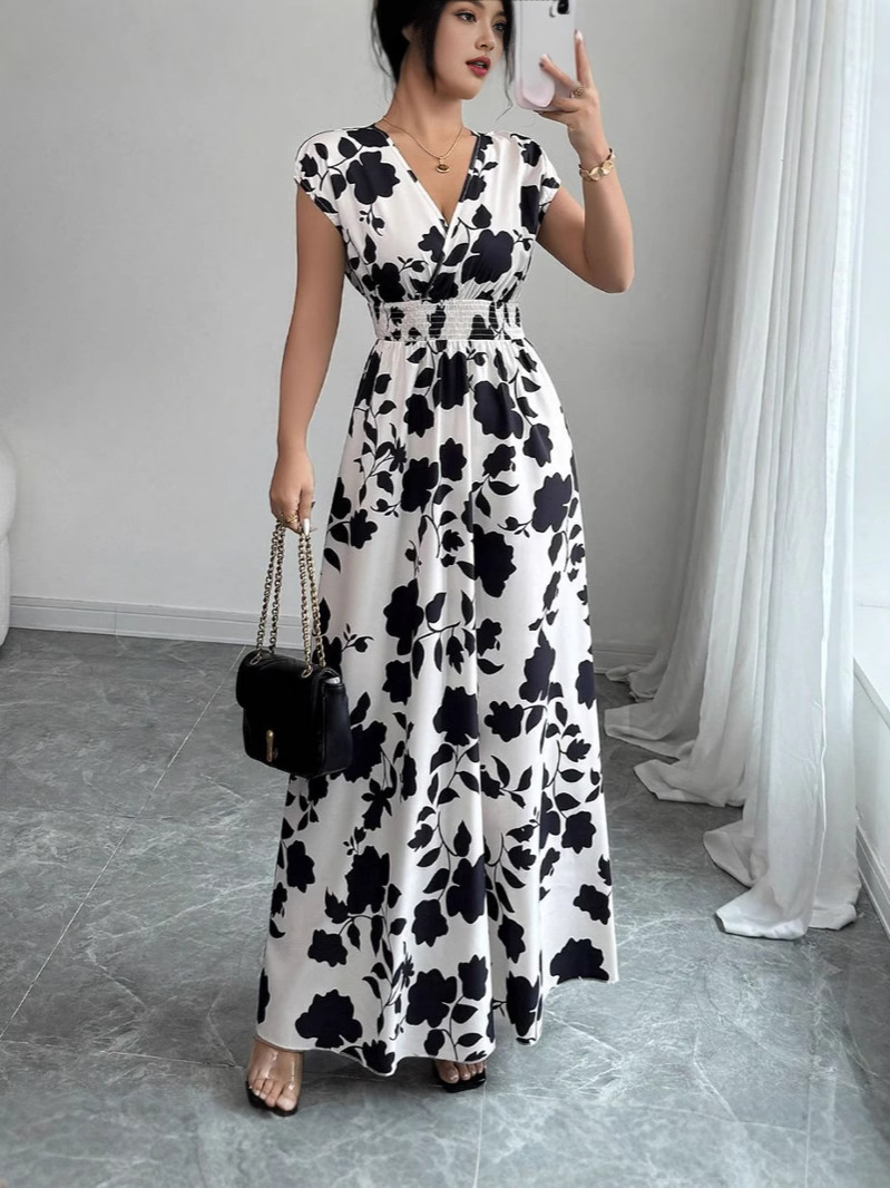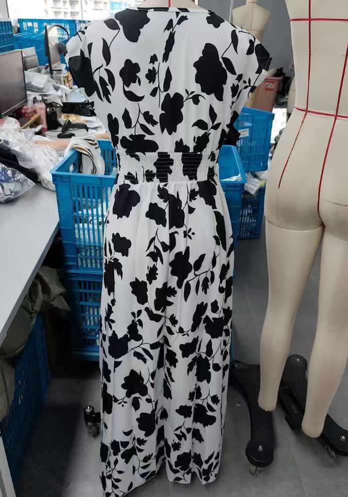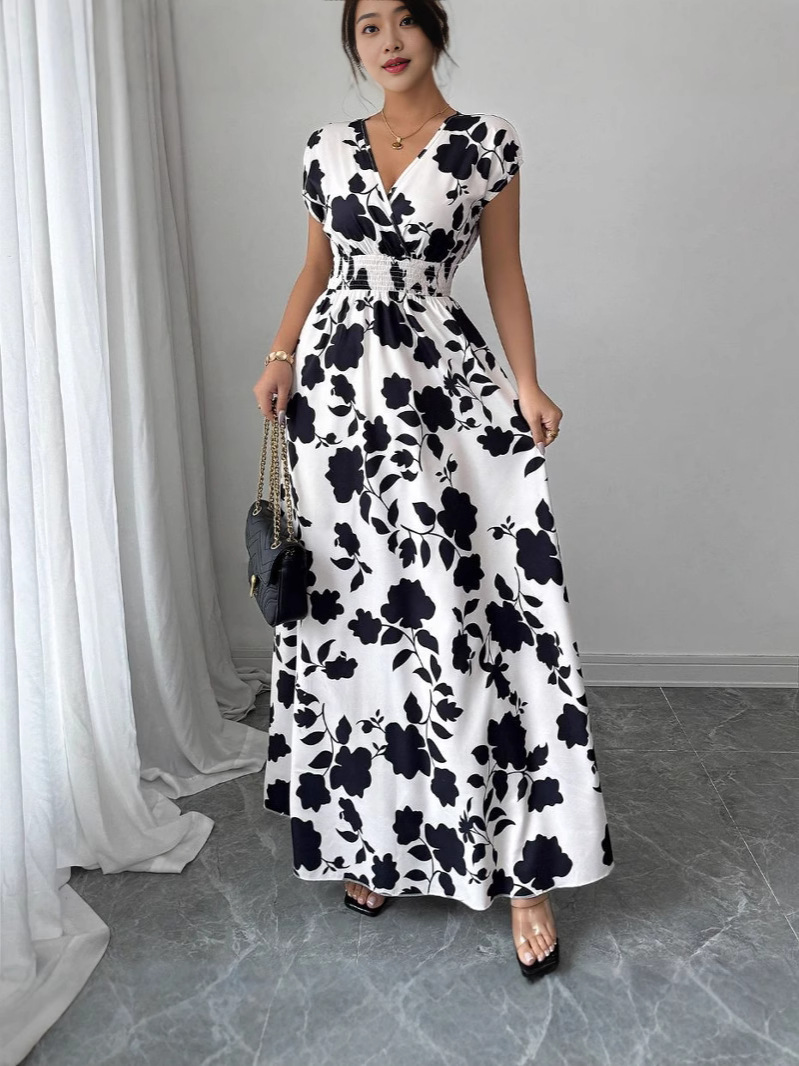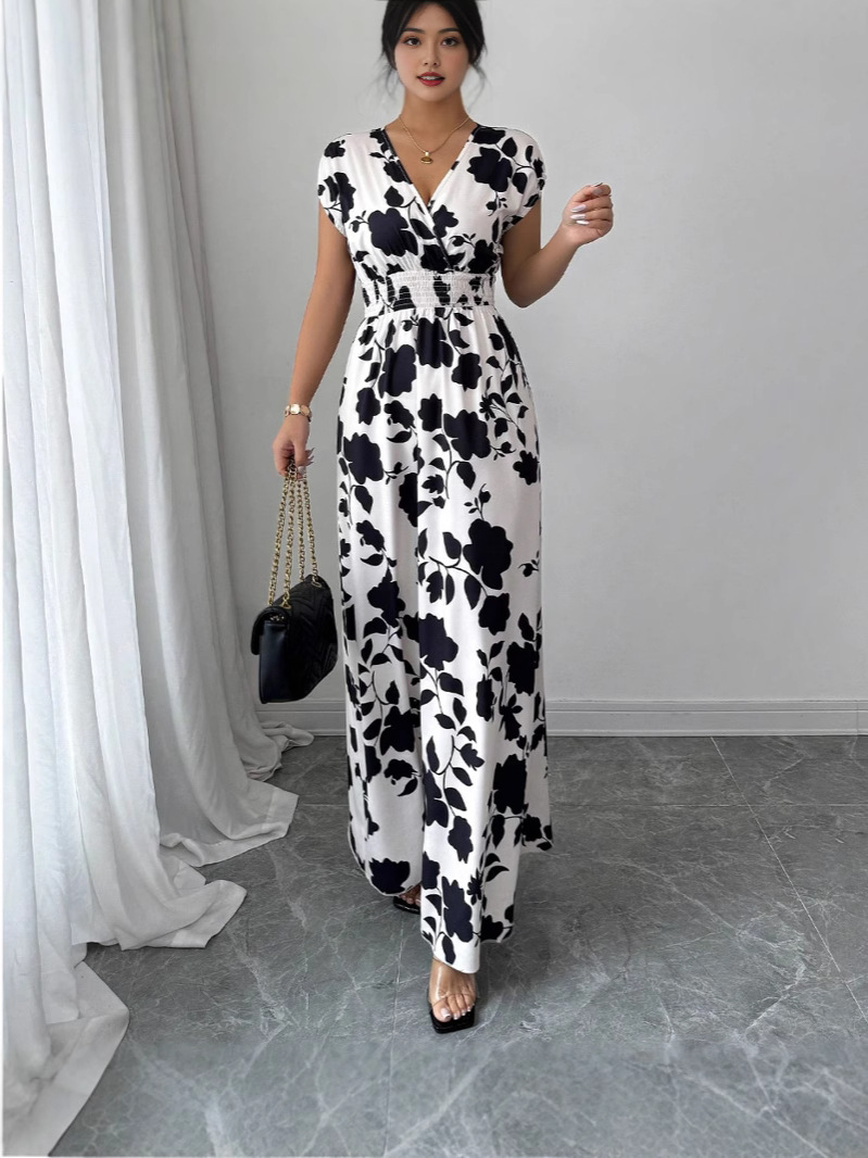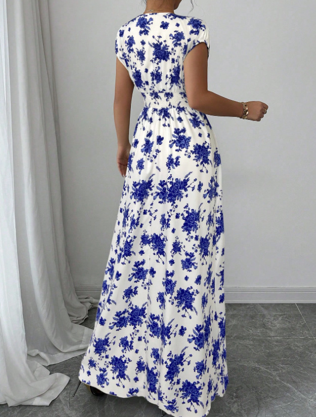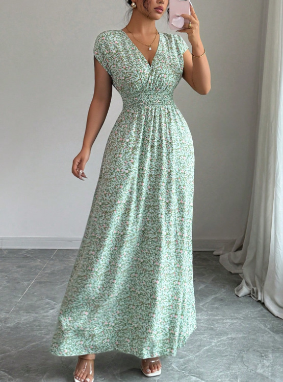 반팔 레이스 업 원피스 아마존 새로운 인쇄 된 V-목 긴 원피스 국경 여름 허리 여성복