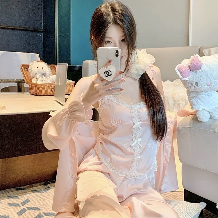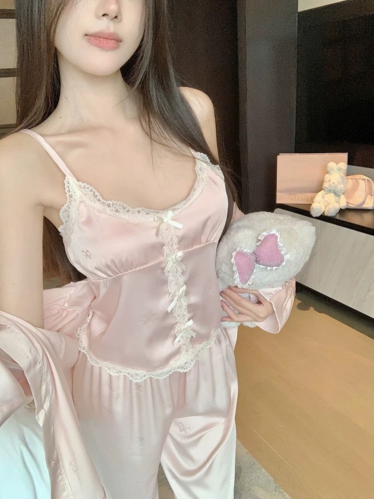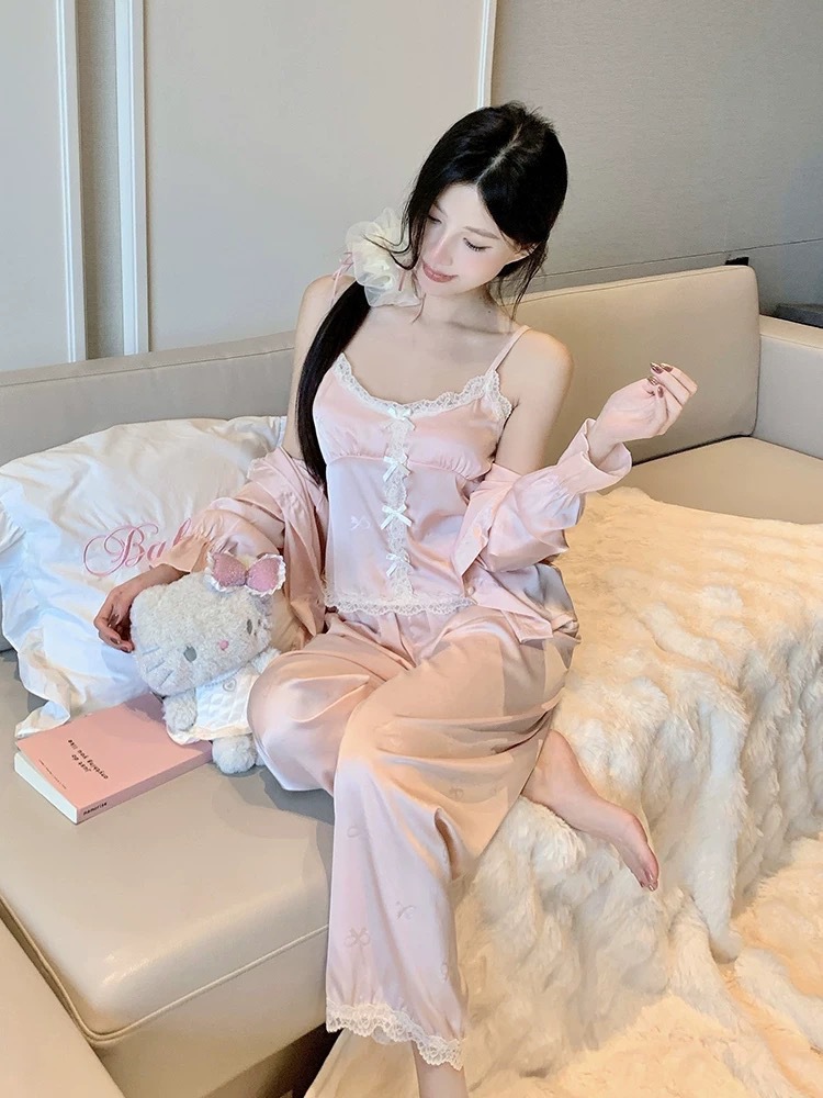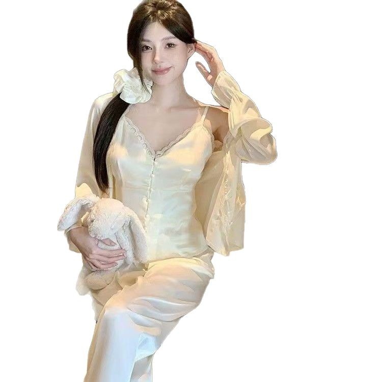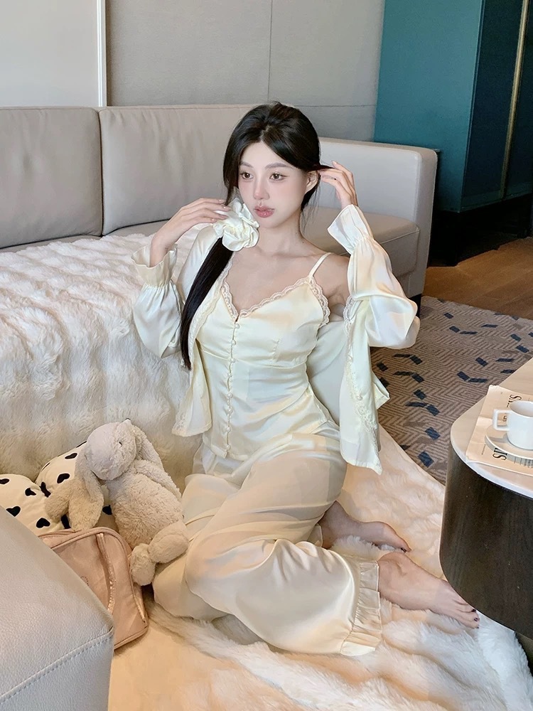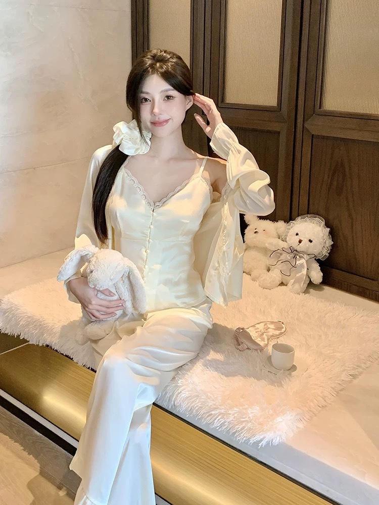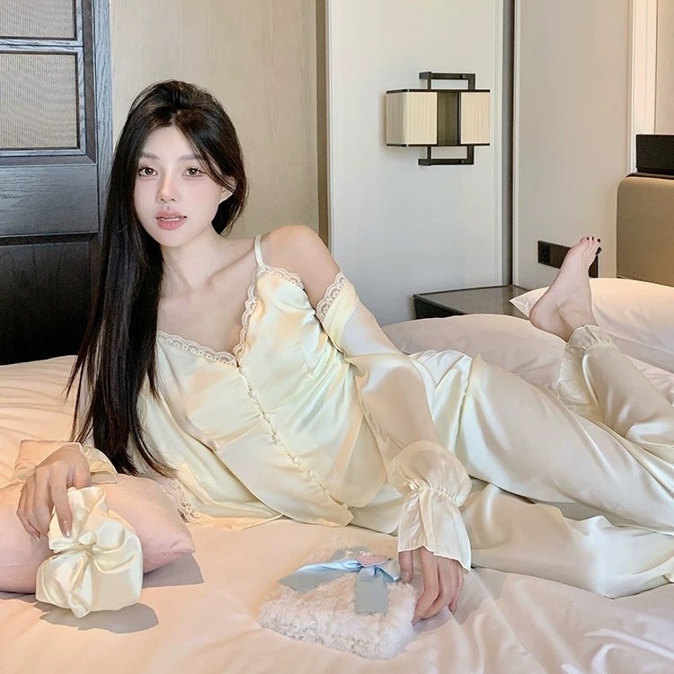 2025년 신형 여성용 아이스 실크 잠옷, 긴팔 바지, 고급스럽고 심플하고 편안하며 얇은 홈웨어 세트, 야외에서 착용 가능