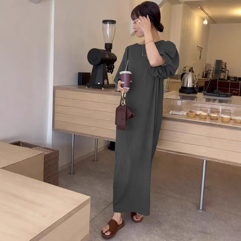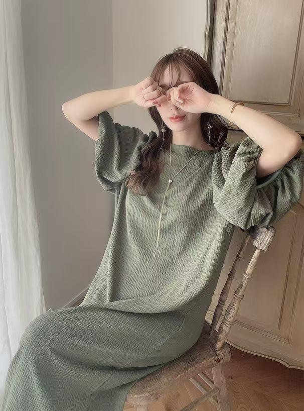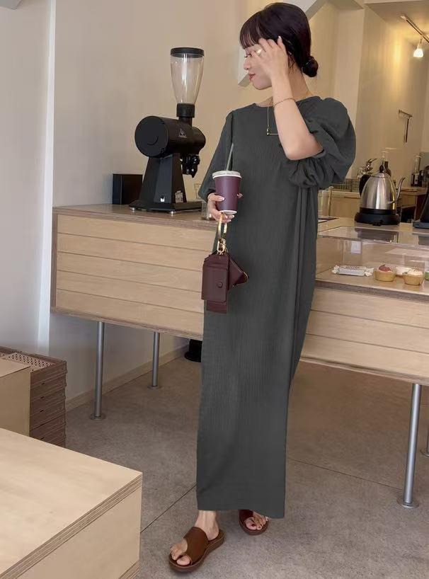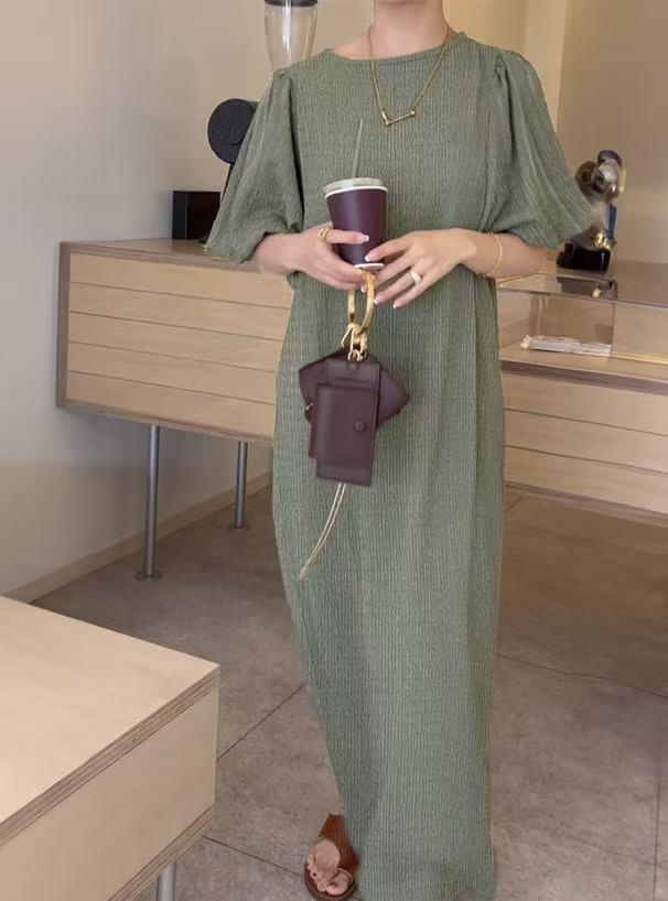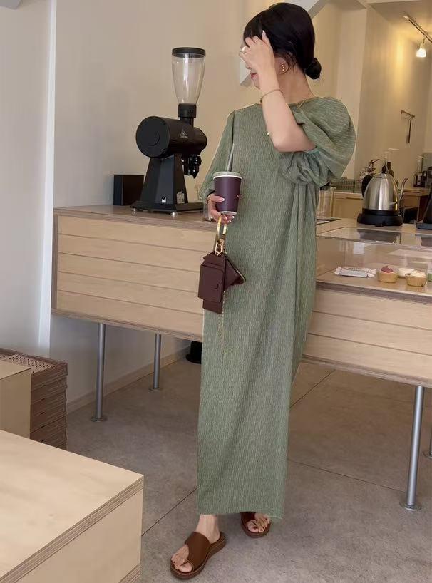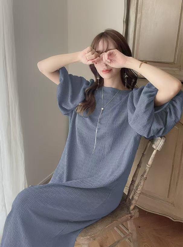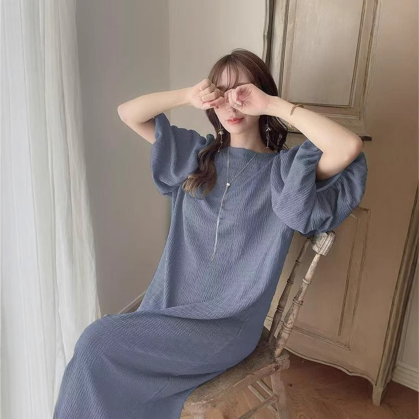 일본 한국 봄 여름 달콤한 느슨한 기질 비치 스커트 롱 스커트 퍼프 슬리브 반팔 라운드 넥 캐주얼 드레스 여성용
