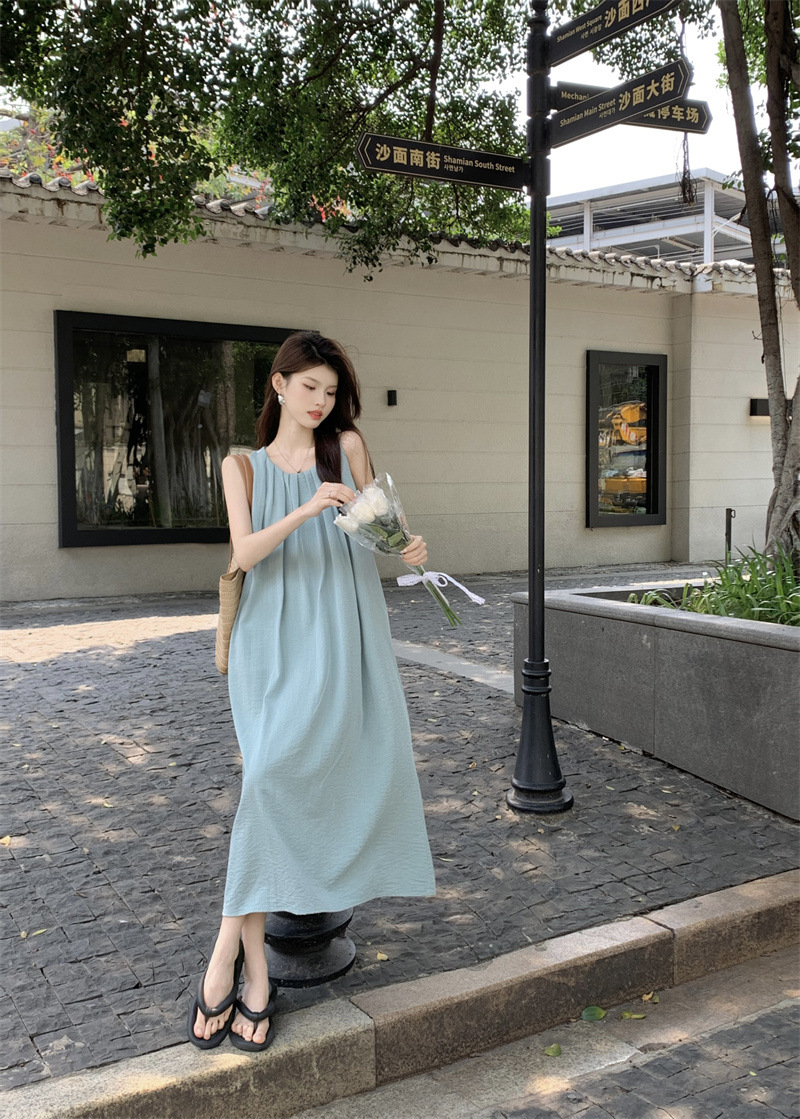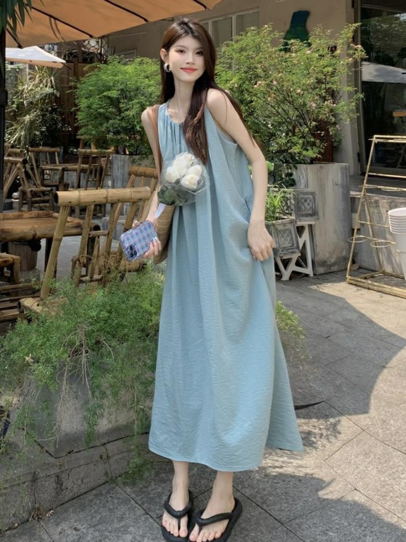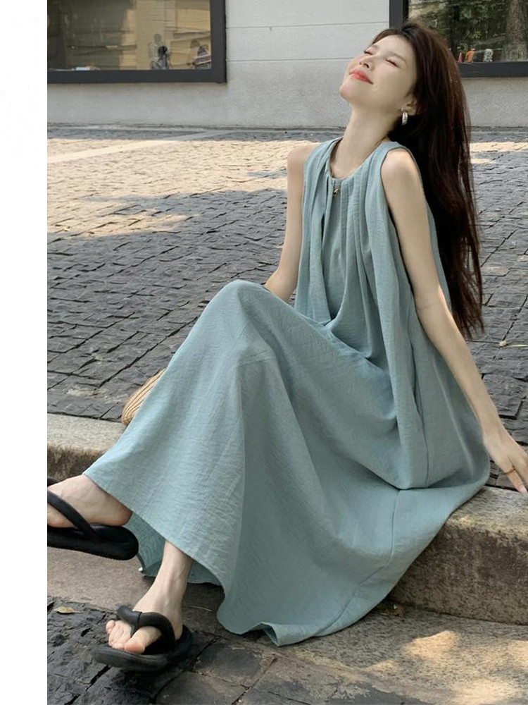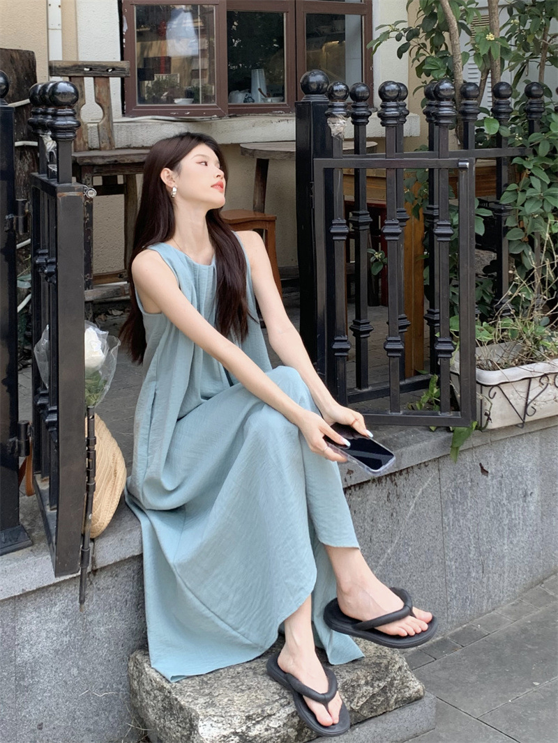 민소매 조끼 원피스 어린이 여름 2025 년 새 해변 휴가 하이 엔드 교수형 목 스트랩 비치 롱 원피스
