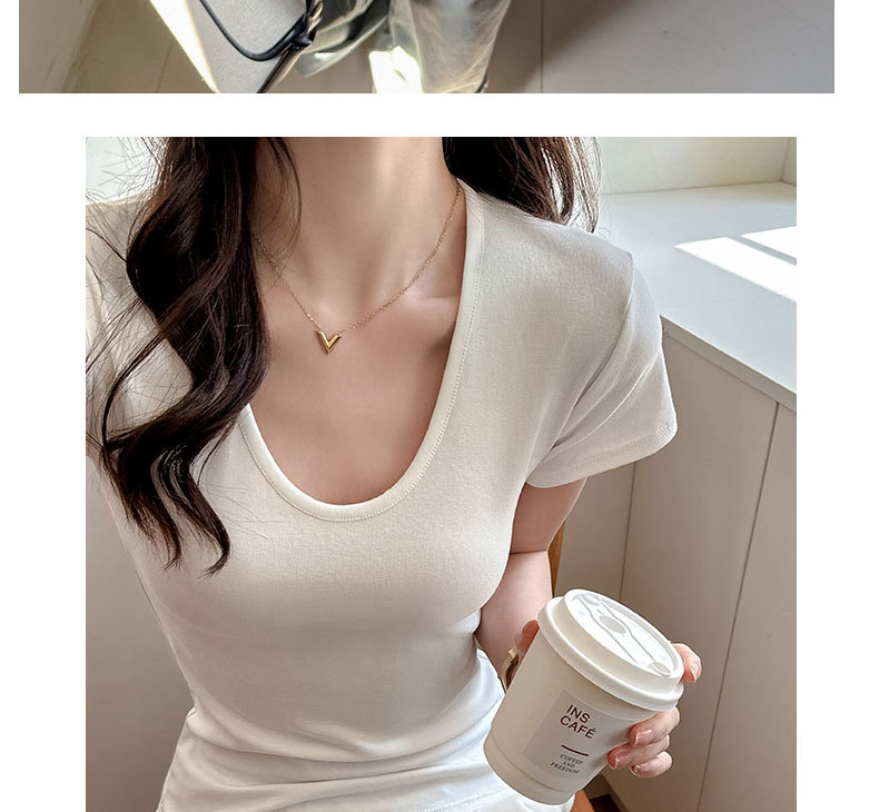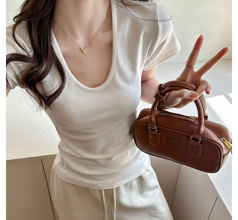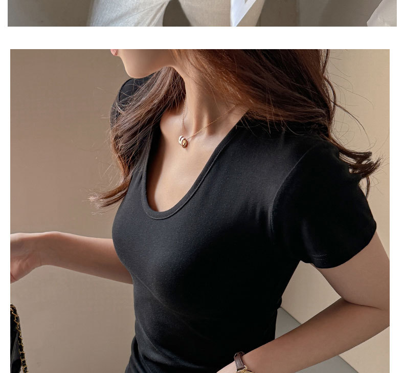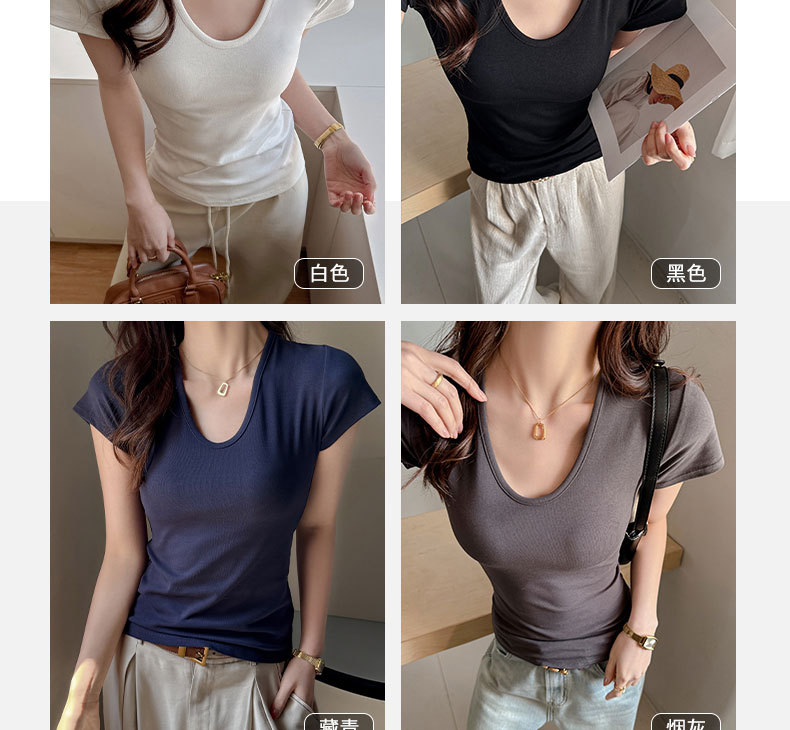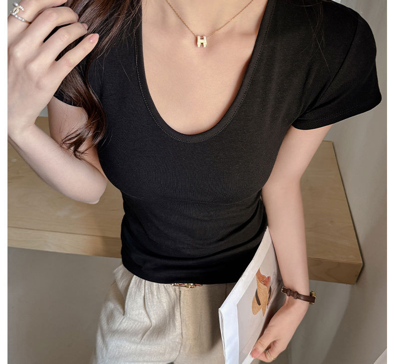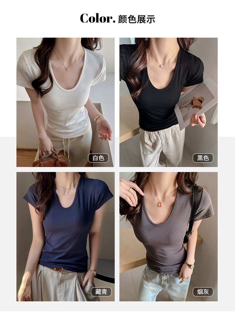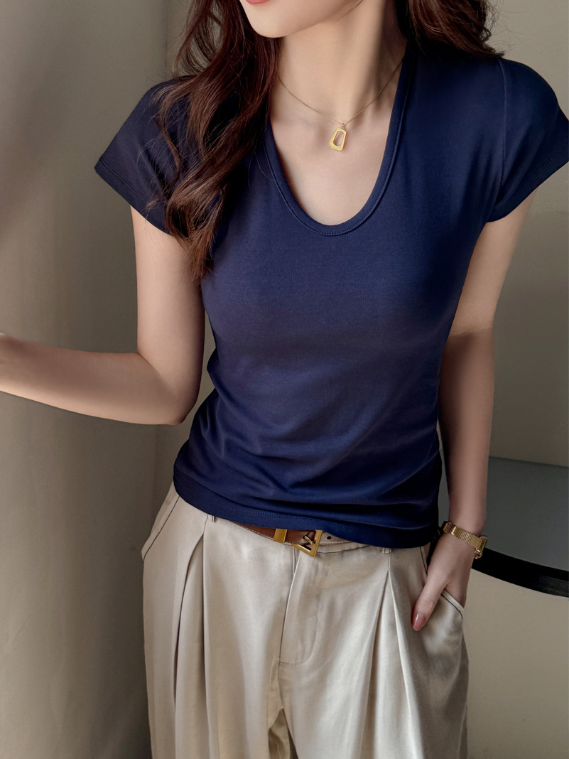 한국식 스파이스 걸스의 엄격한 선택 어깨 반팔 티셔츠 여성 하이 엔드 U-칼라 보토밍 이너 패션 웨스턴 스타일 퓨어 코튼 탑