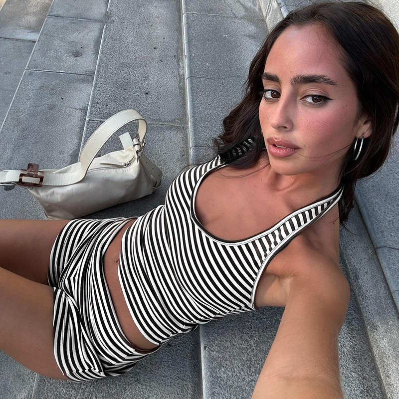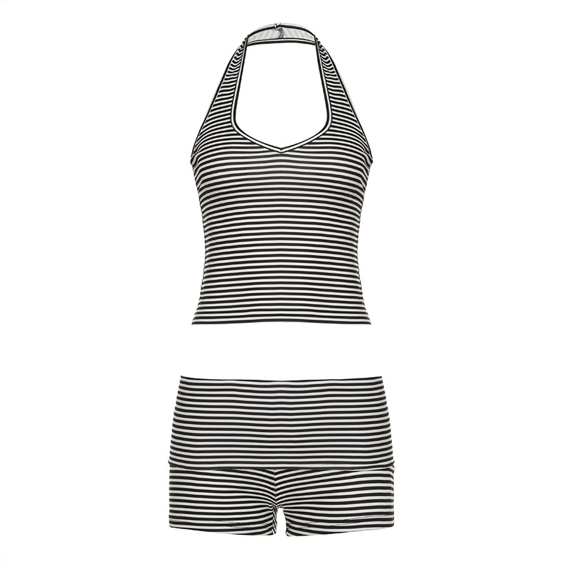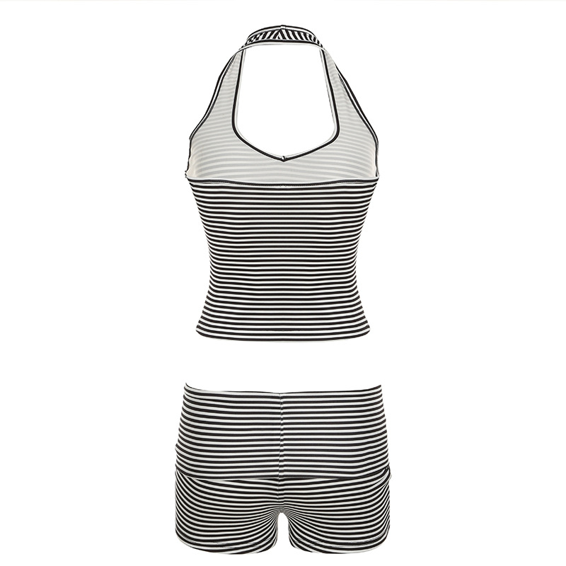 아메리칸 스트리트 스타일 스포츠 캐주얼 슈트 흑백 스트라이프 홀터넥 조끼 + 커프 반바지 여름 투피스 세트