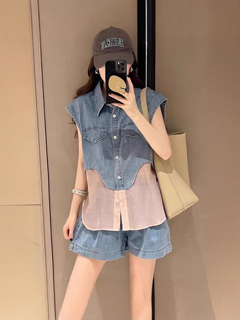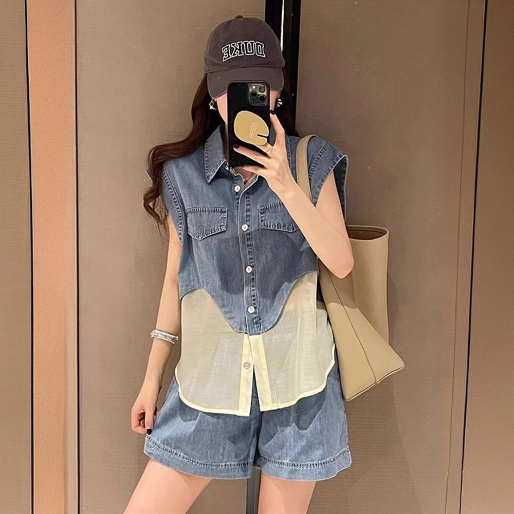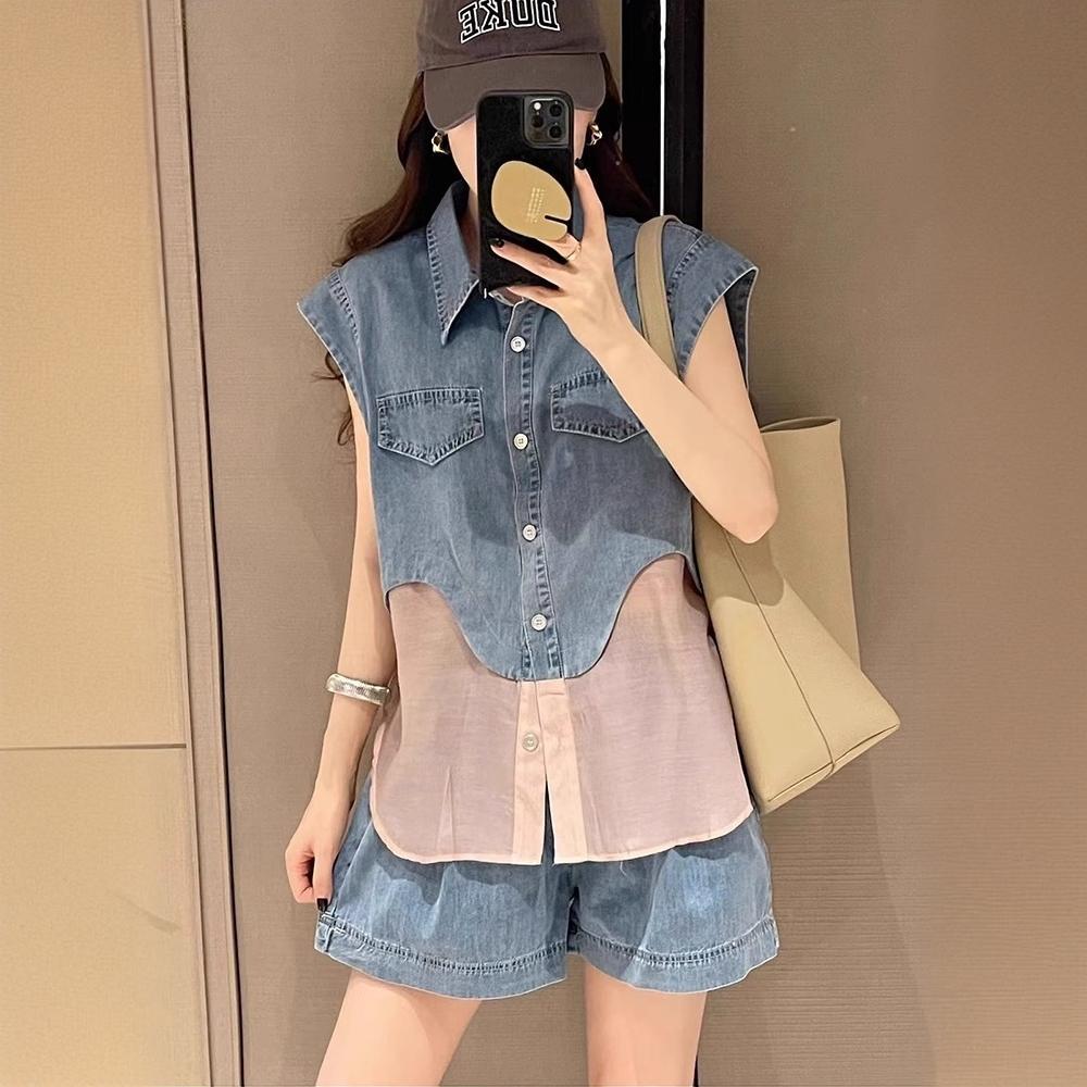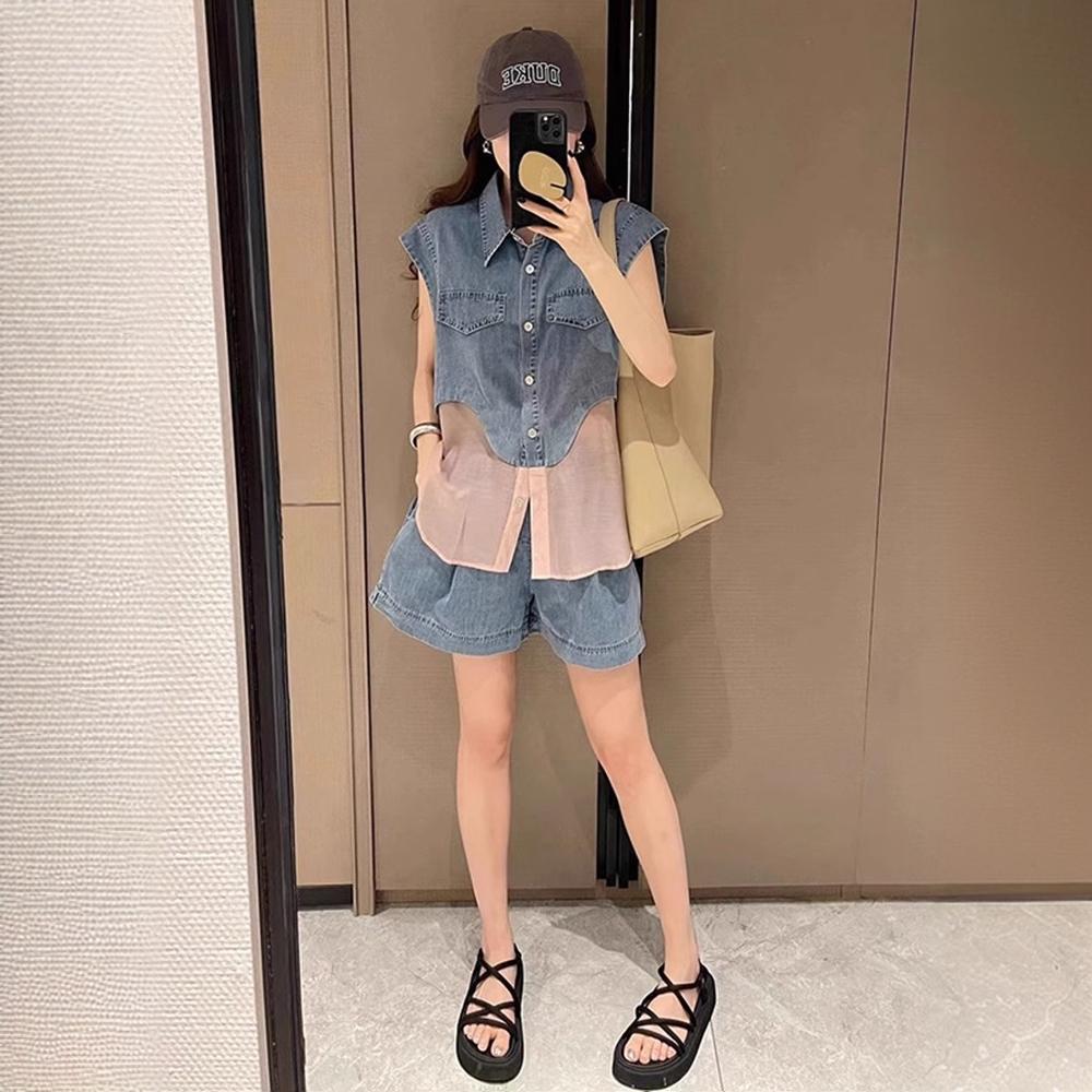 캐주얼 스포츠 세트 여성 여름 프라이드 스트리트 시대 감소 서양식 작은 데님 바느질 민소매 조끼 반바지 투피스 세트