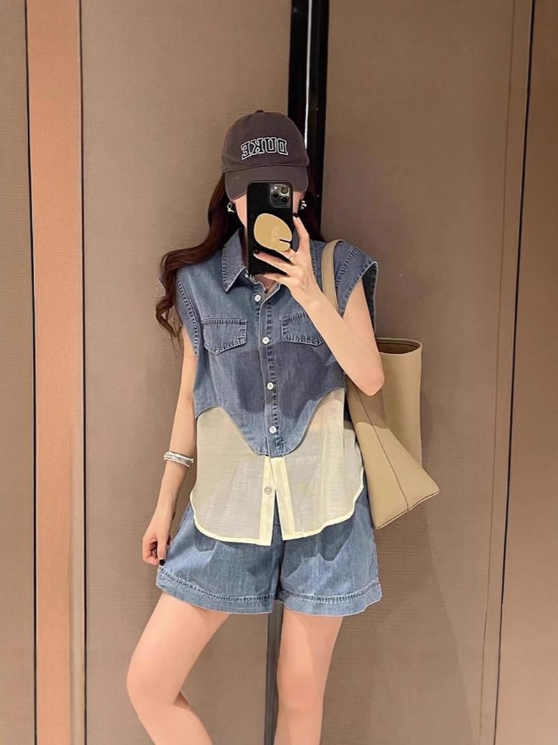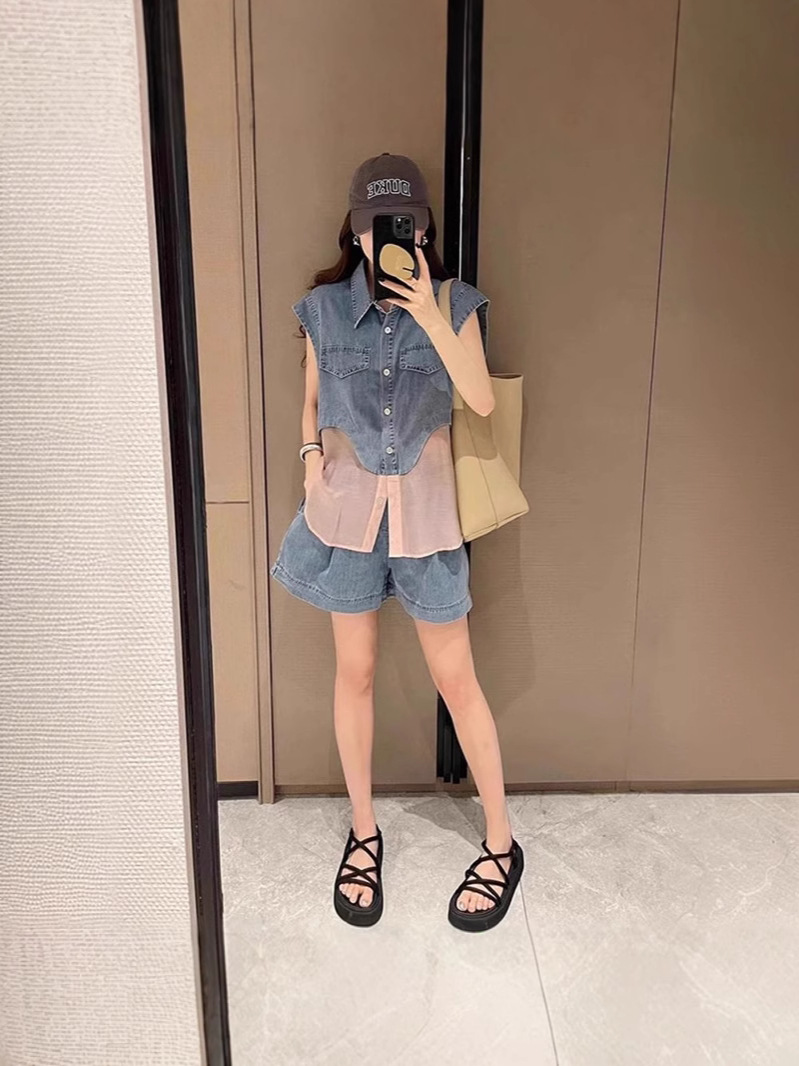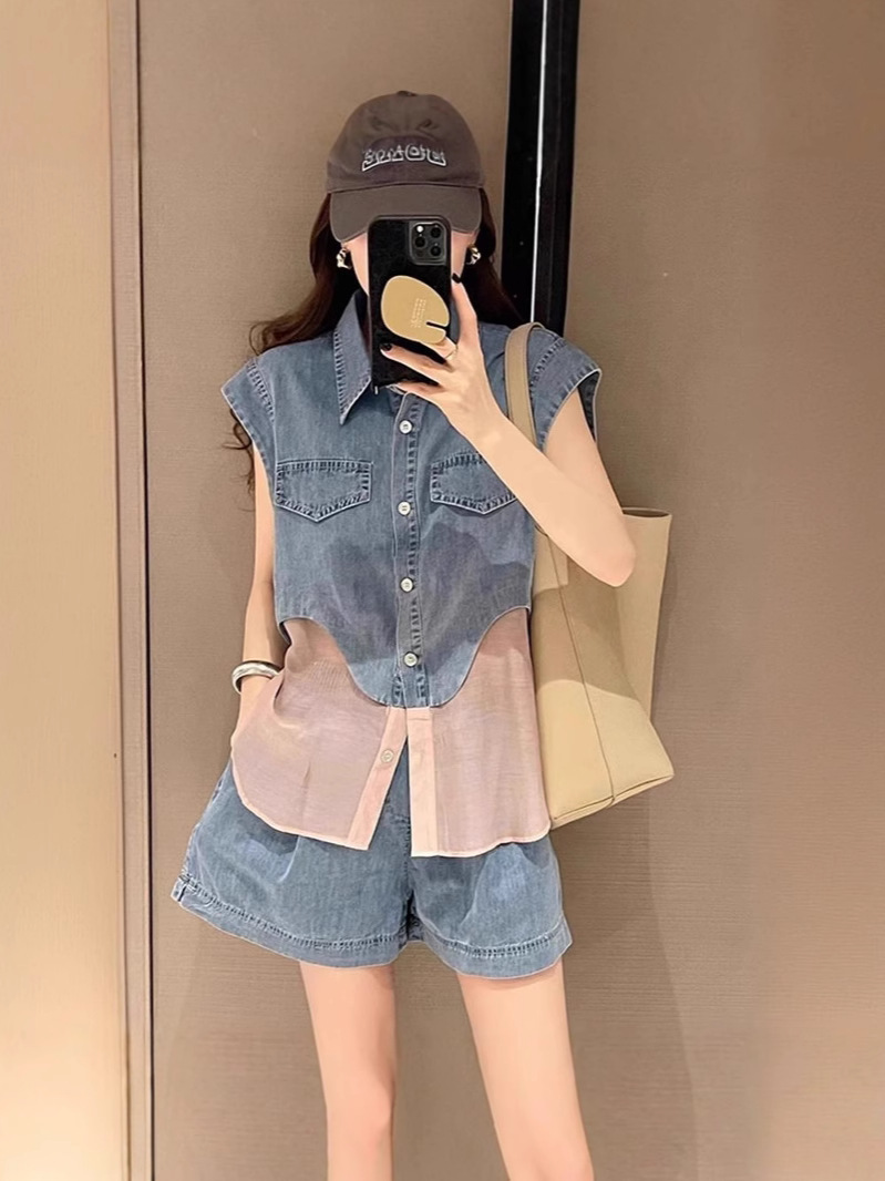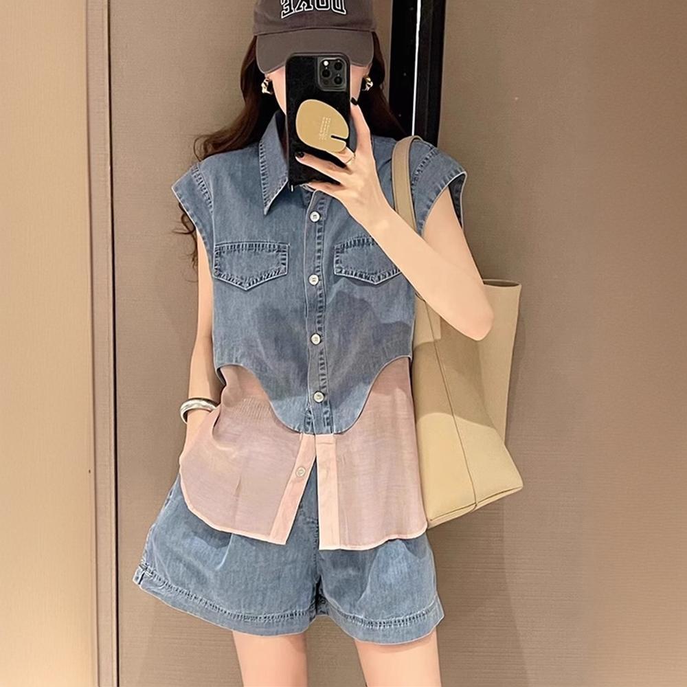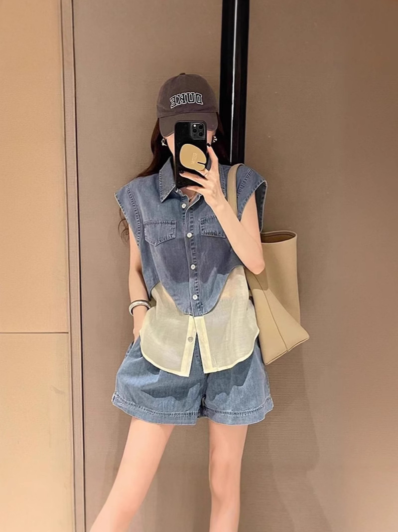 캐주얼 스포츠 세트 여성 여름 프라이드 스트리트 시대 감소 서양식 작은 데님 바느질 민소매 조끼 반바지 투피스 세트