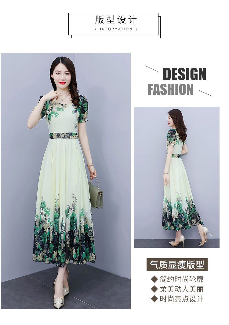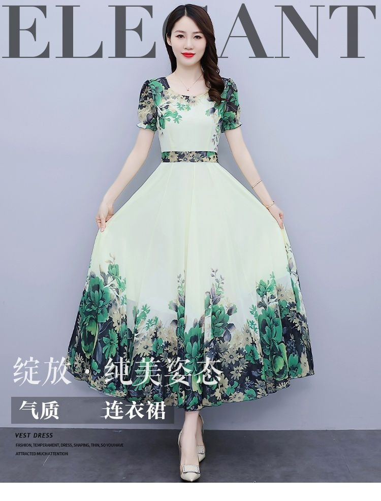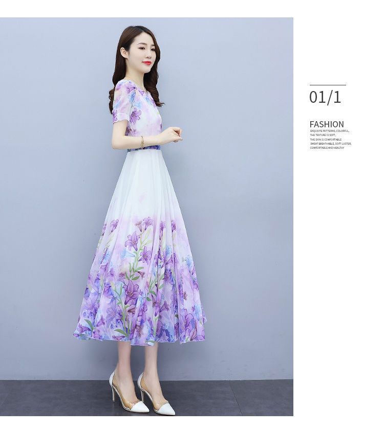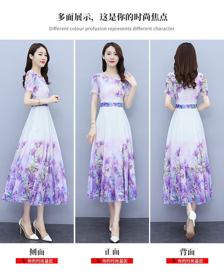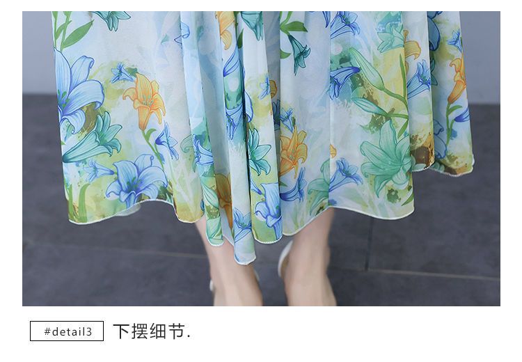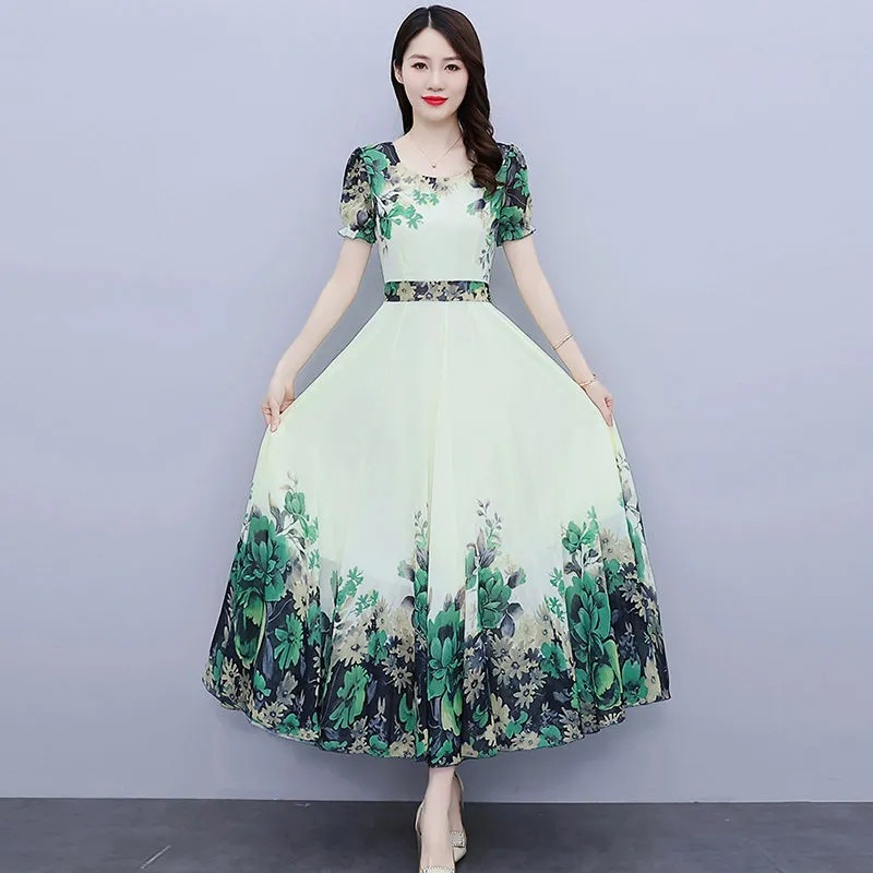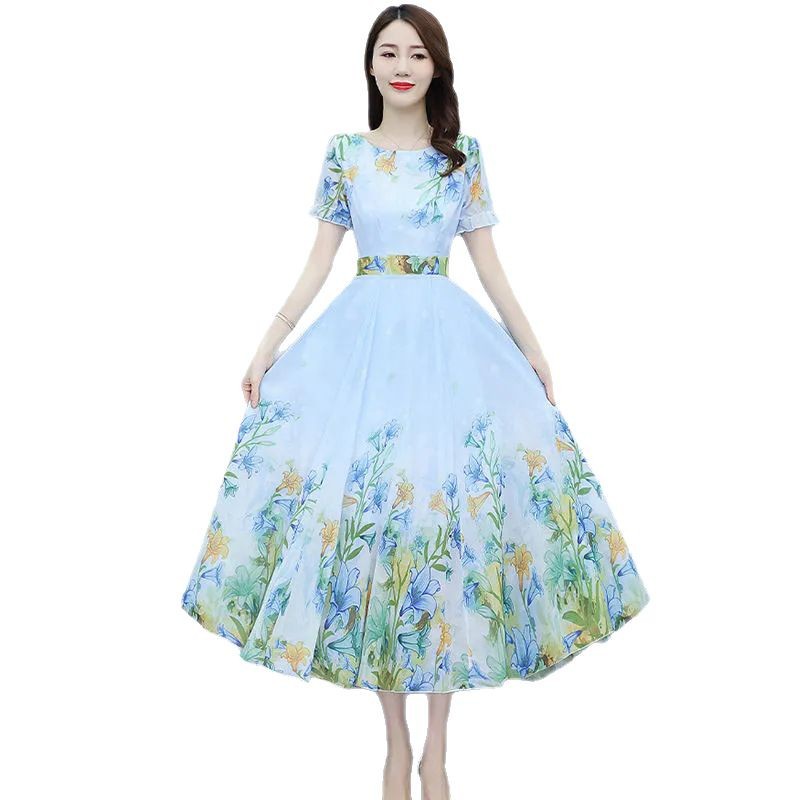 라운드 넥 반팔 꽃무늬 드레스 틈새 하이 웨이스트 슬림 쉬폰 프린트 롱 스커트 2025 여름 비치 스커트