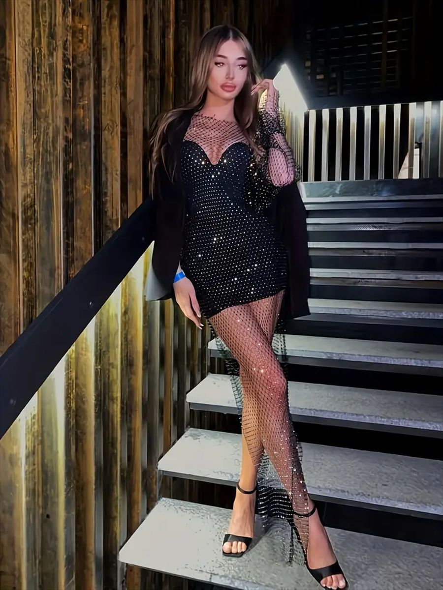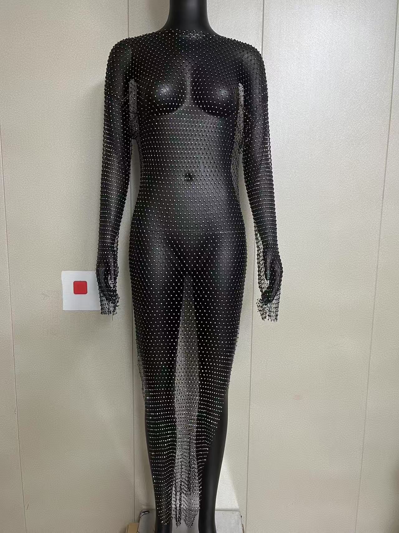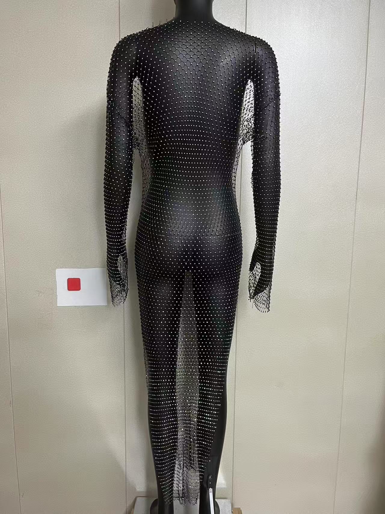 2025 여름 쿨 메쉬 라인스톤 드레스 섹시한 중공 긴팔 원라인 칼라 슬릿 비치 파티 롱 드레스