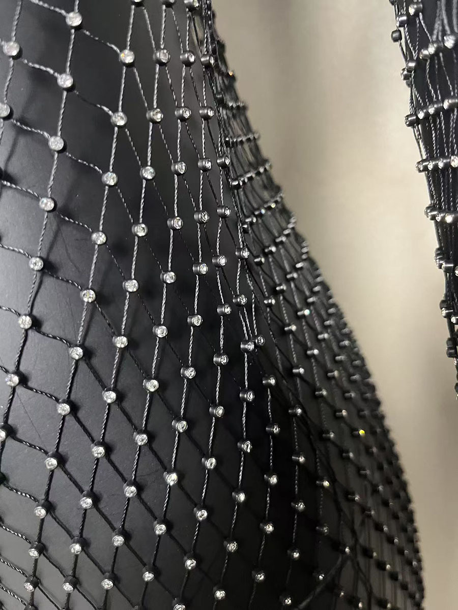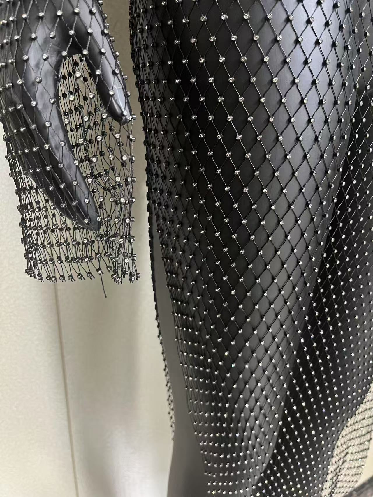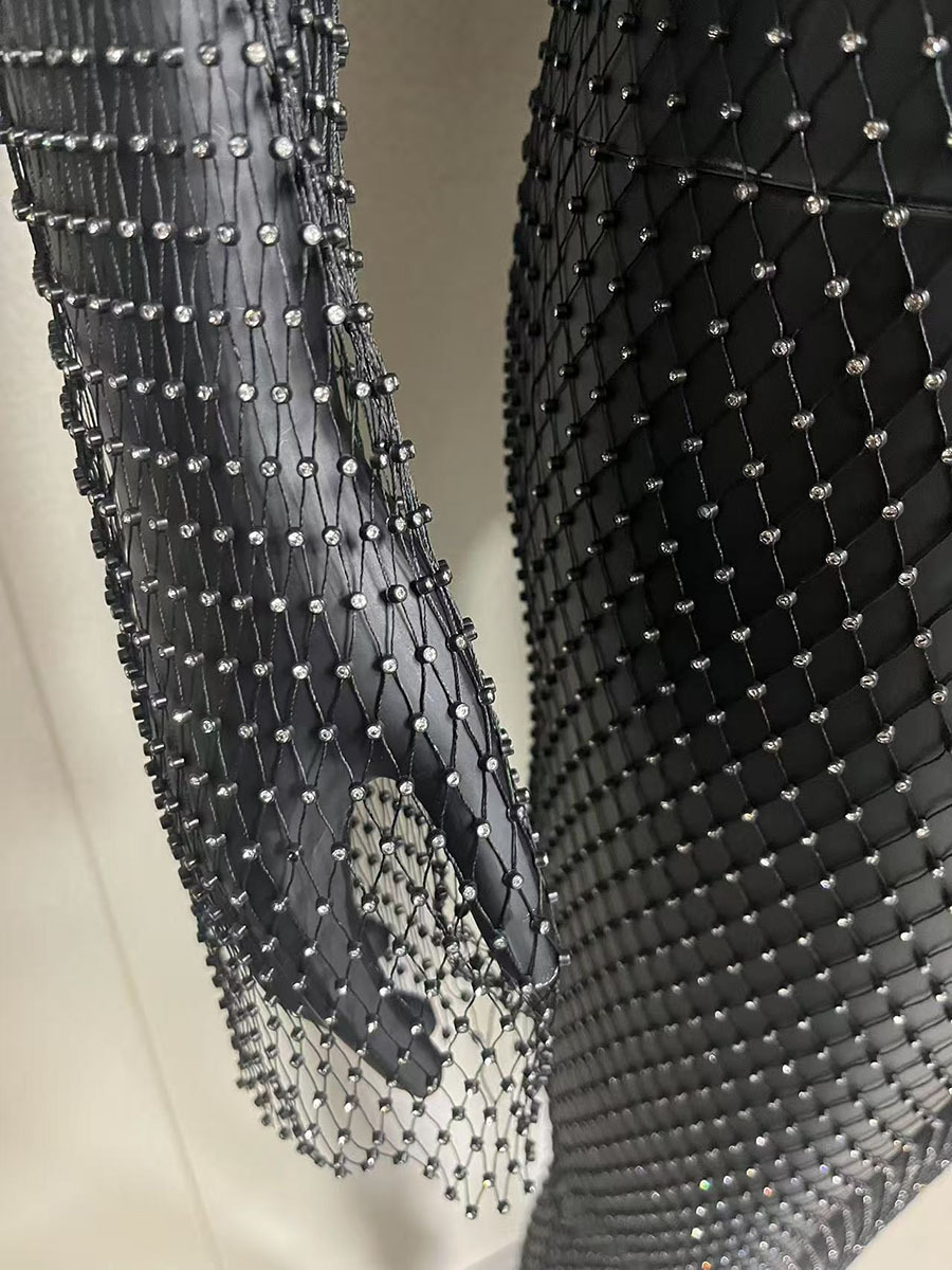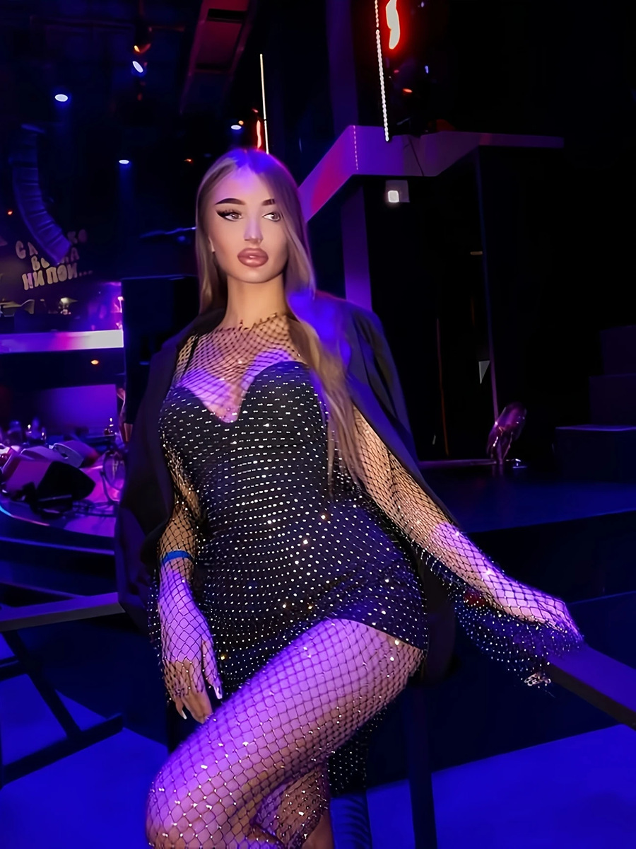 2025 여름 쿨 메쉬 라인스톤 드레스 섹시한 중공 긴팔 원라인 칼라 슬릿 비치 파티 롱 드레스