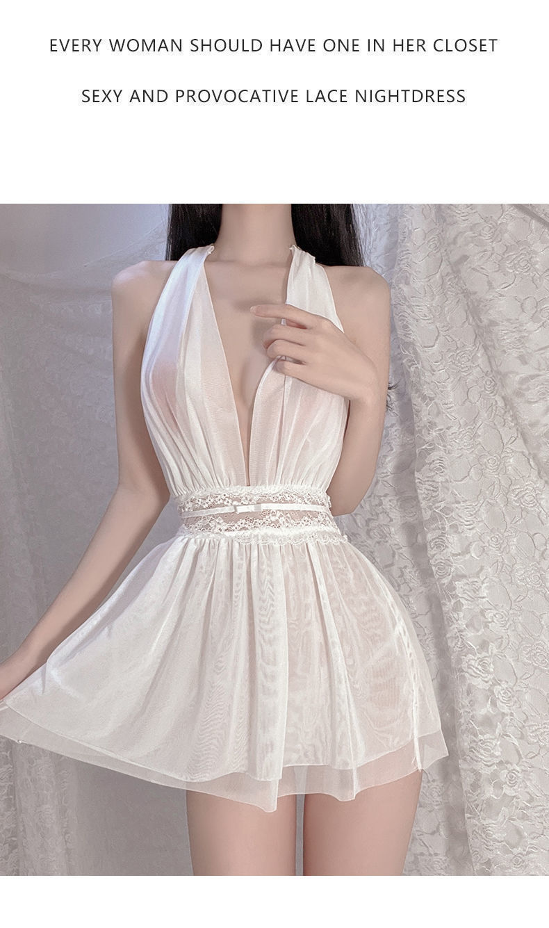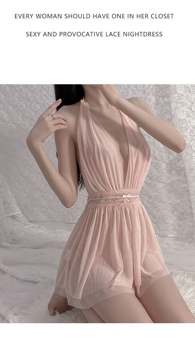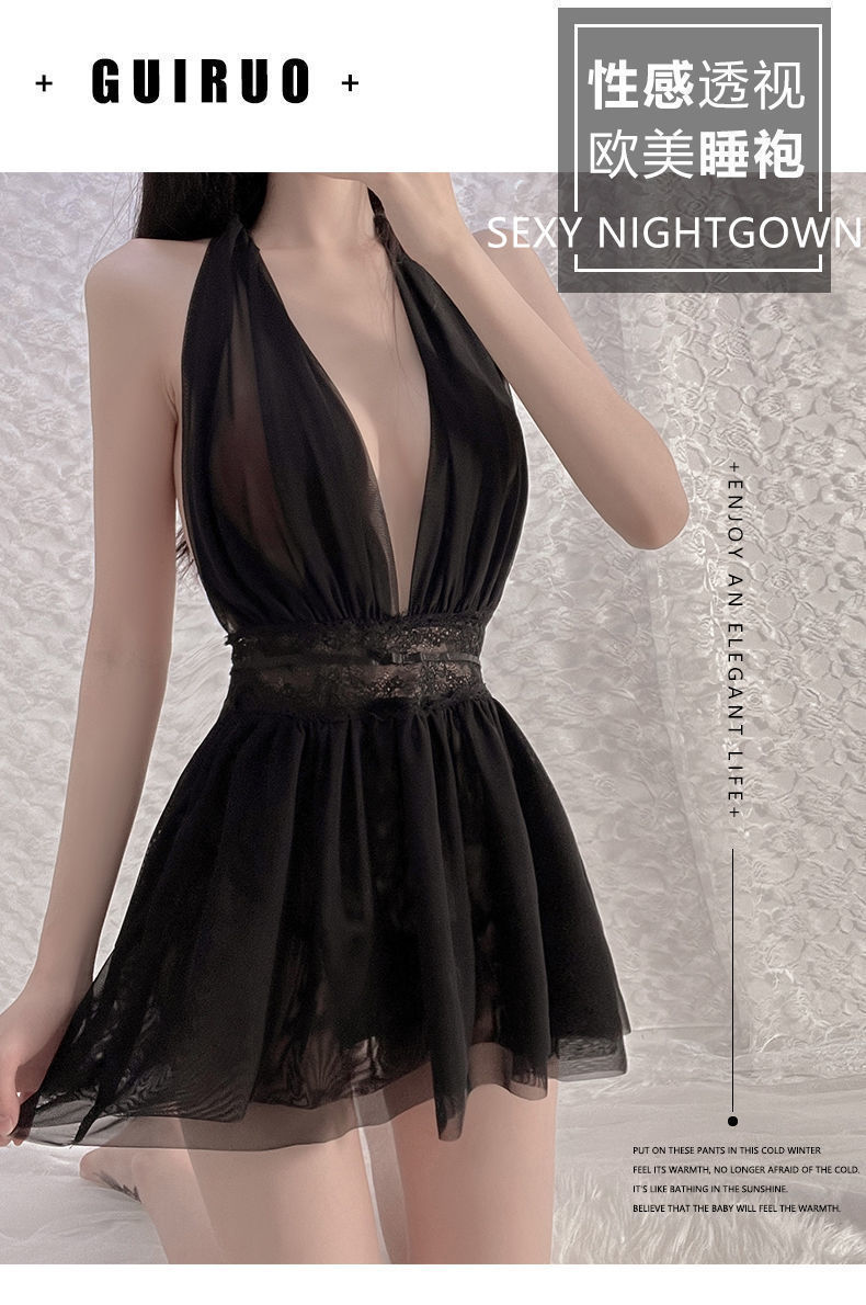 섹시 란제리 홀터넥 스커트 순수한 욕망 프렌치 나이트 가운 디너 바 유니폼 메쉬 백리스 시스루 드레스 1948