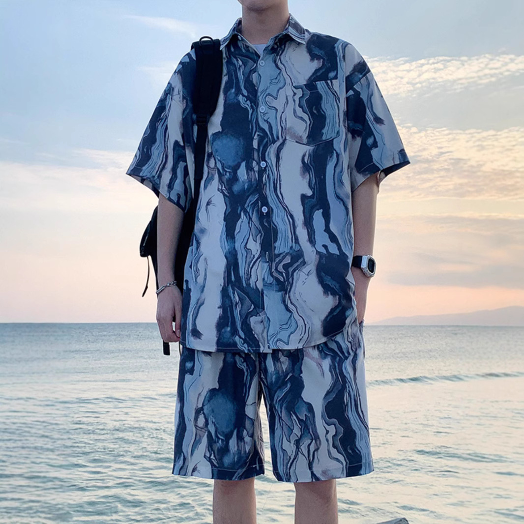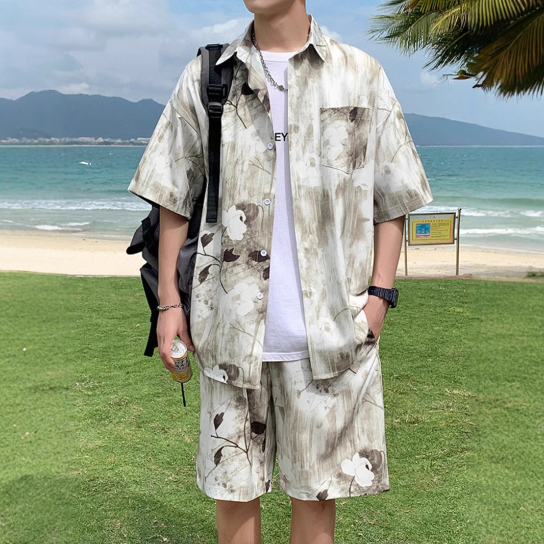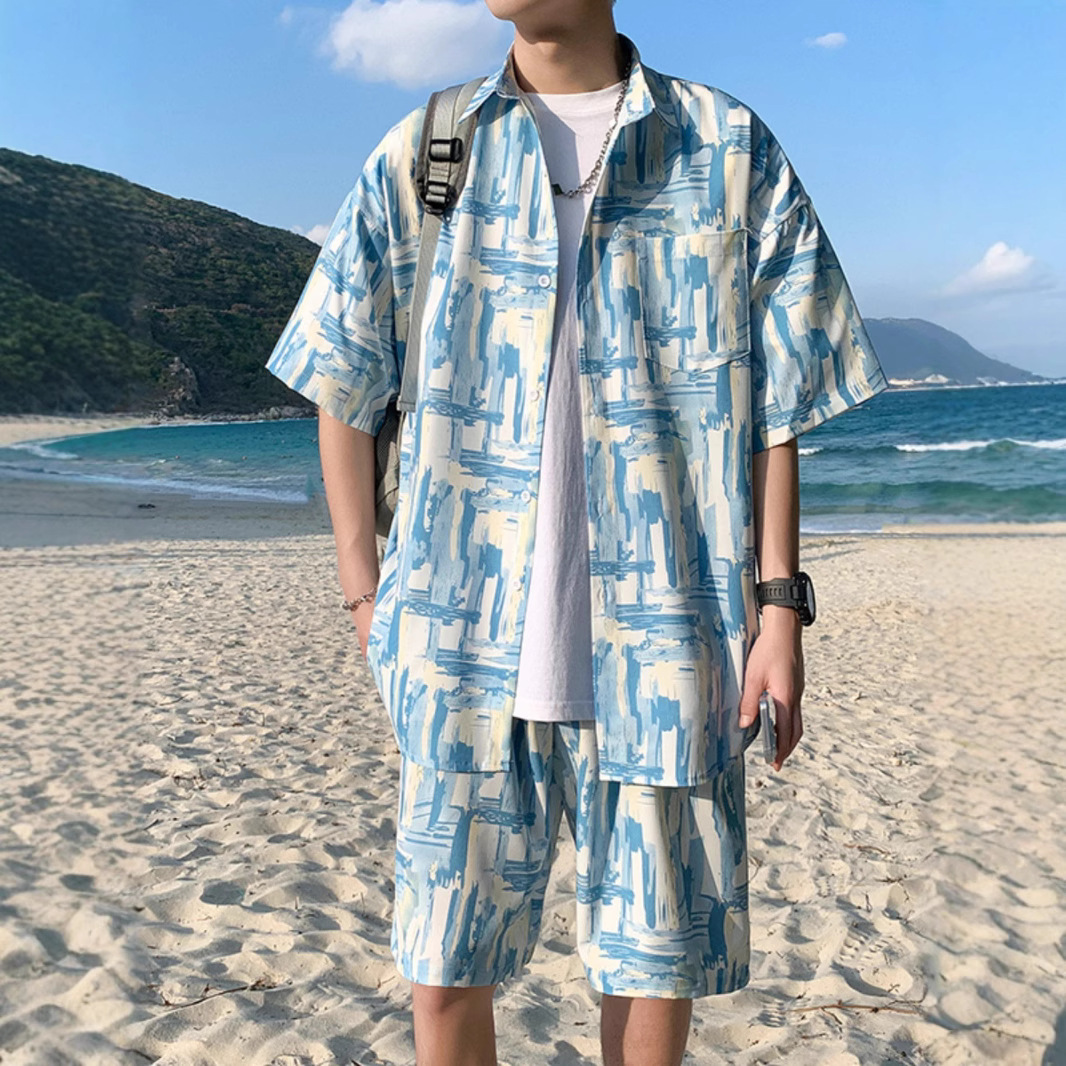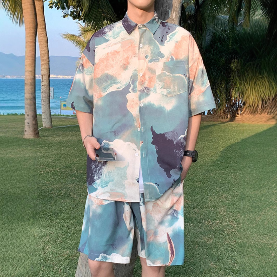 비치 셔츠 남성용 반팔 아이스 실크 해변 휴가 남성 의류 싼야 여행 착용 소년 하와이 커플 슈트
