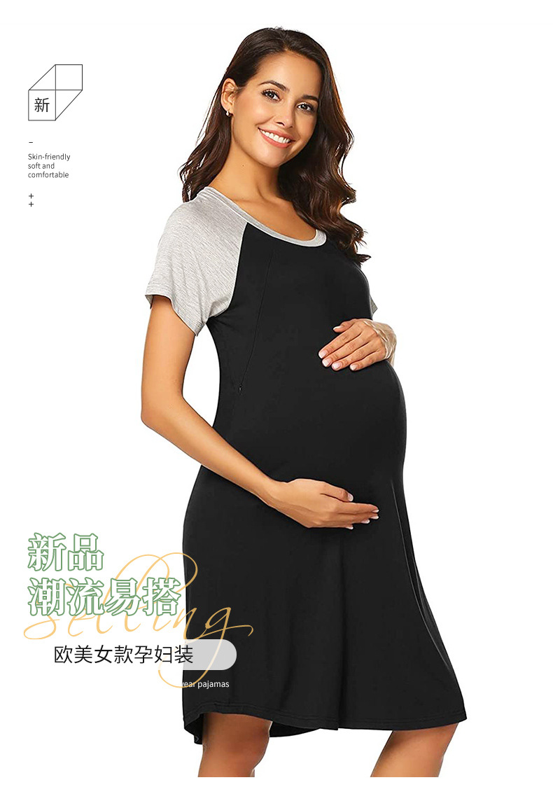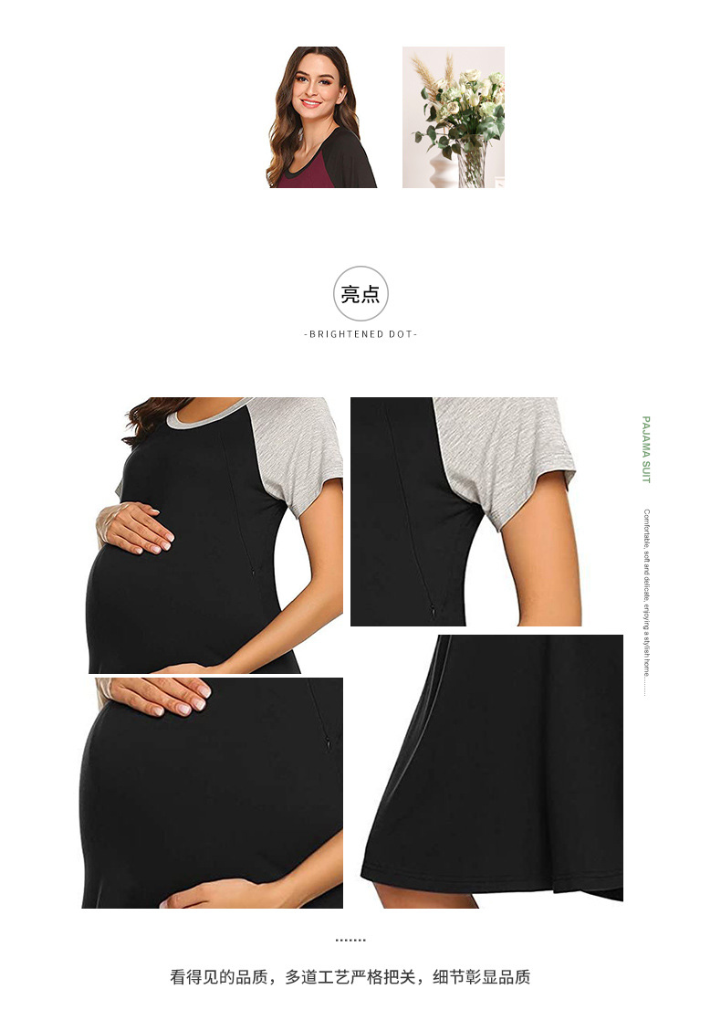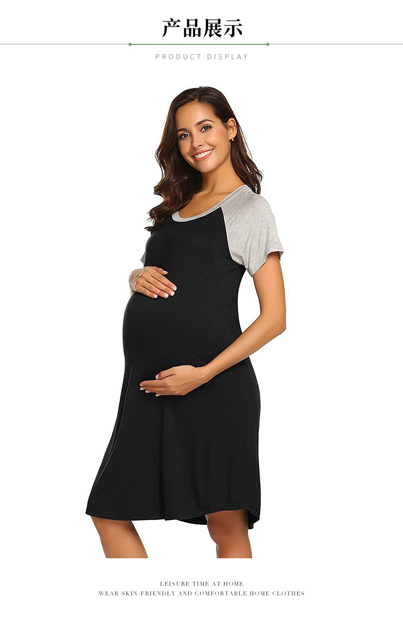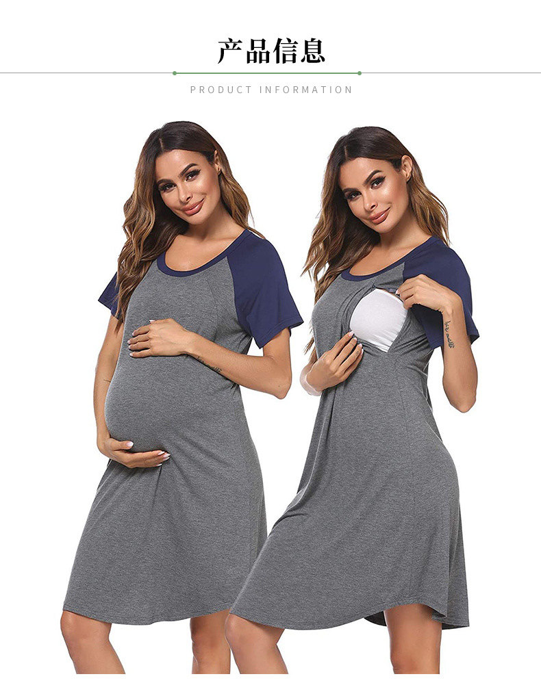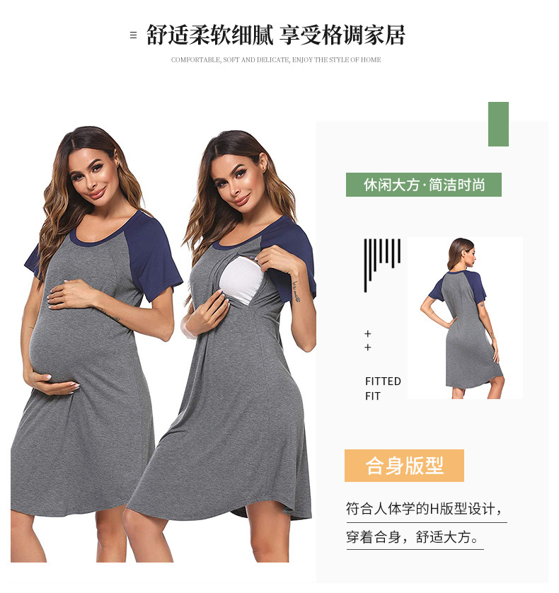 유럽과 미국의 임부복을 업그레이드하고 탄력 있고 편안한 스플라이스 반팔 라운드 넥 엄마 수유 드레스 파자마를 제공합니다.