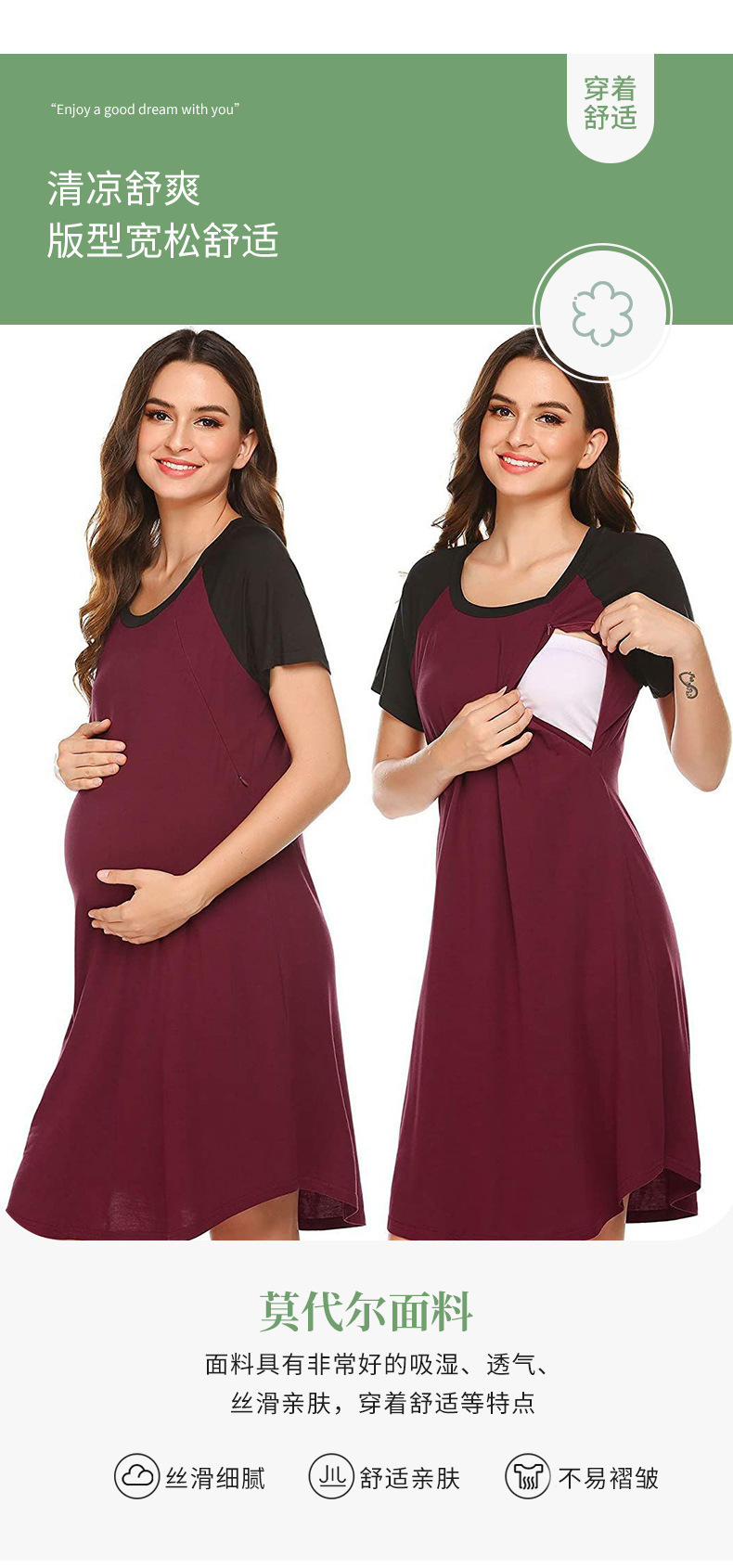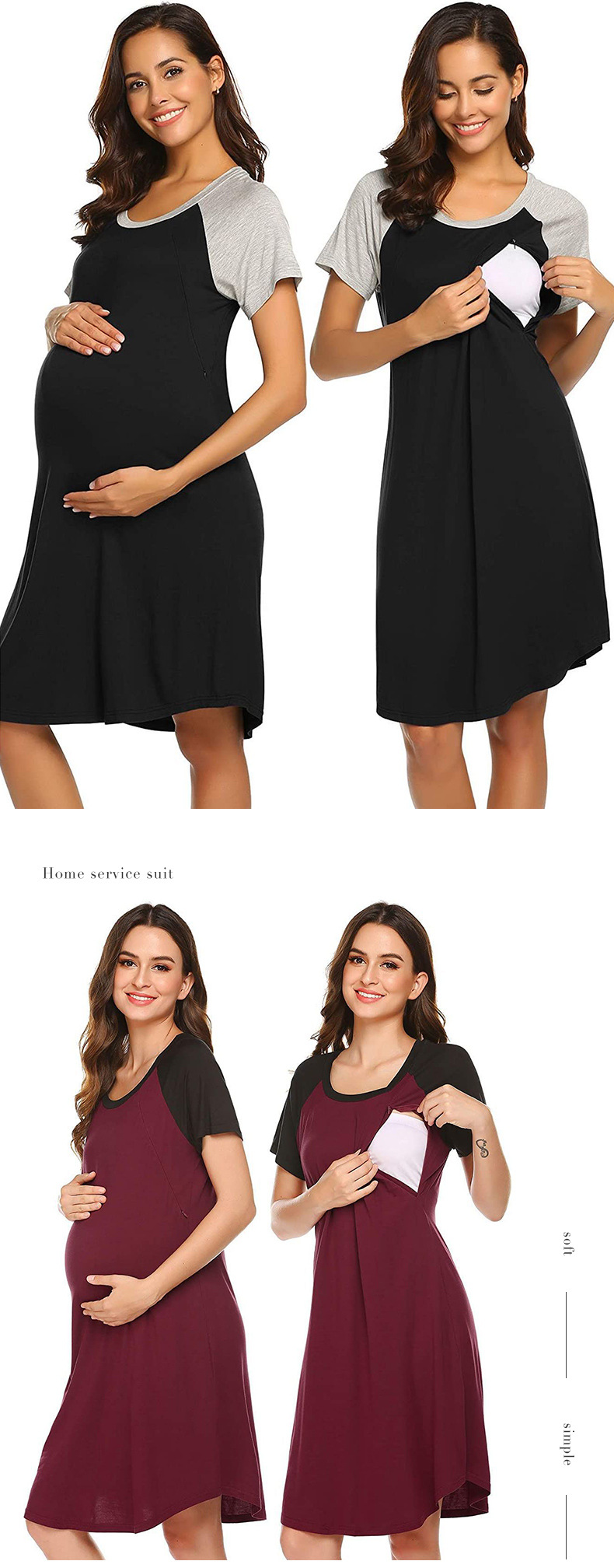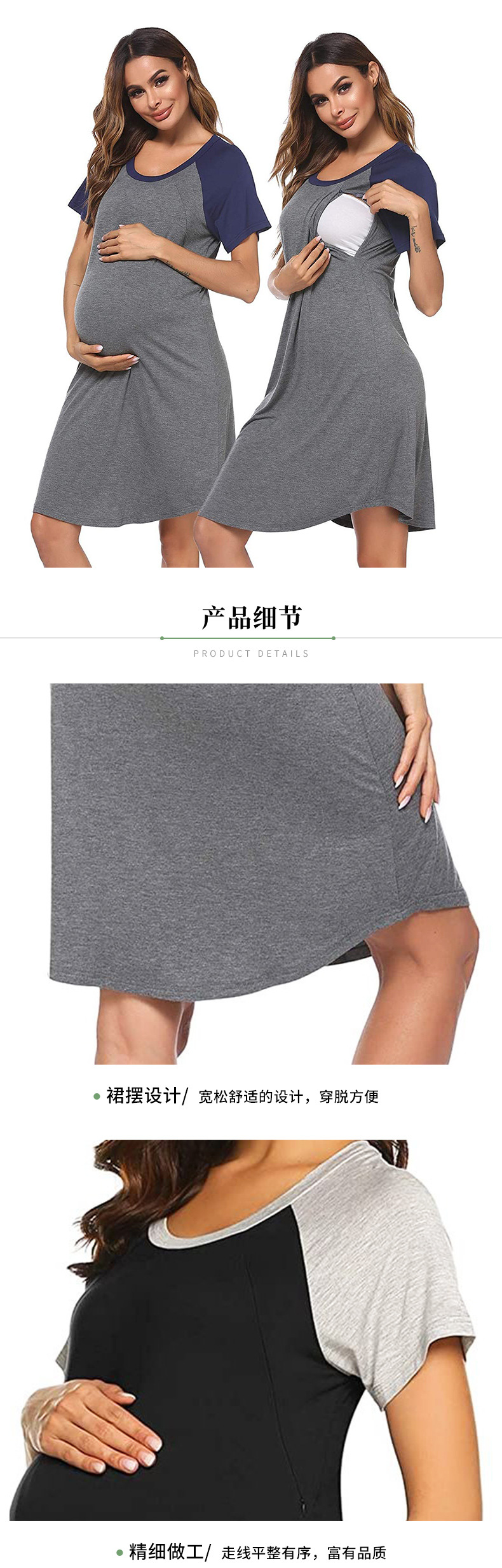 유럽과 미국의 임부복을 업그레이드하고 탄력 있고 편안한 스플라이스 반팔 라운드 넥 엄마 수유 드레스 파자마를 제공합니다.