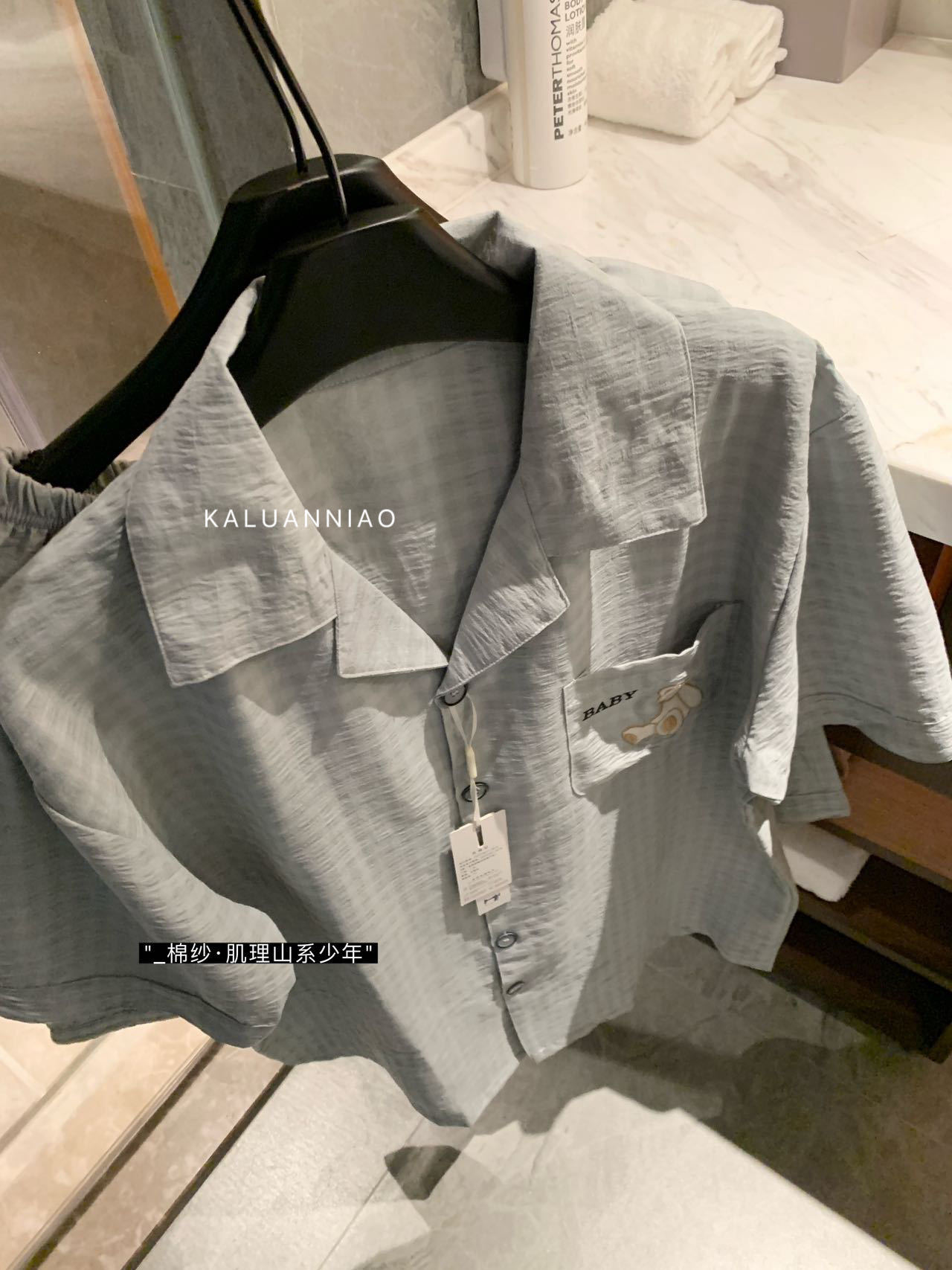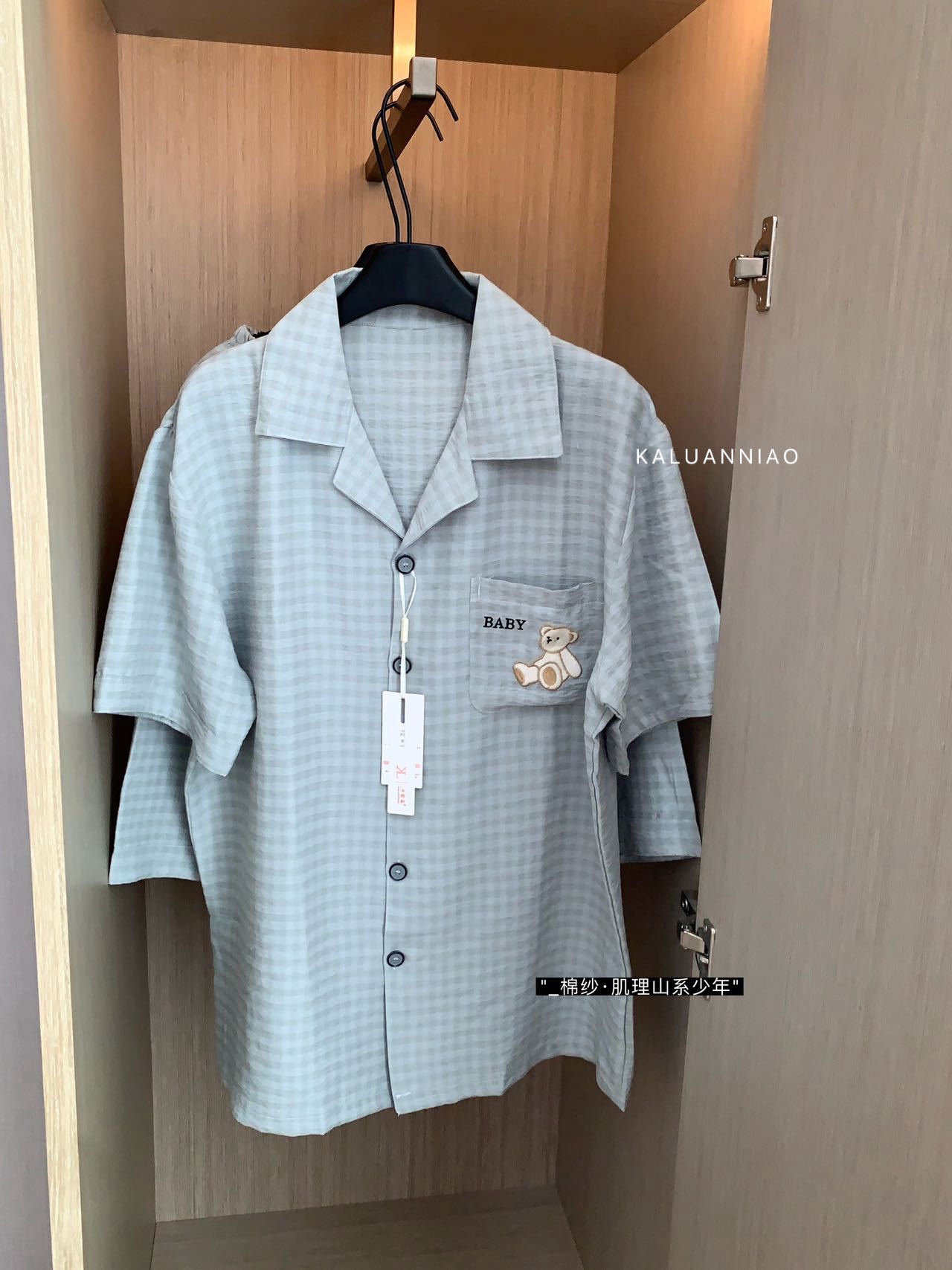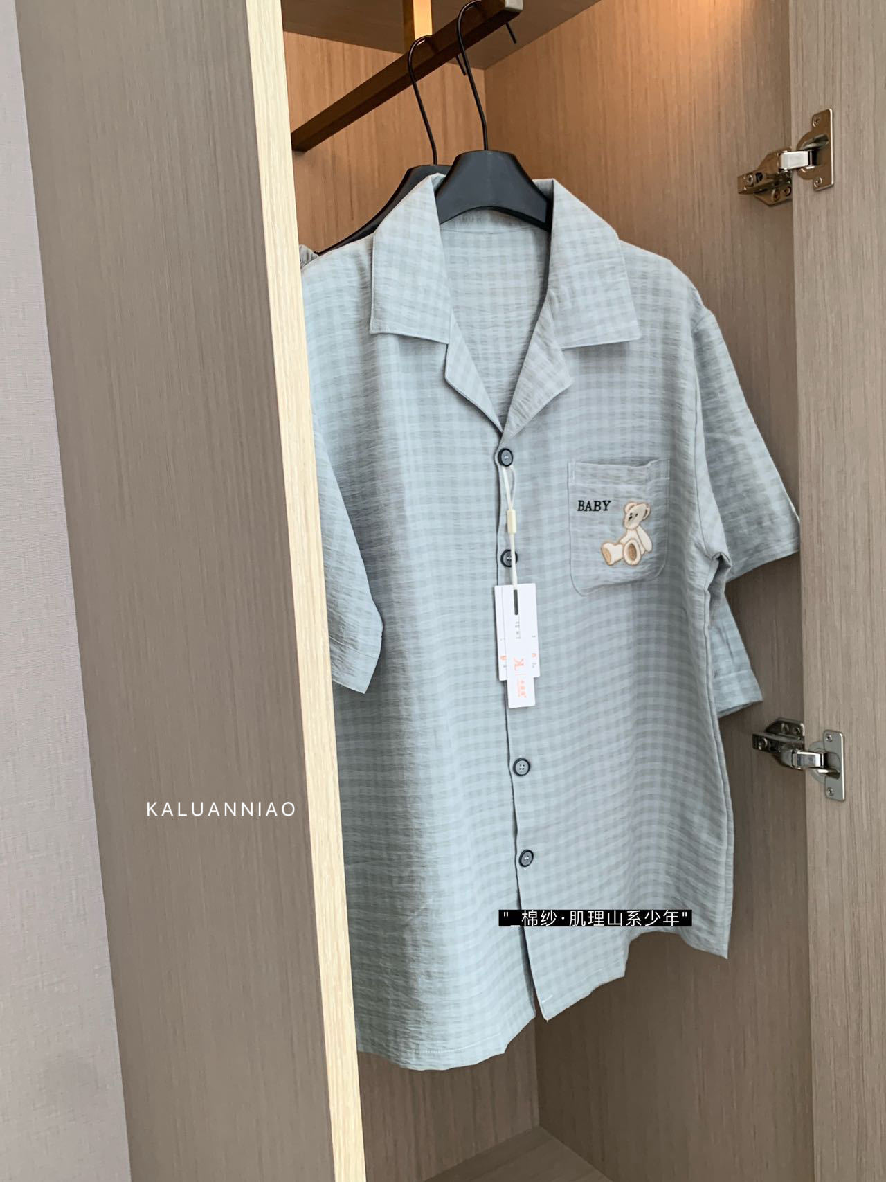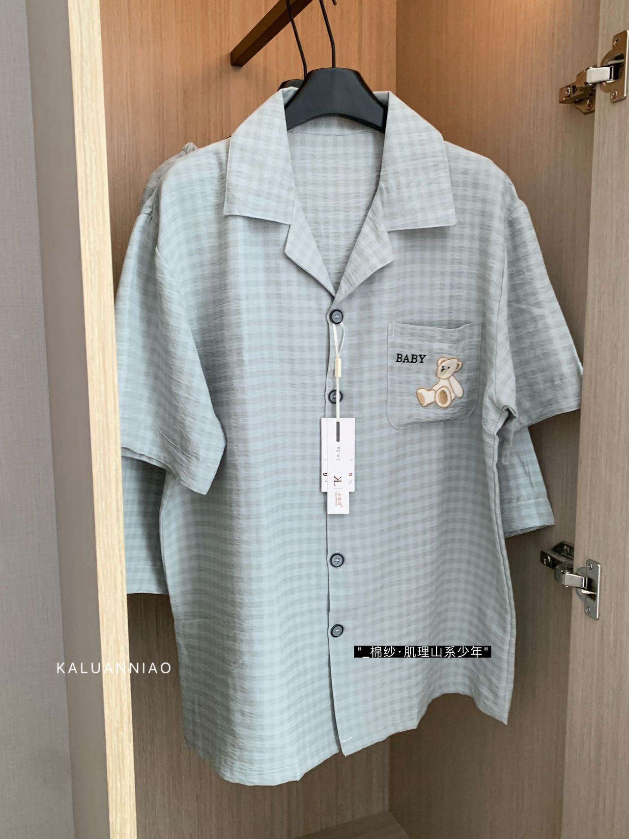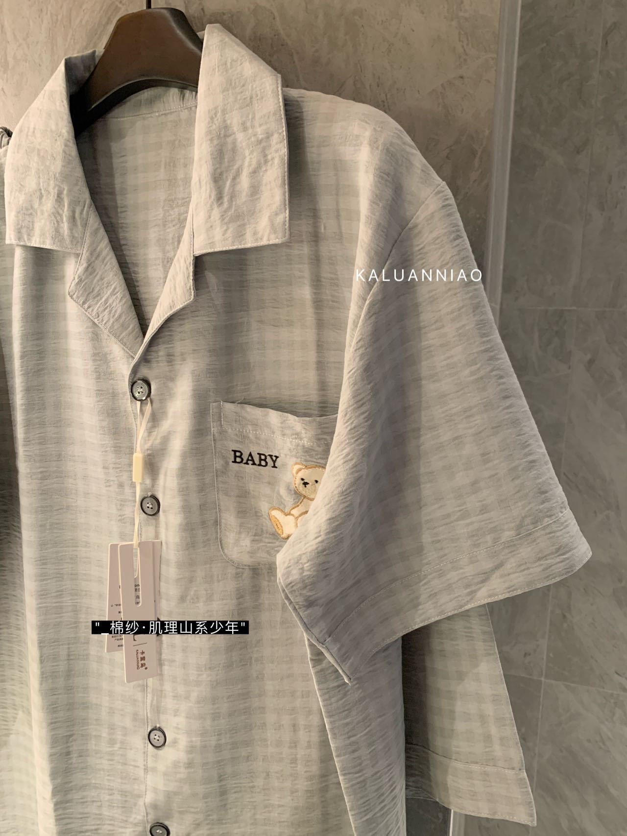 KALUANNIAO "면 원사-질감 마운틴 스타일 주니어 남성 잠옷 홈 의류 에어면 짧은 소매 반바지