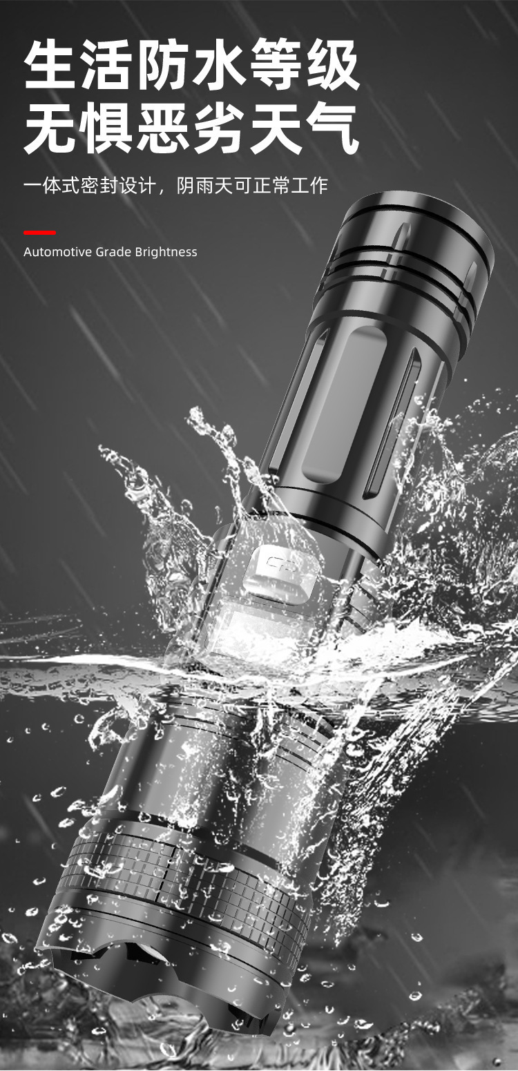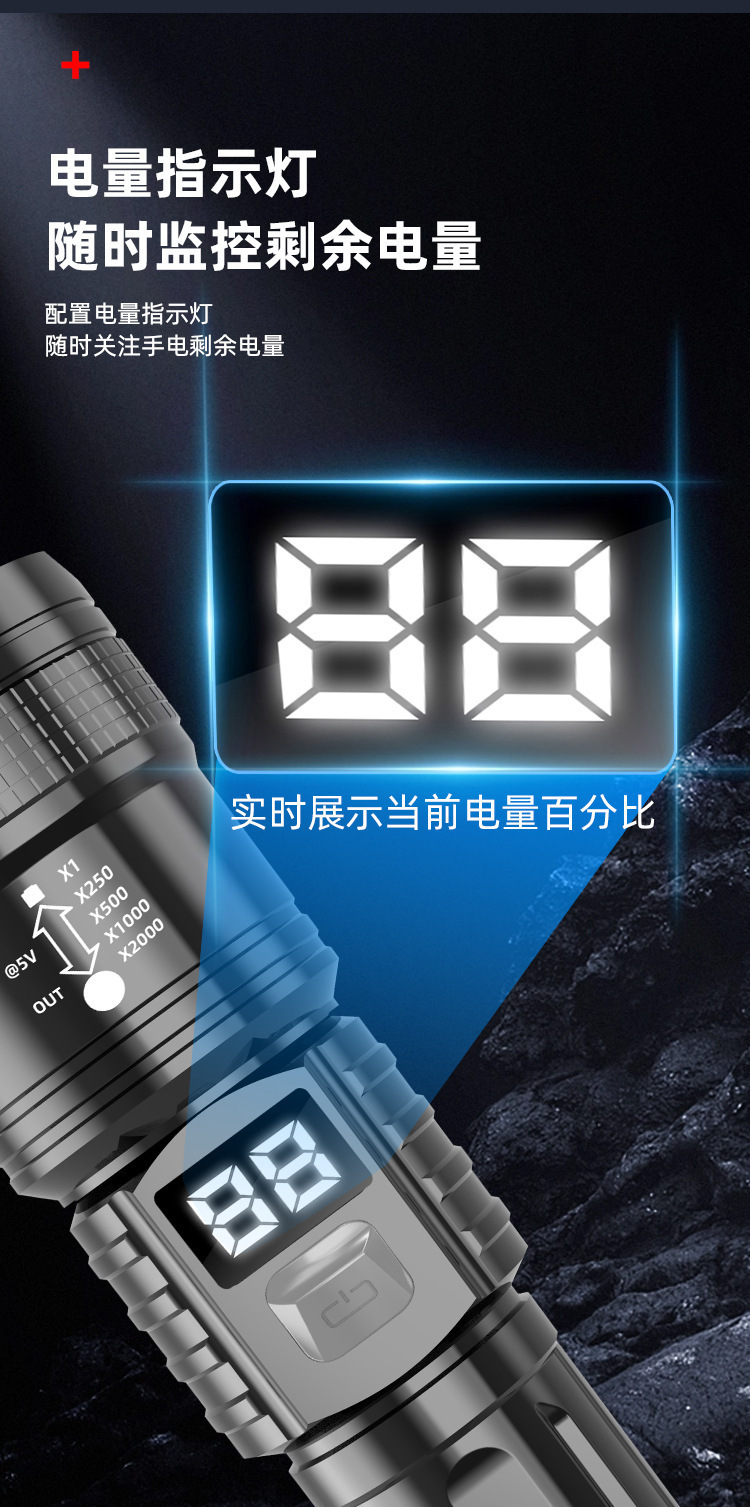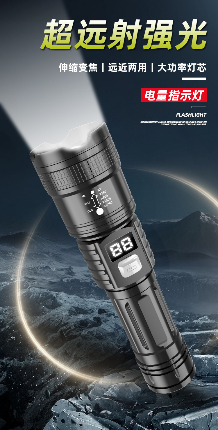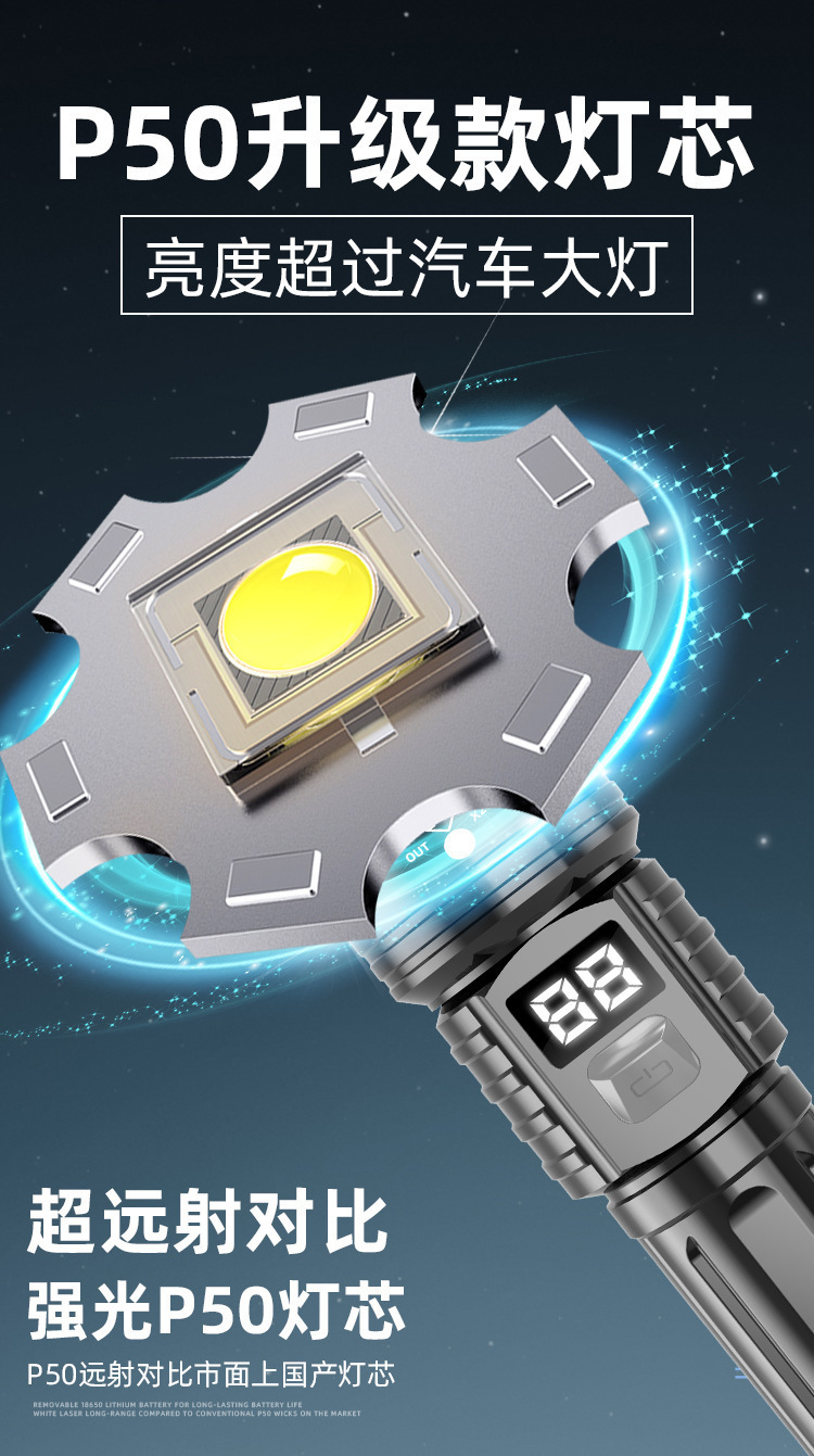 국경 간 P50 강한 빛 손전등 텔레스코픽 줌 충전 전기 디스플레이 긴 배터리 수명 야외 조명 손전등 제조 업체 도매