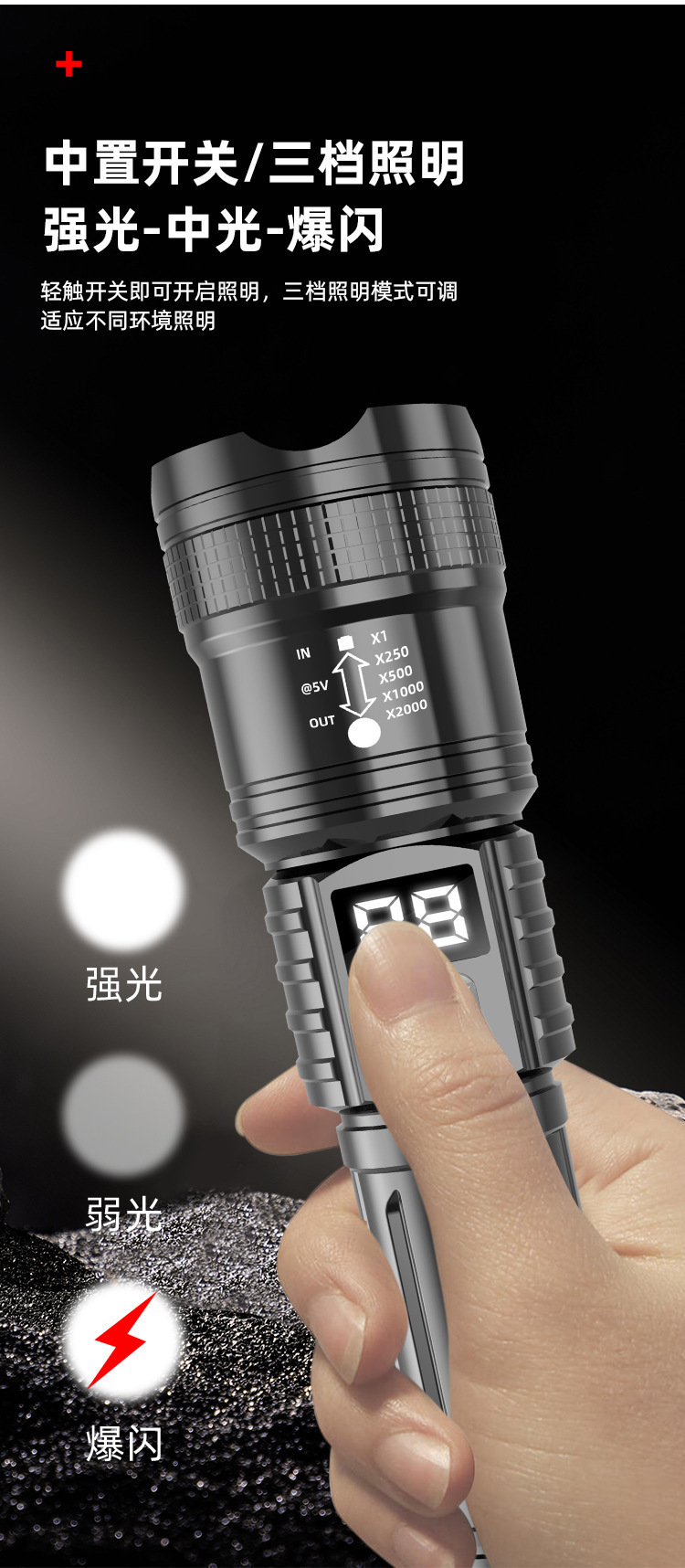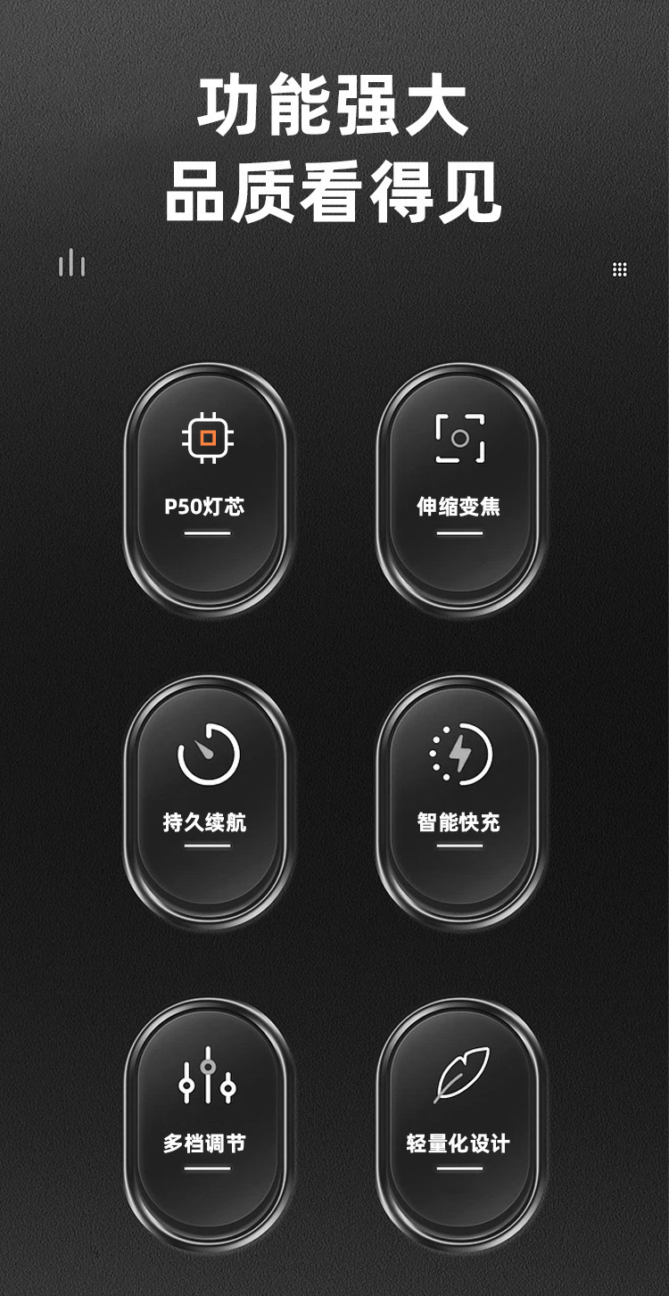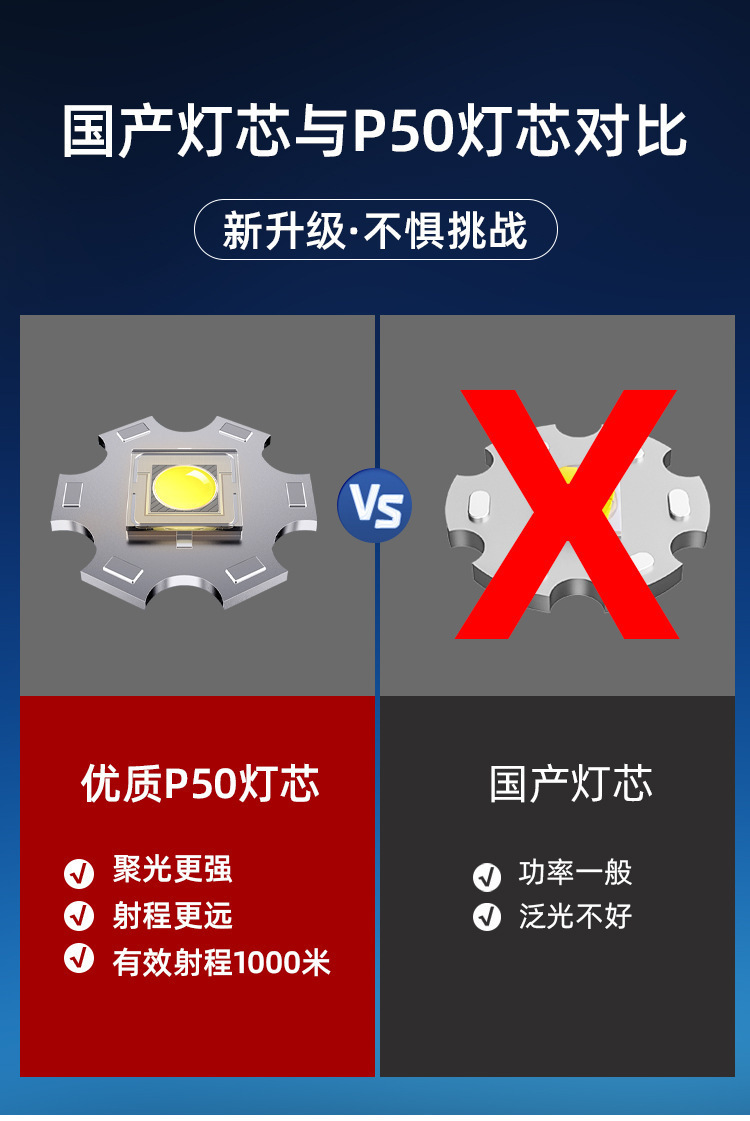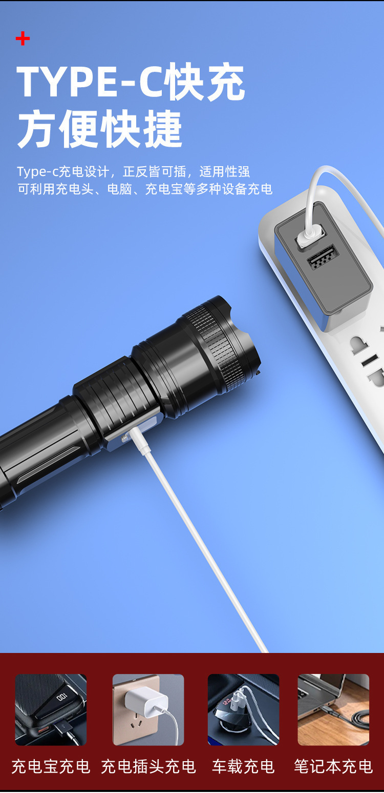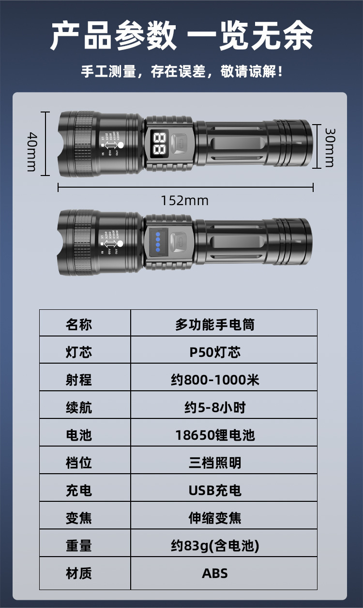 국경 간 P50 강한 빛 손전등 텔레스코픽 줌 충전 전기 디스플레이 긴 배터리 수명 야외 조명 손전등 제조 업체 도매