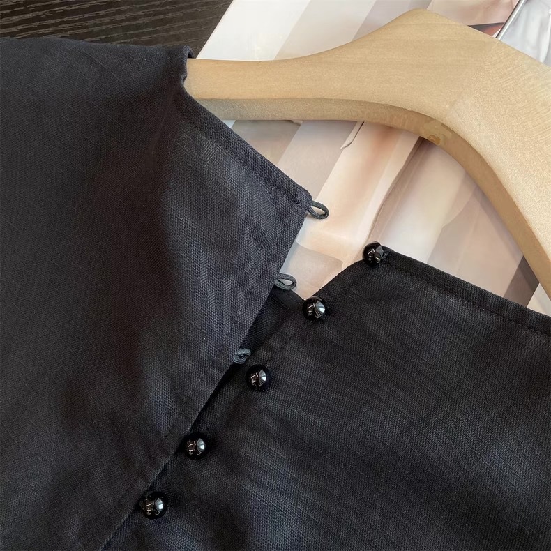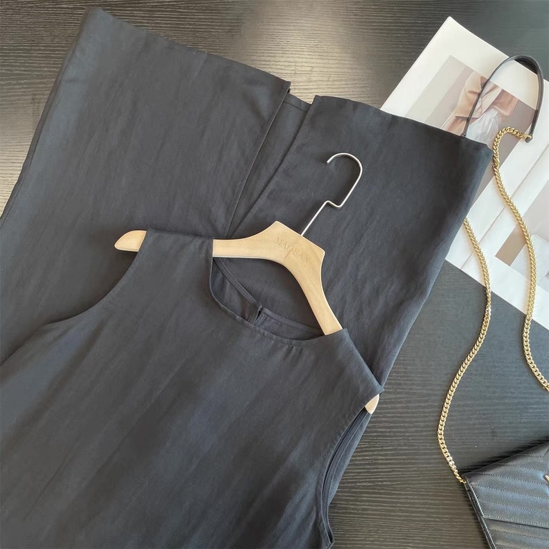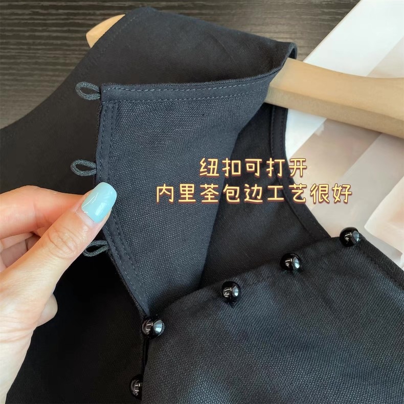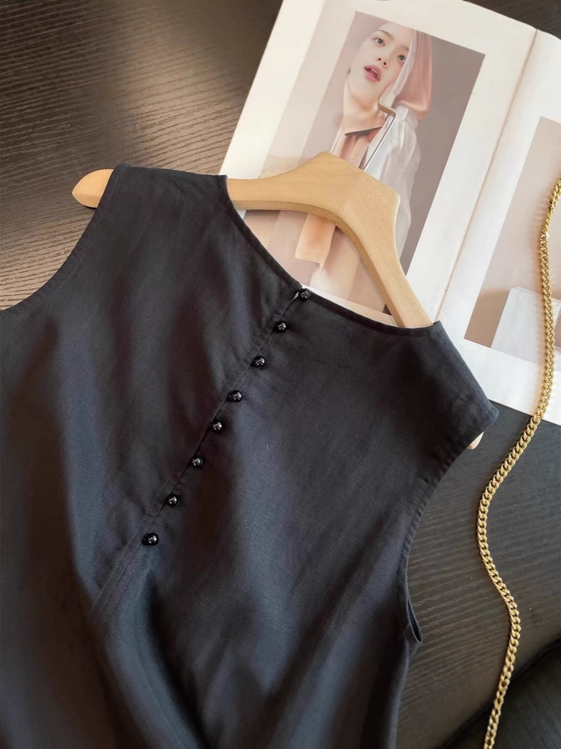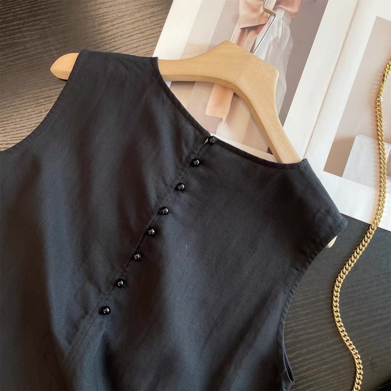 미니멀리스트 블랙 민소매 조끼 버섯 버튼 린넨 드레스 여성스러운 루즈 슬리밍 드레이프 리틀 블랙 드레스
