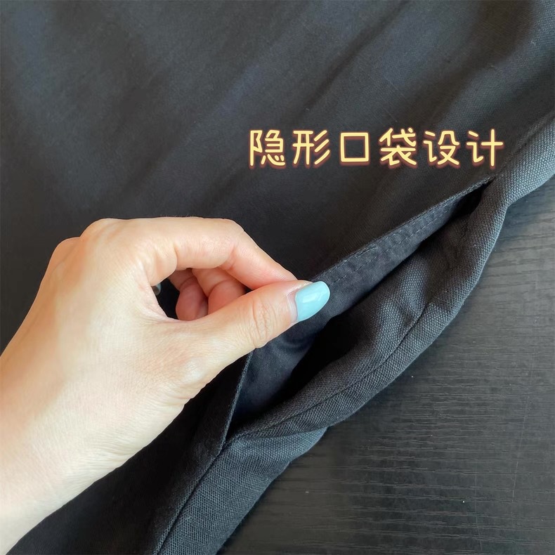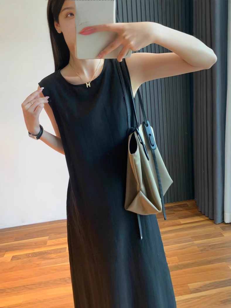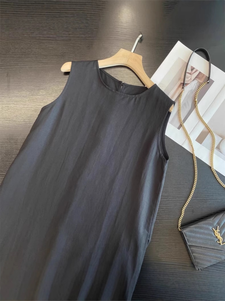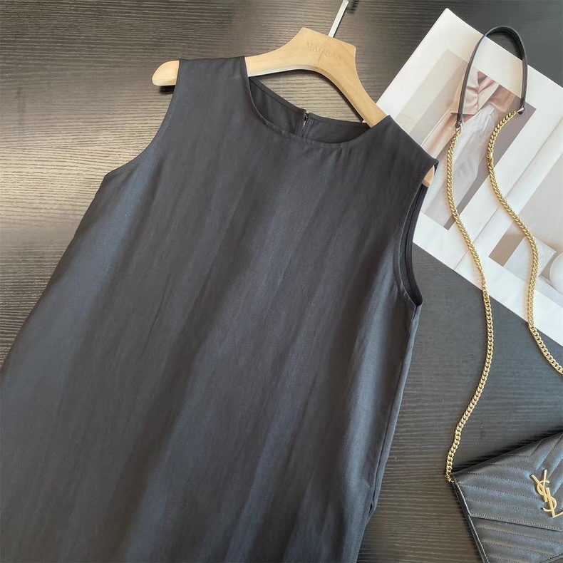 미니멀리스트 블랙 민소매 조끼 버섯 버튼 린넨 드레스 여성스러운 루즈 슬리밍 드레이프 리틀 블랙 드레스