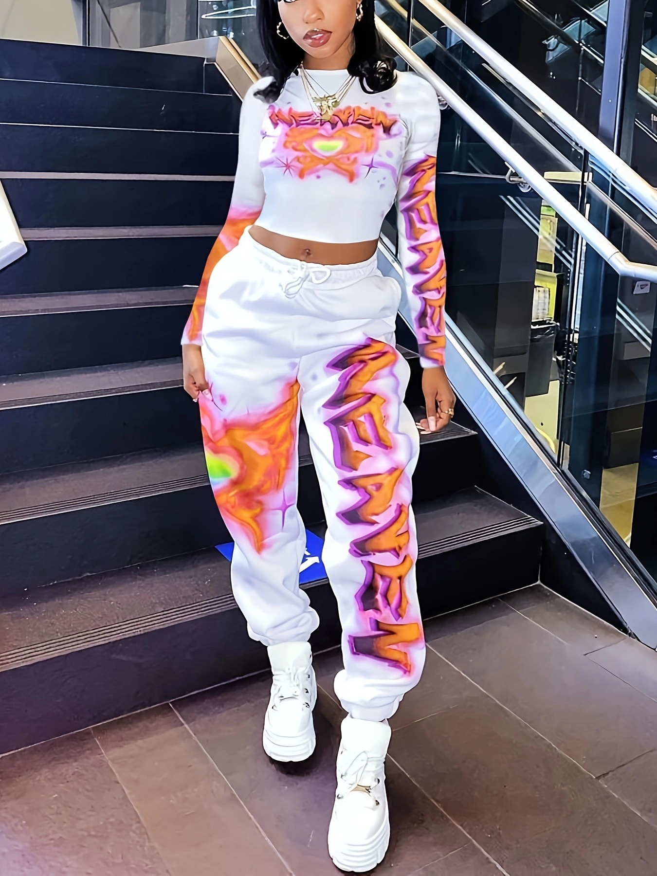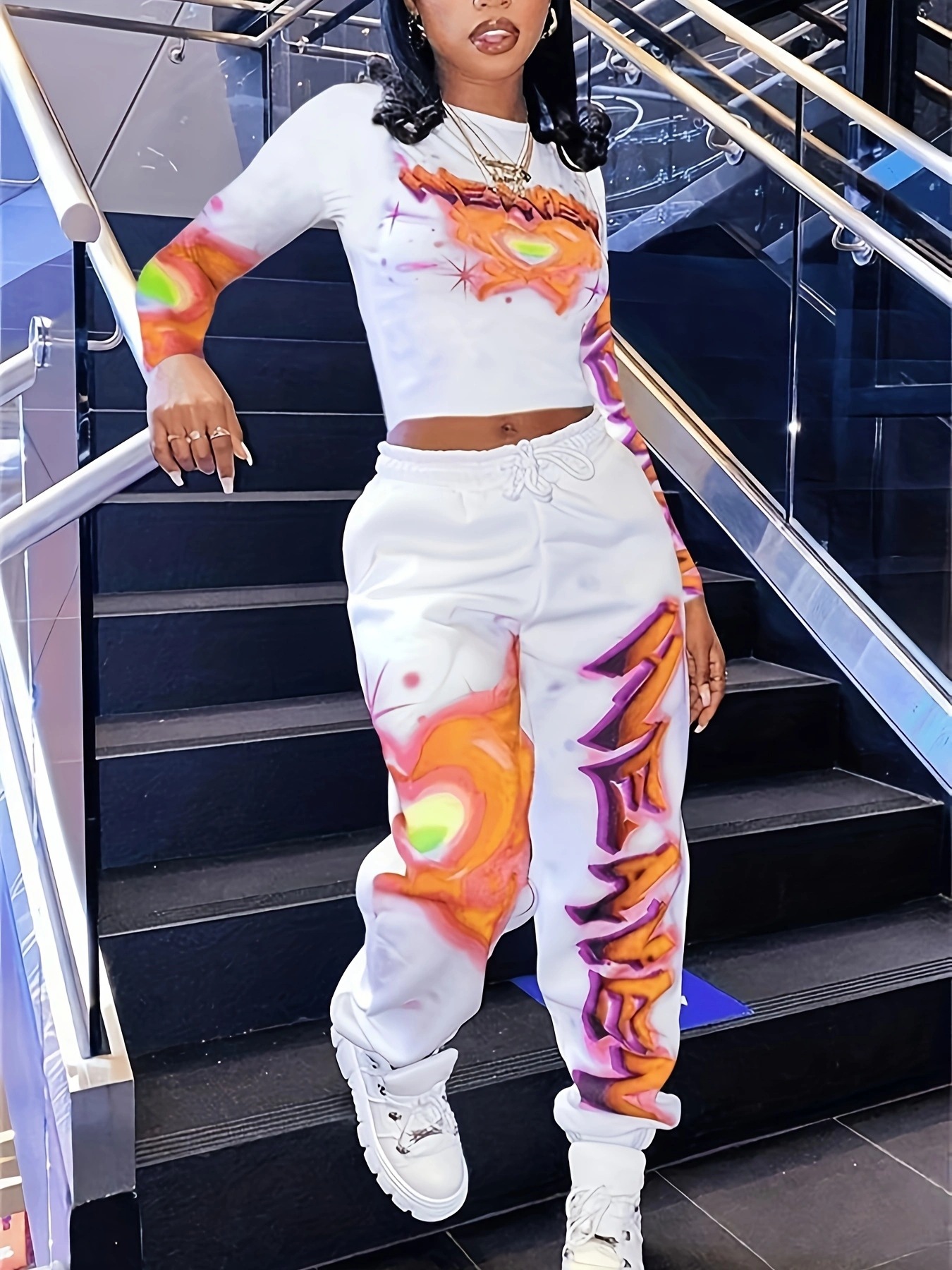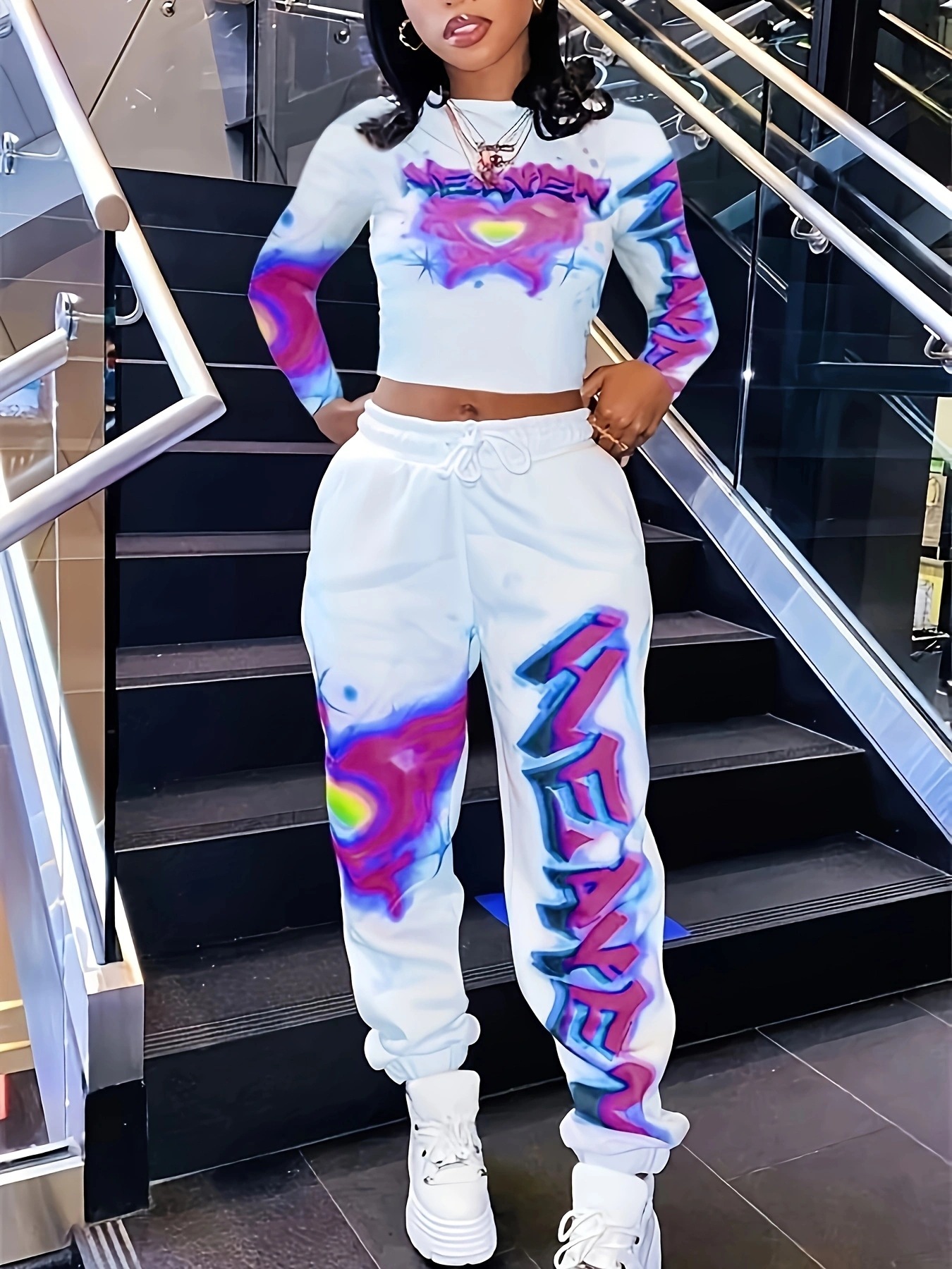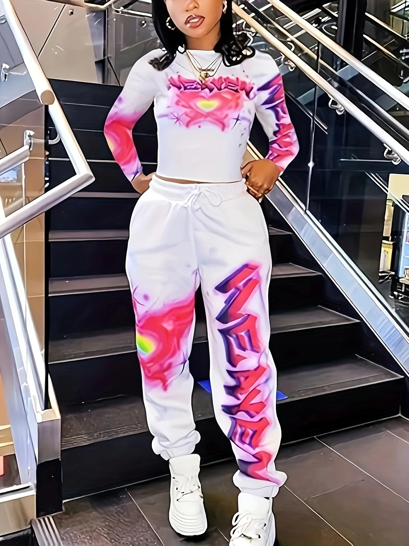 유럽과 미국의 국경 간 2025 패션 스포츠 및 레저 프린트 긴팔 바지 및 레깅스 세트