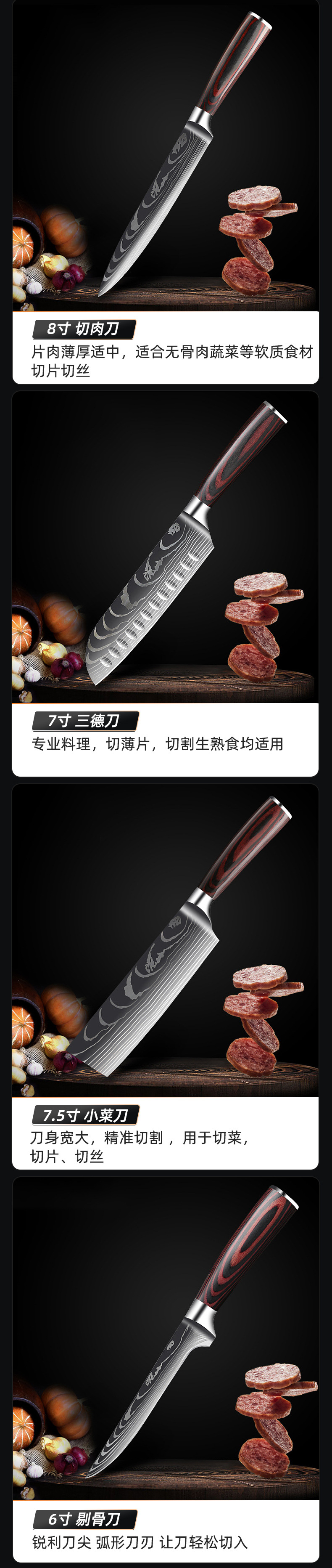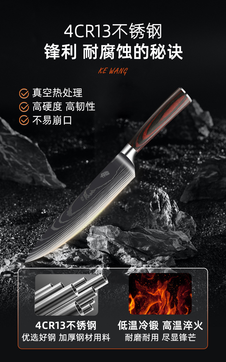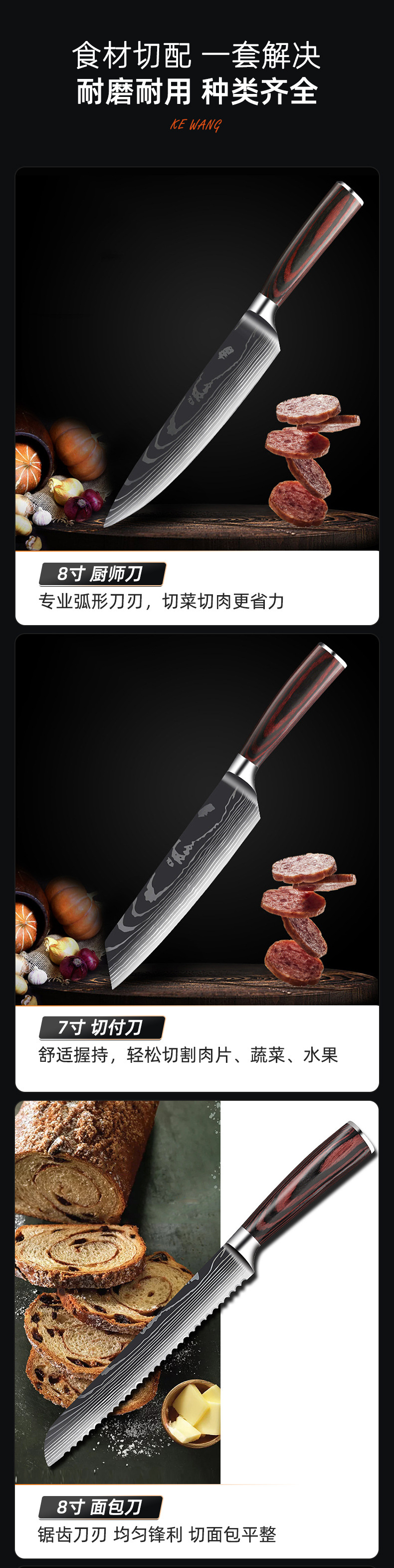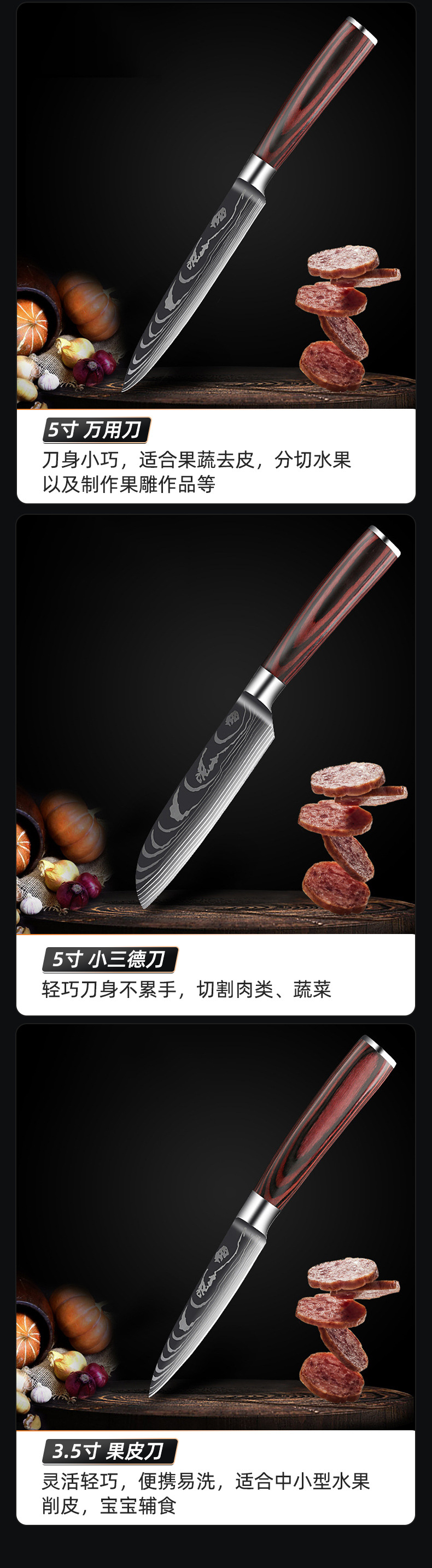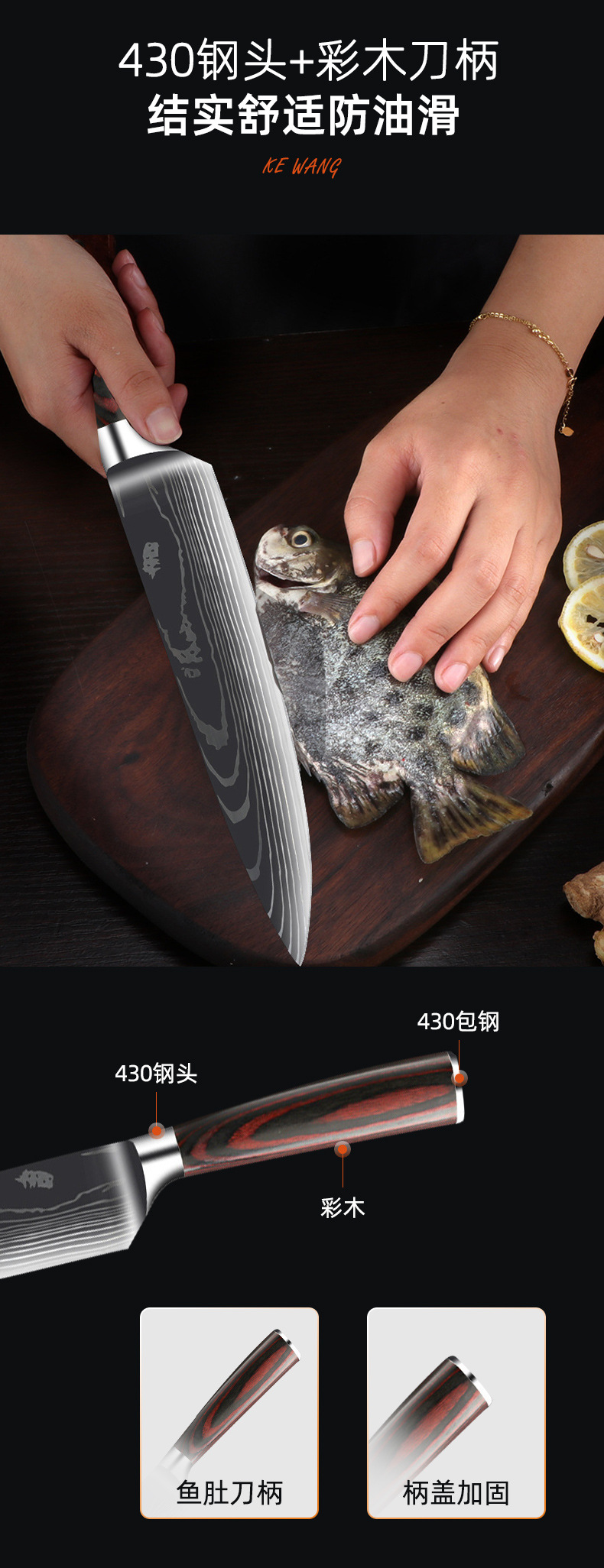 국경 다마스커스 패턴 강철 칼 컬러 우드 8inch 레이저 패턴 요리사 칼 과일 칼 주방 가정용 칼 세트