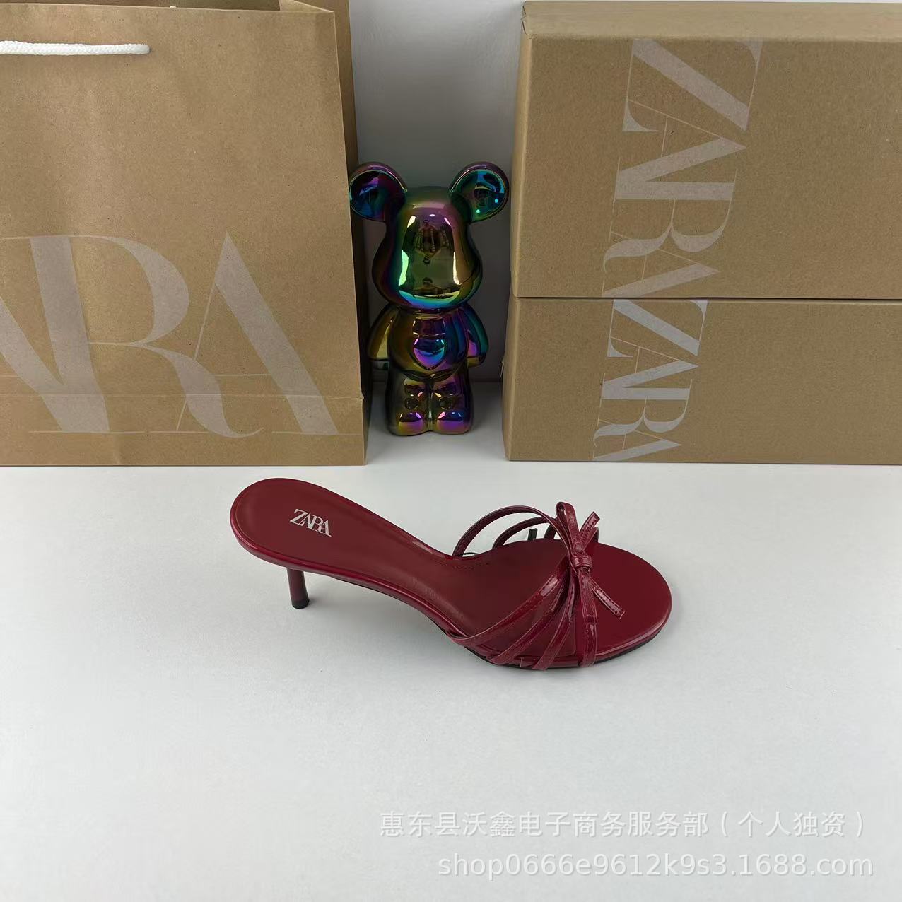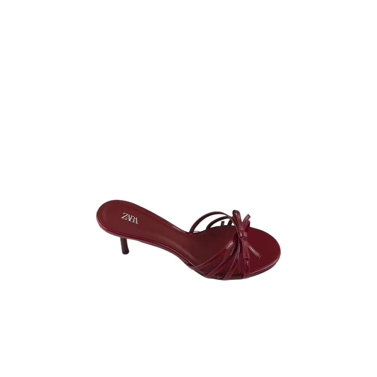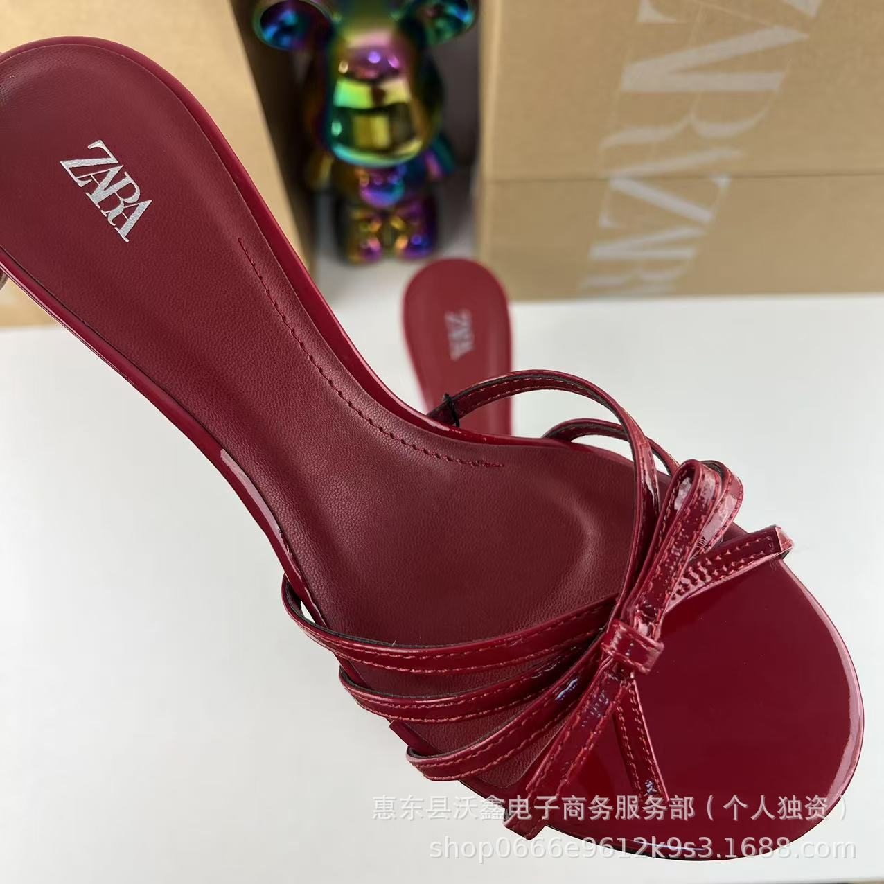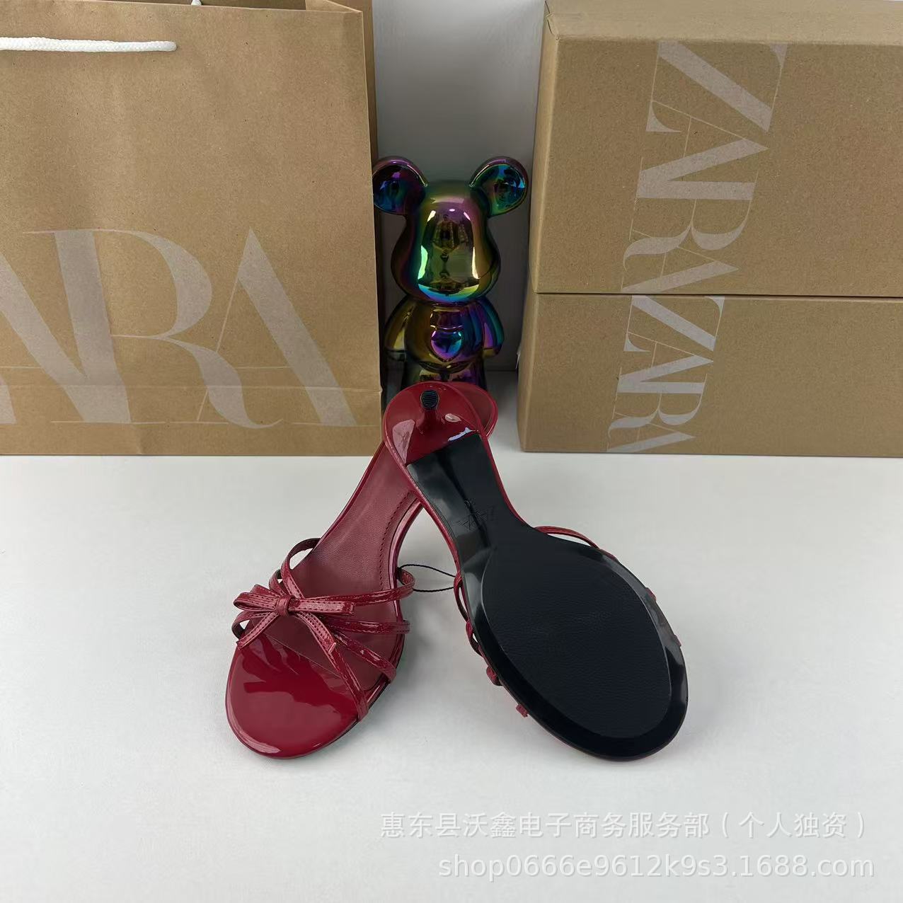 ZAR夏季新品女鞋红色蝴蝶结高跟凉鞋漆皮高跟拖鞋露趾细跟凉鞋