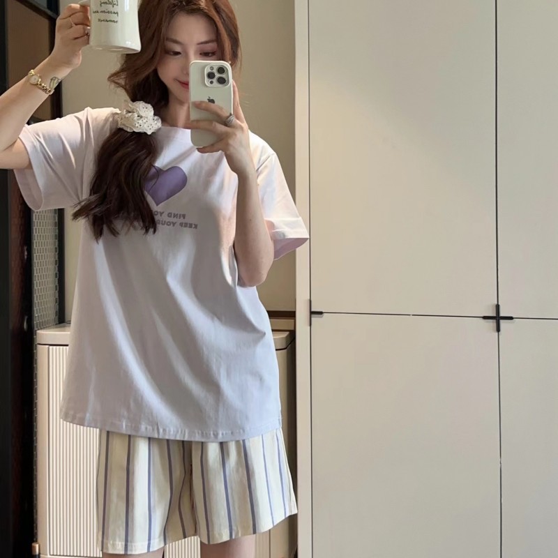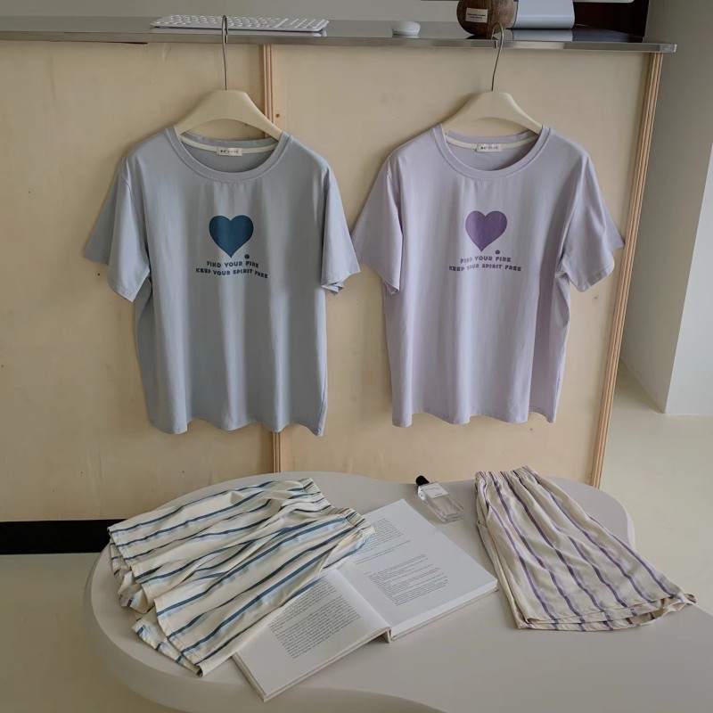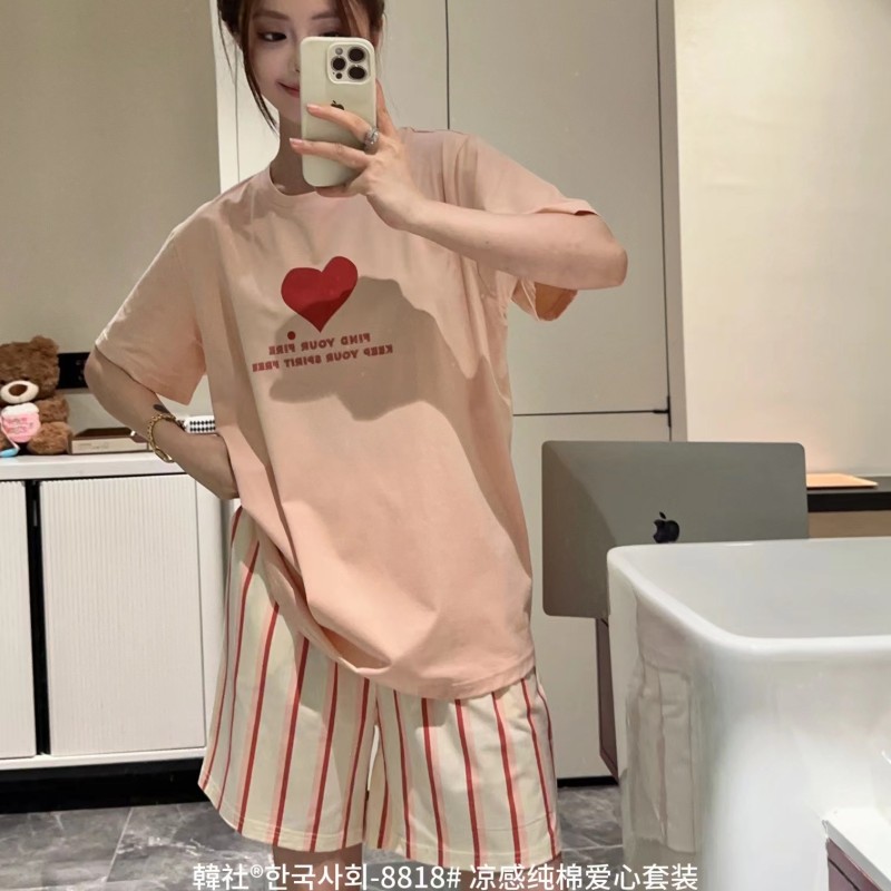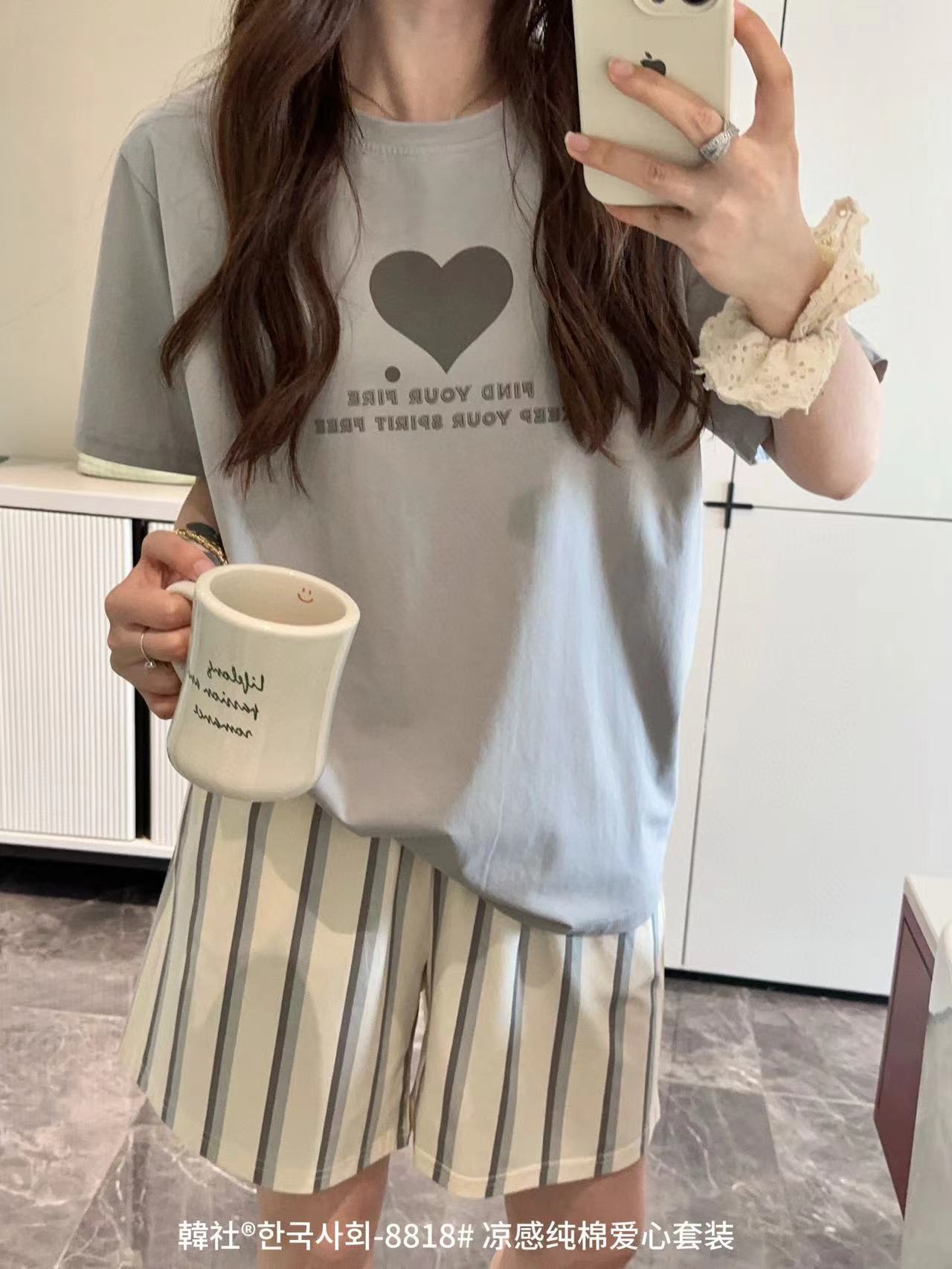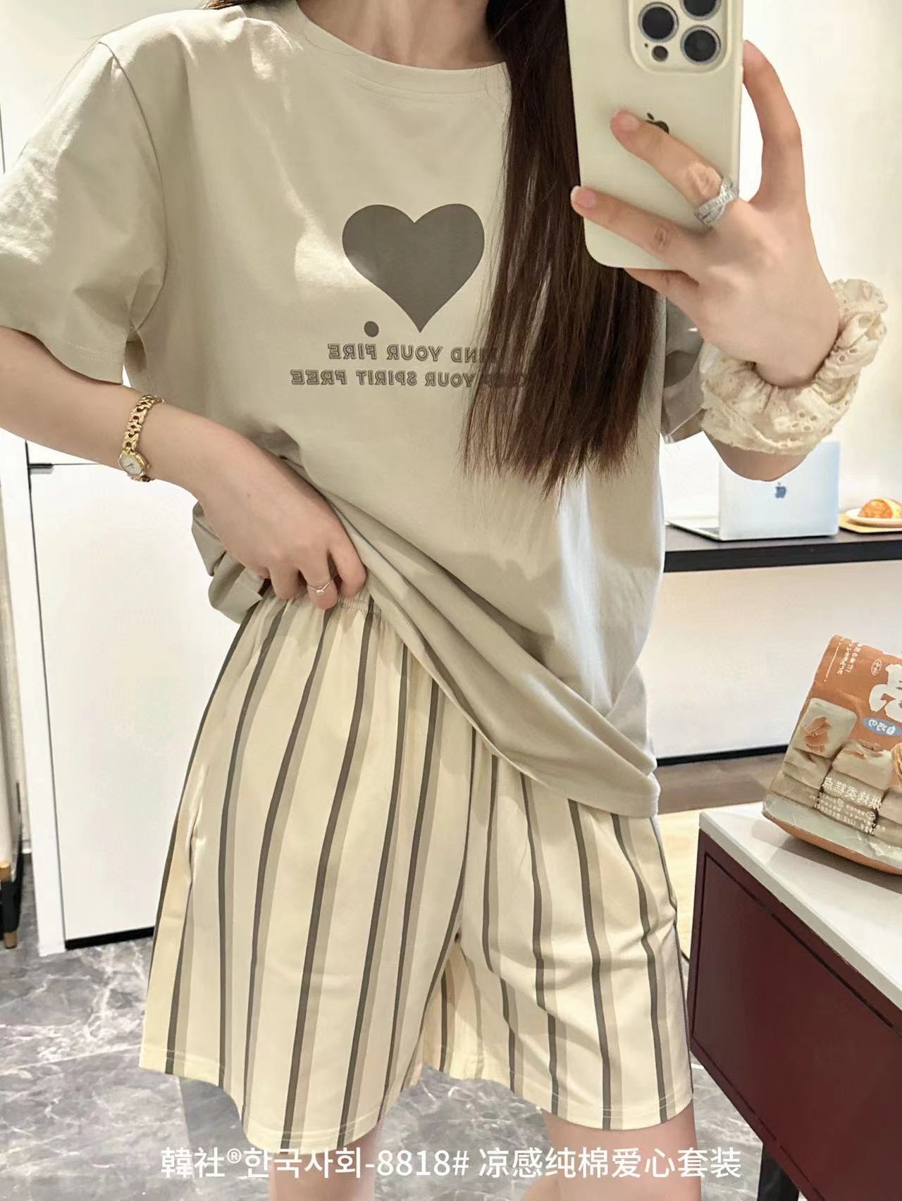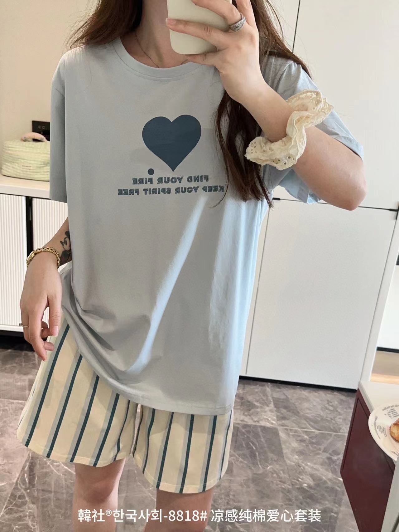 8818 # Hanhe 순면 러브 홈웨어 세트 여성 여름 편안한 캐주얼 루즈 반팔 라운드 넥 잠옷
