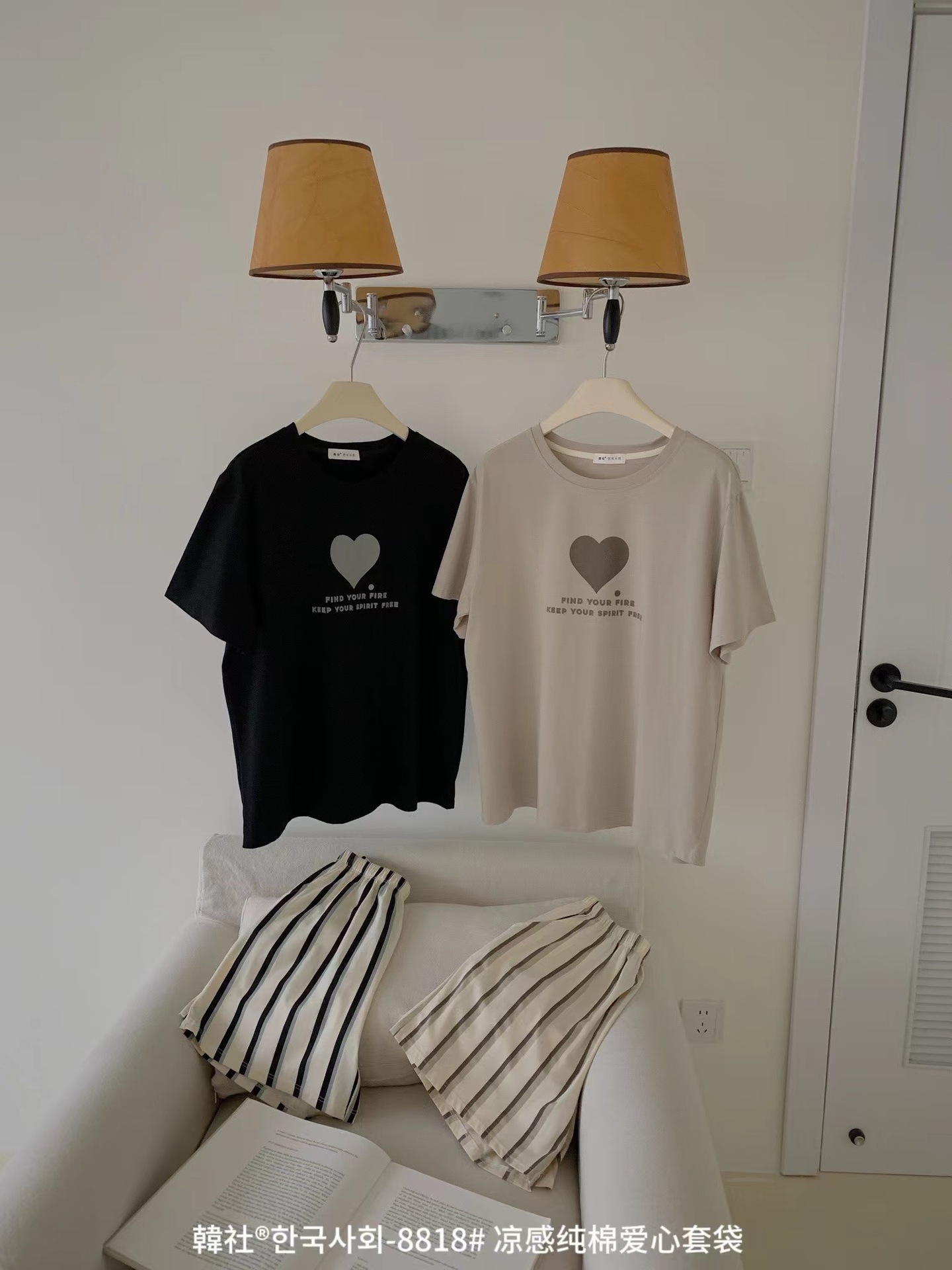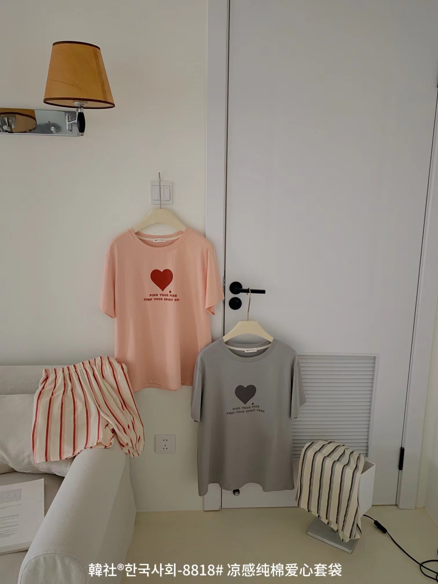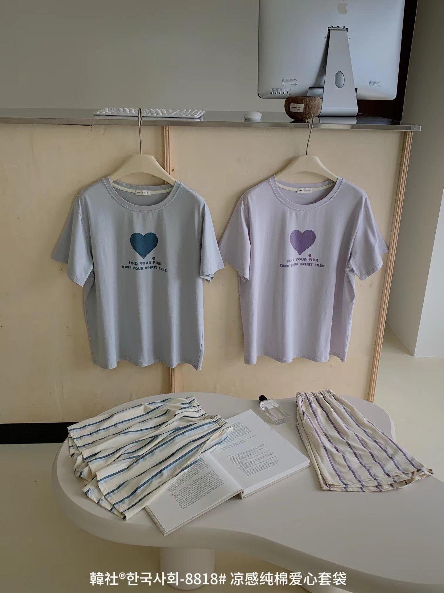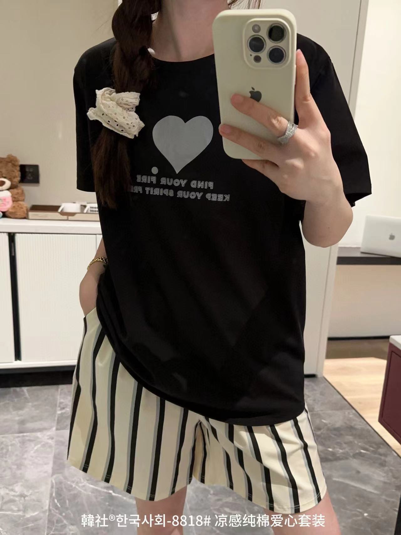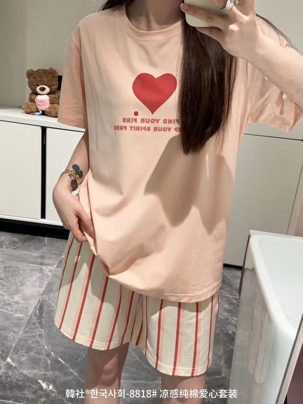 8818 # Hanhe 순면 러브 홈웨어 세트 여성 여름 편안한 캐주얼 루즈 반팔 라운드 넥 잠옷