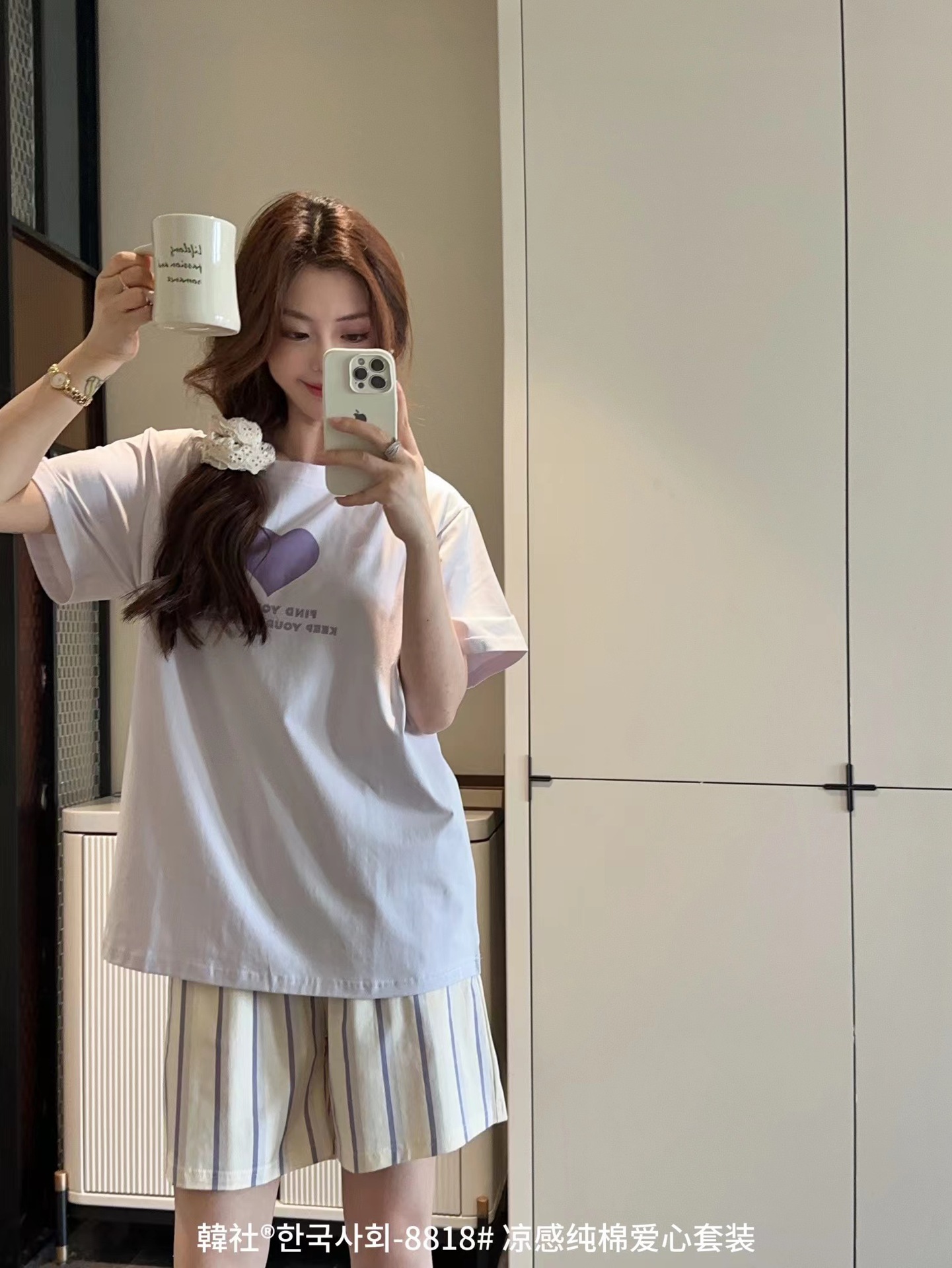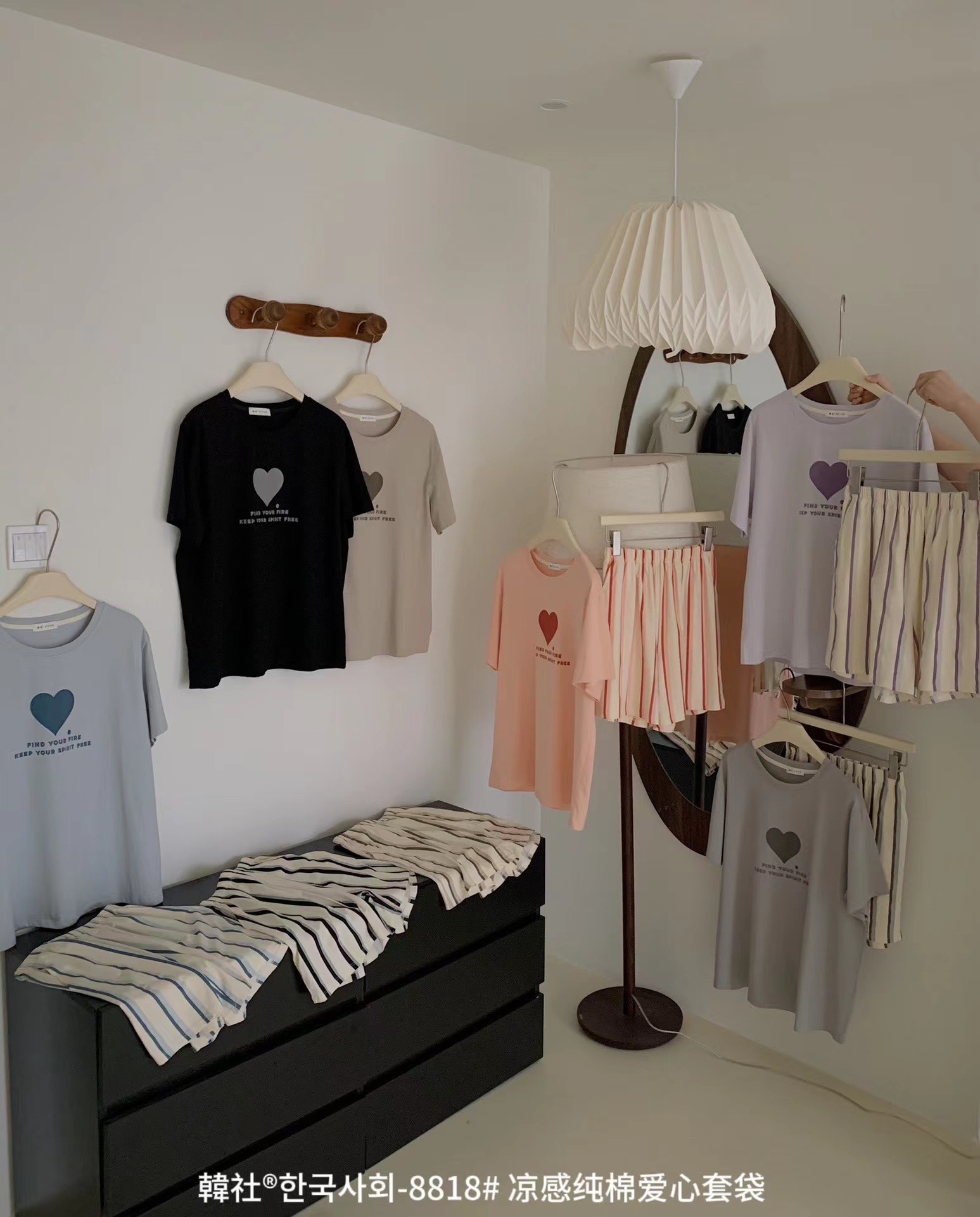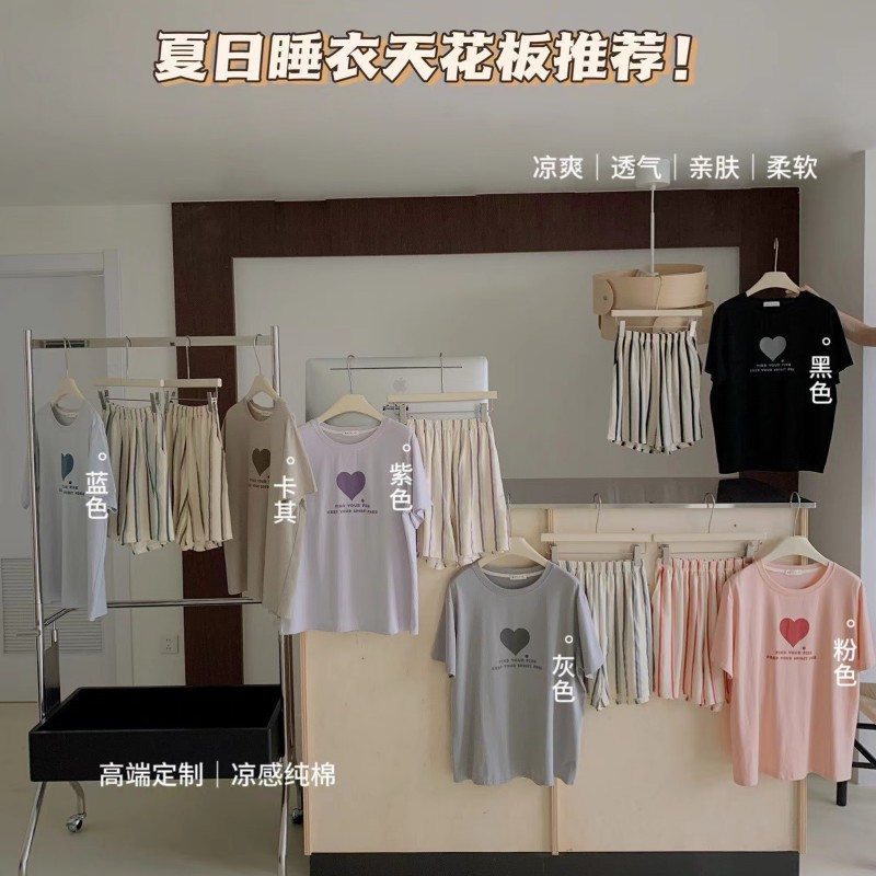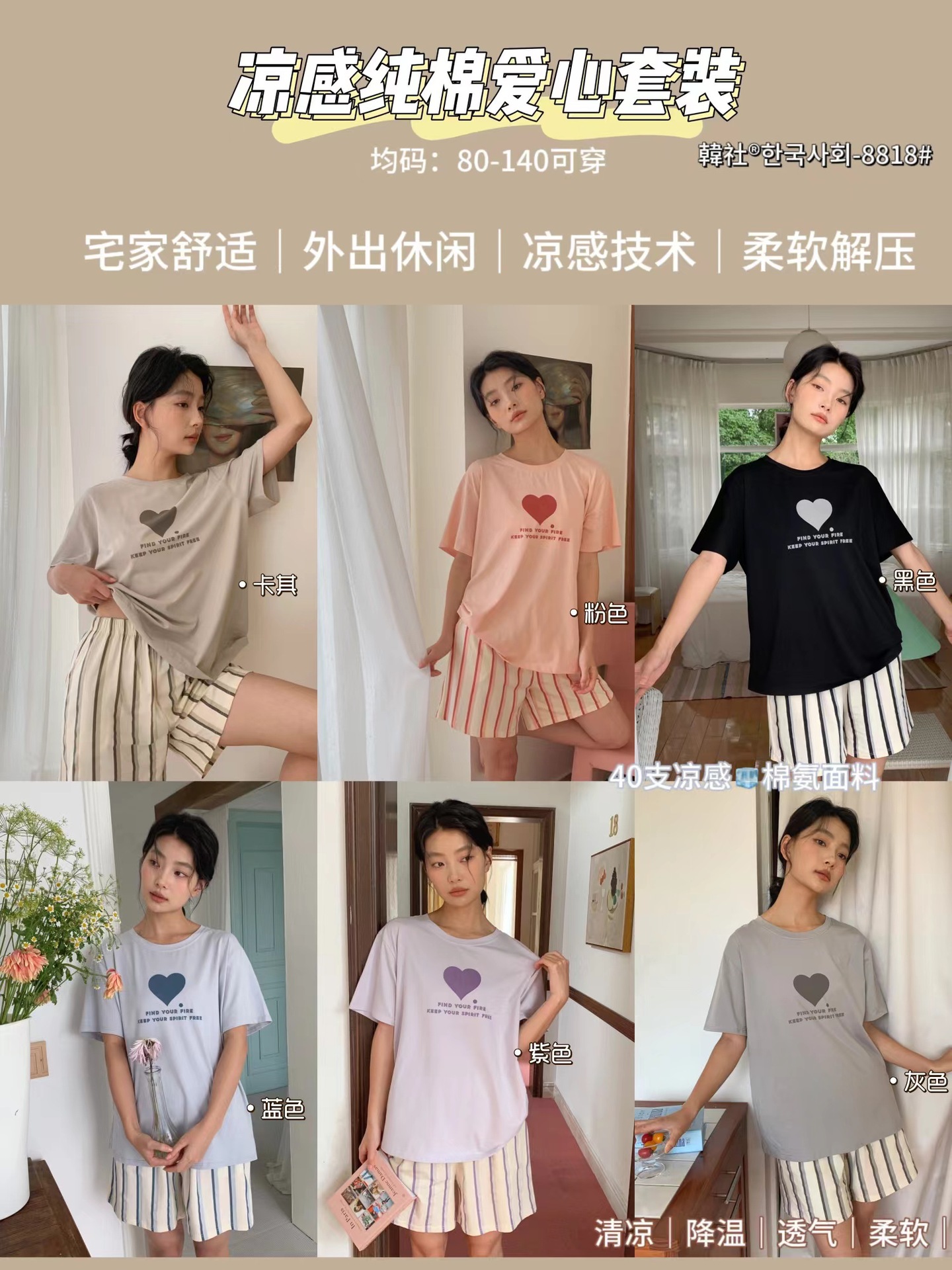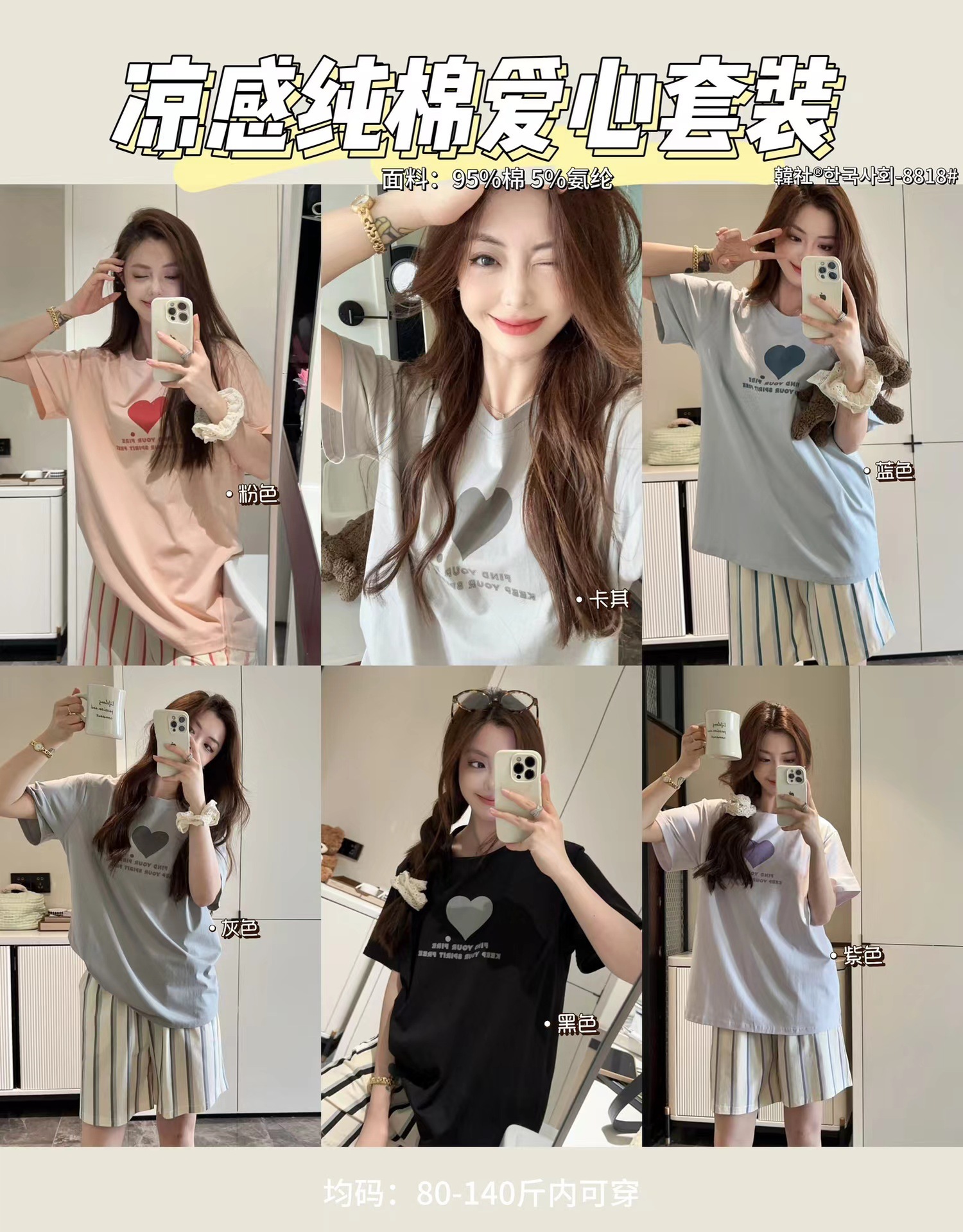 8818 # Hanhe 순면 러브 홈웨어 세트 여성 여름 편안한 캐주얼 루즈 반팔 라운드 넥 잠옷