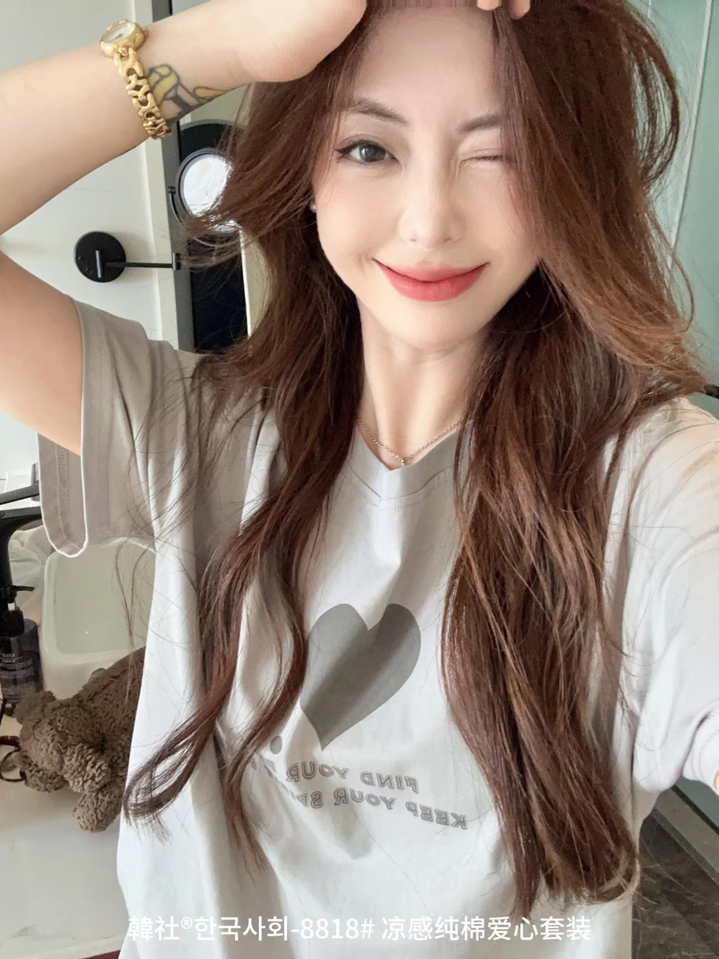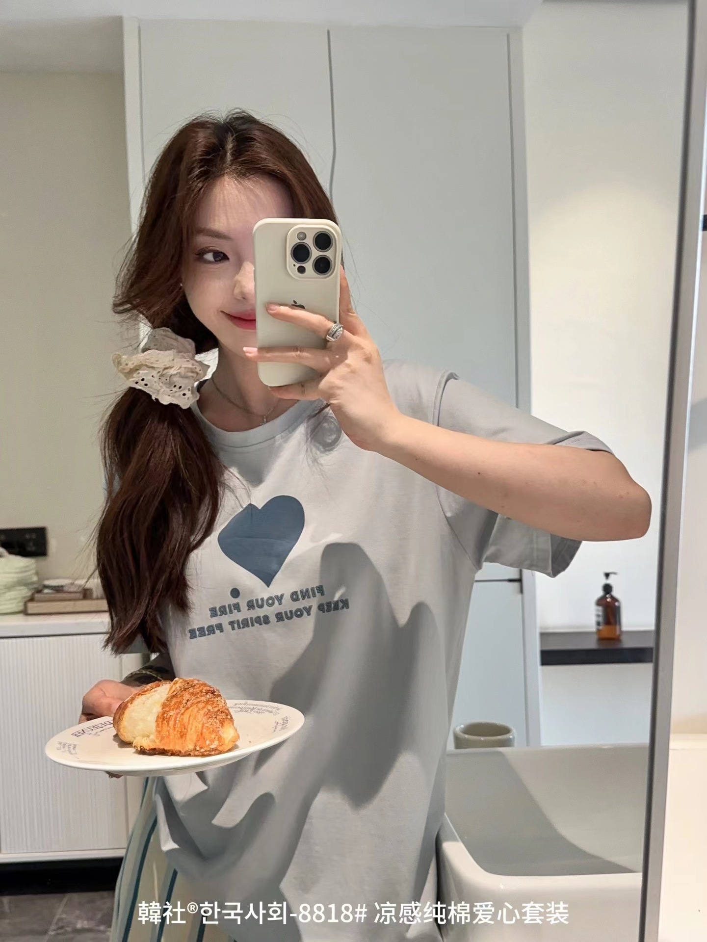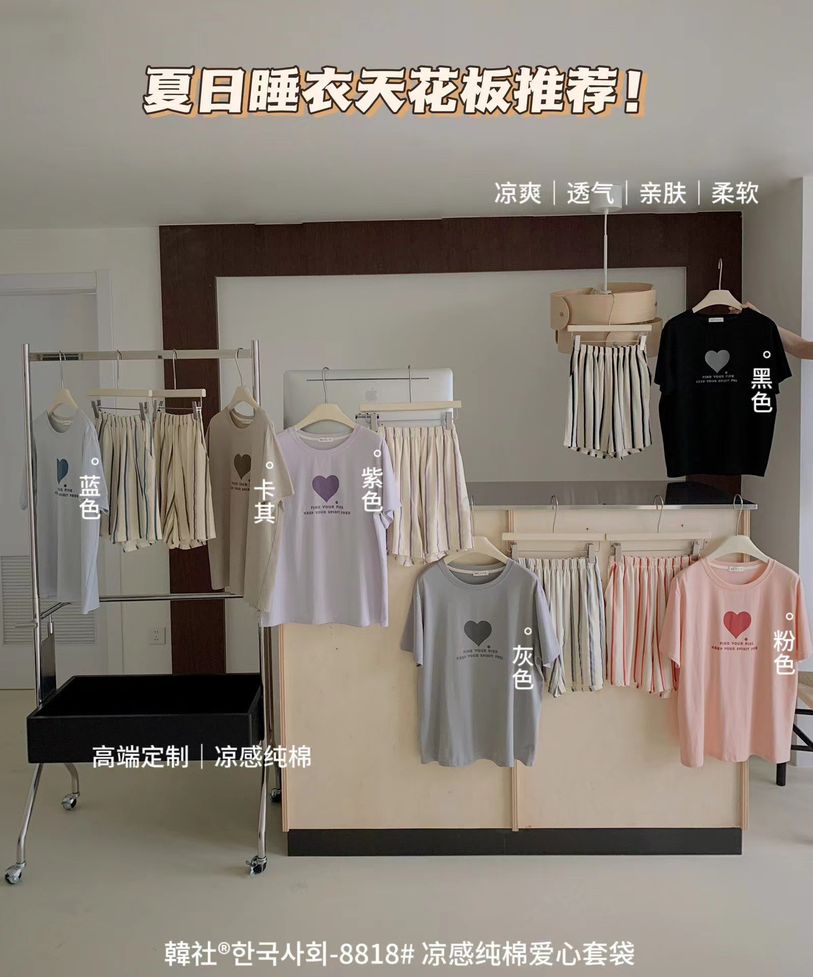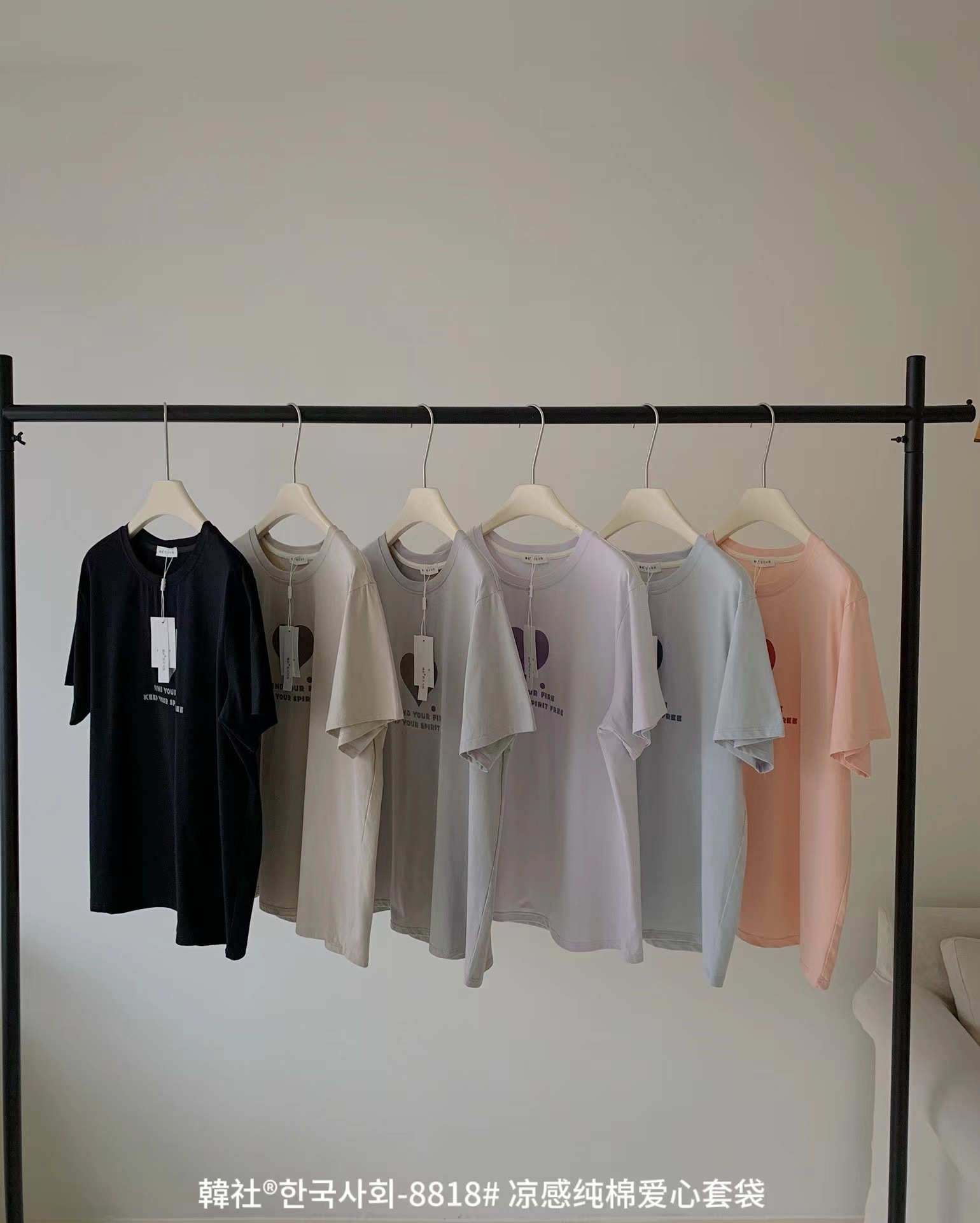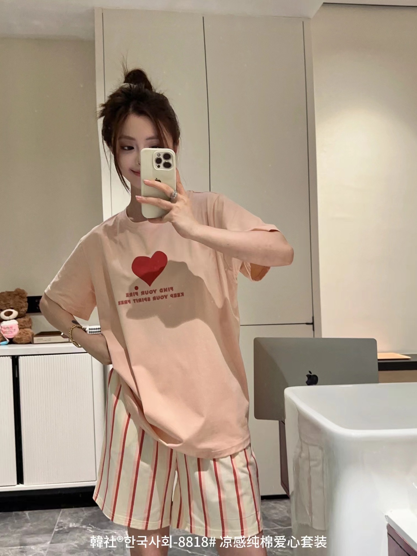 8818 # Hanhe 순면 러브 홈웨어 세트 여성 여름 편안한 캐주얼 루즈 반팔 라운드 넥 잠옷