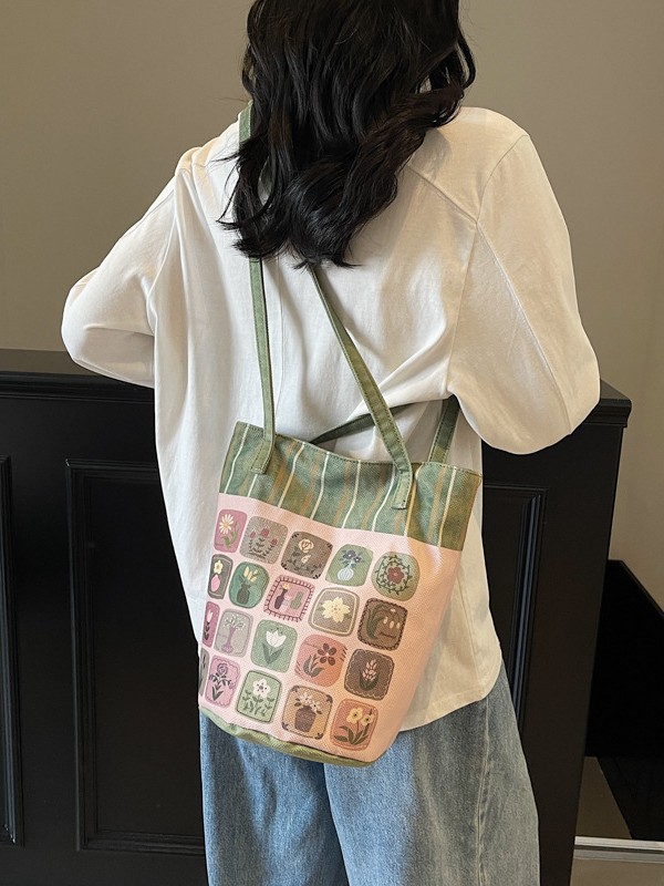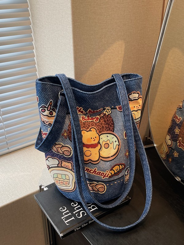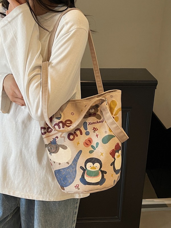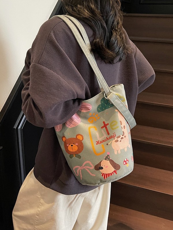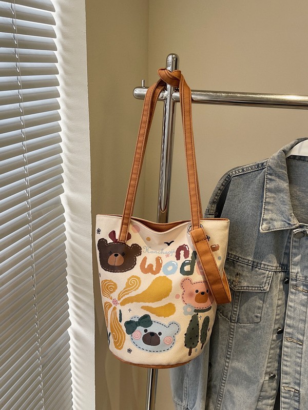 간단한 질감 예술적 버킷 가방 여성의 2025 새로운 귀여운 만화 헝겊 가방 캐주얼 독특한 어깨 크로스 바디 백