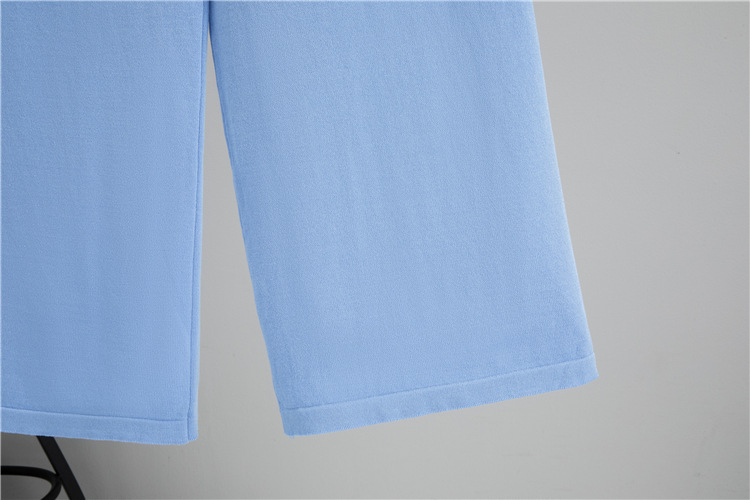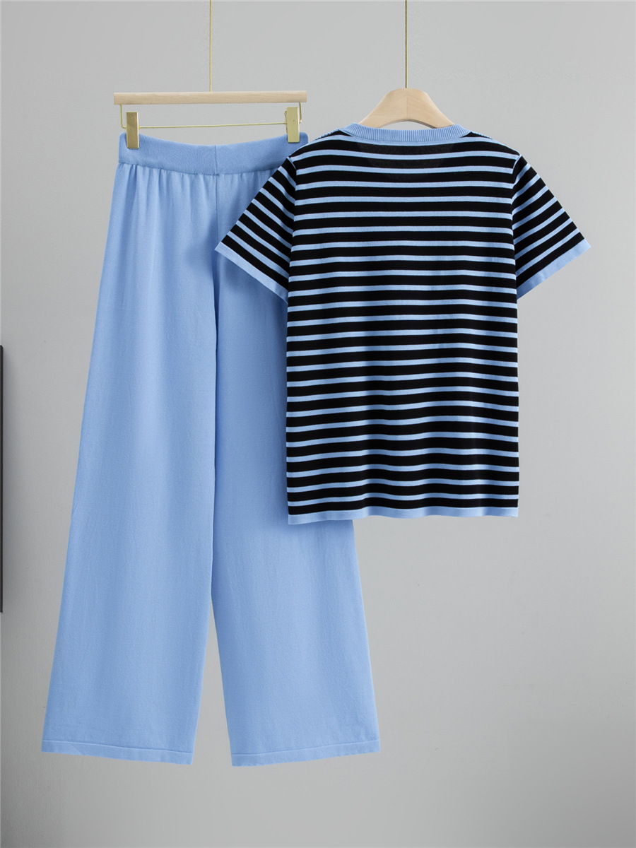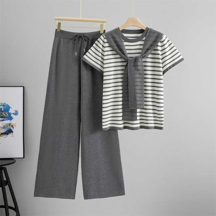 국경 간 우아한 캐주얼 스포츠 니트 세트 여성 여름 루즈 레이스업 반소매 탑 와이드 레그 팬츠 투피스 세트