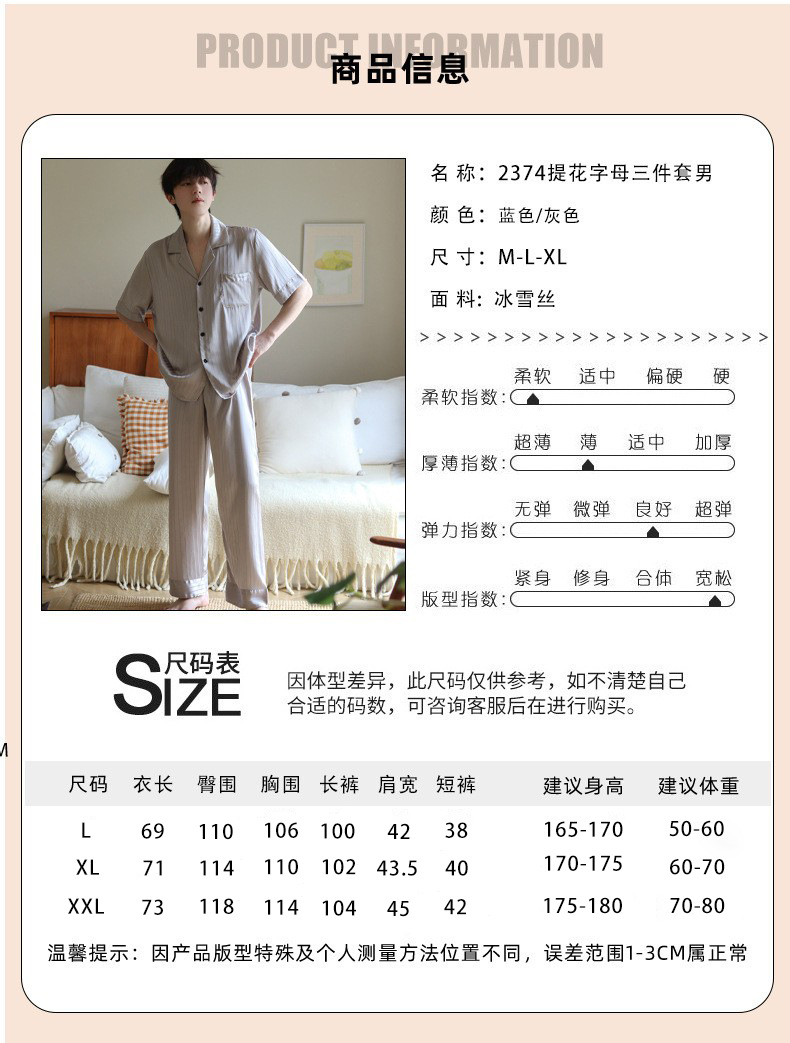 2026년 신상 남성용 아이스 실크 잠옷 3종 세트, 고급스럽고 통기성이 좋은 얇은 홈웨어 세트, 외부에서 착용 가능