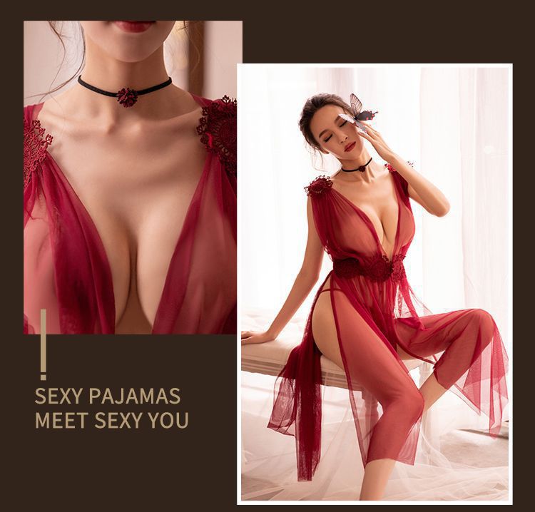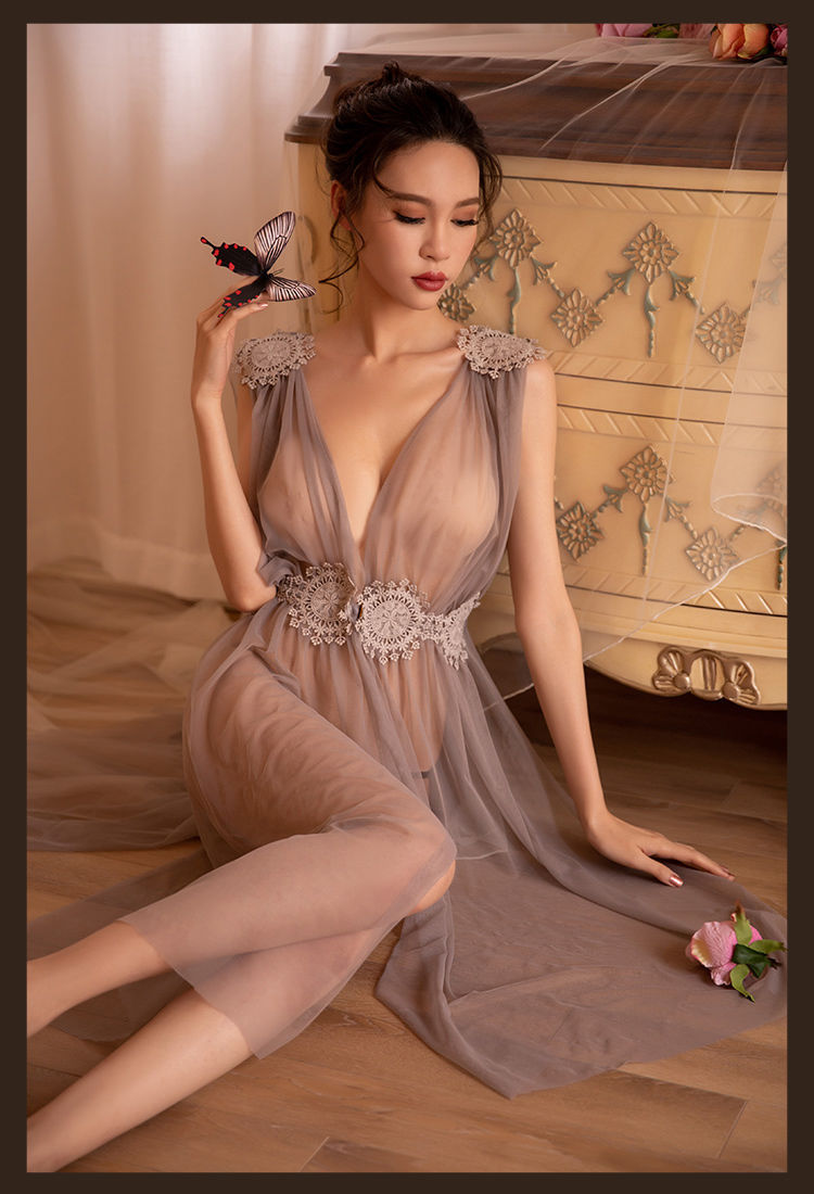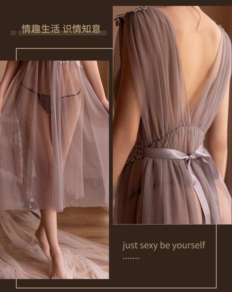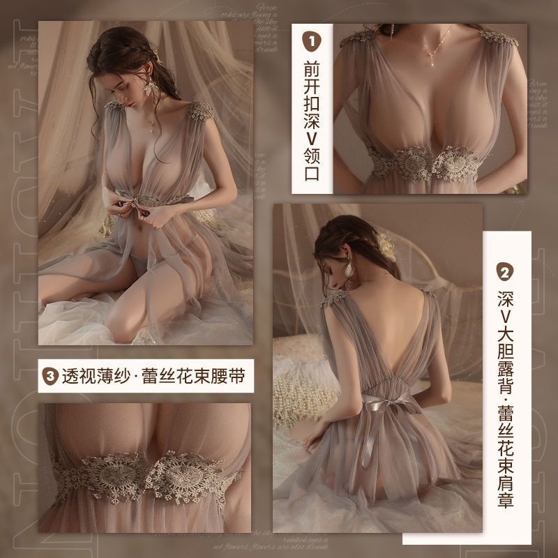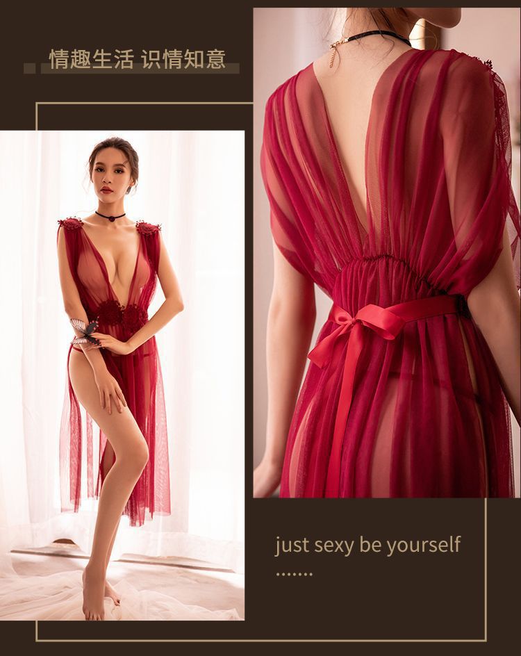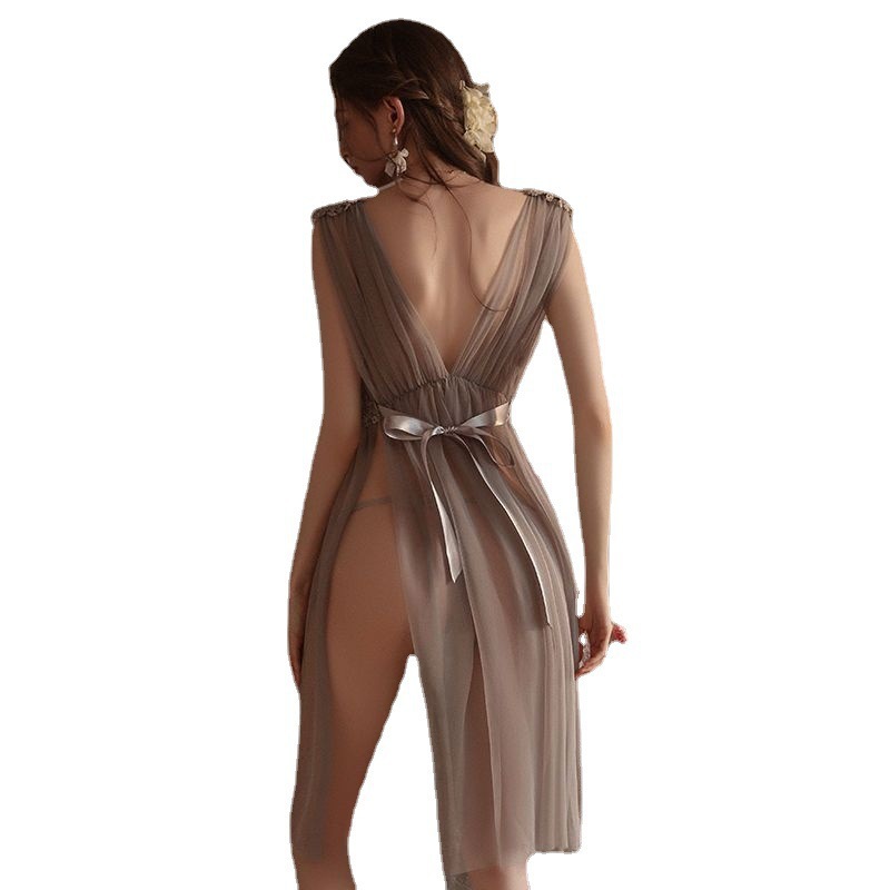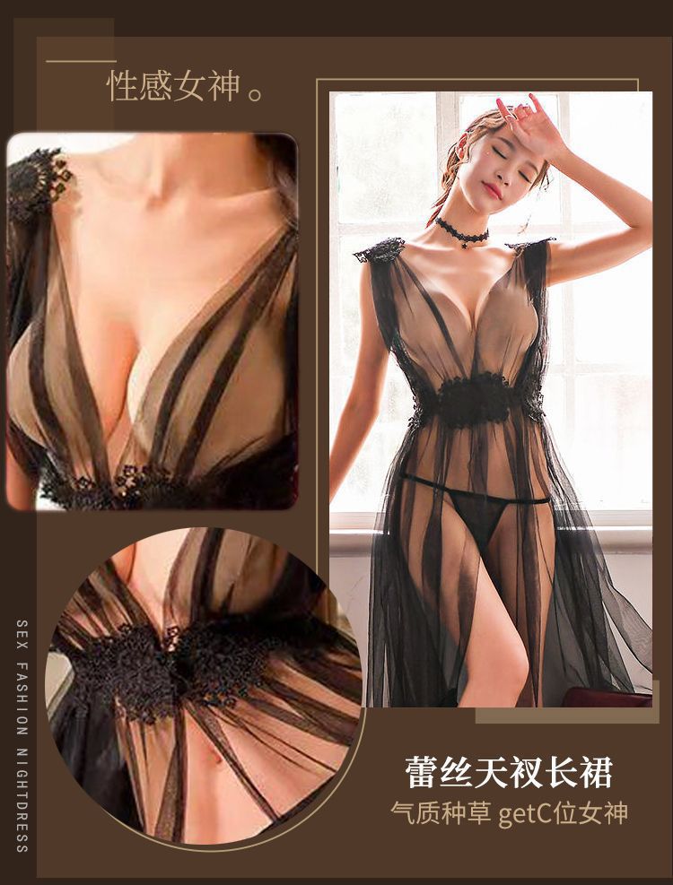 섹시한 속옷, 슈퍼 요정 메쉬 롱 스커트, 시스루 섹시한 잠옷, 레이스 투명 드레스, 딥 V 백리스 하이 슬릿