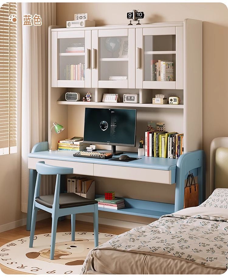 파란색과 흰색 책상과 책장이 하나로