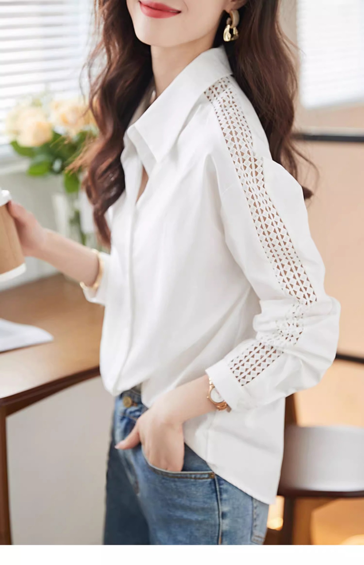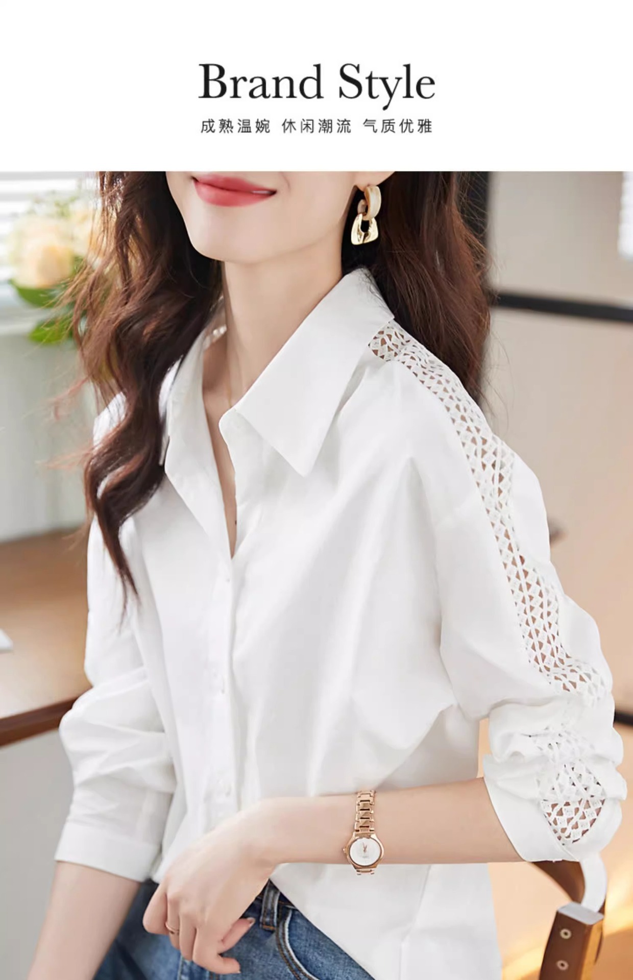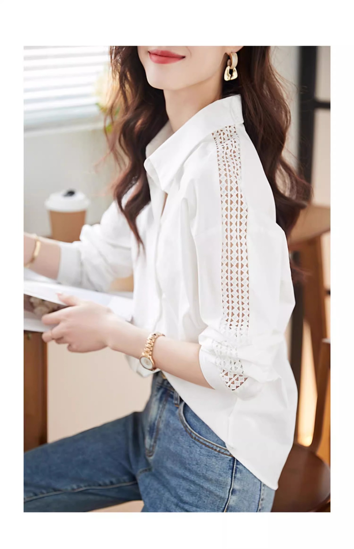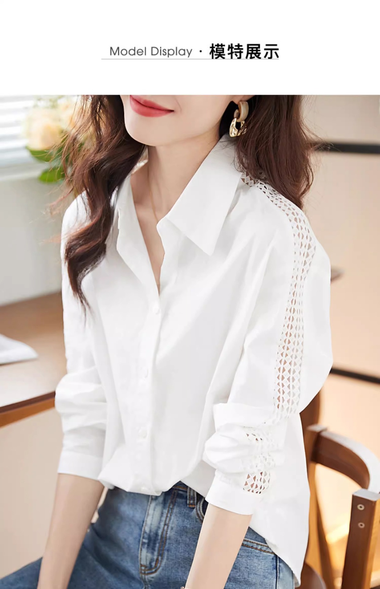 여름 새로운 하이 엔드 느슨한 대형 쉬폰 셔츠 여성 중공 긴팔 캐주얼 다목적 슬리밍 화이트 셔츠