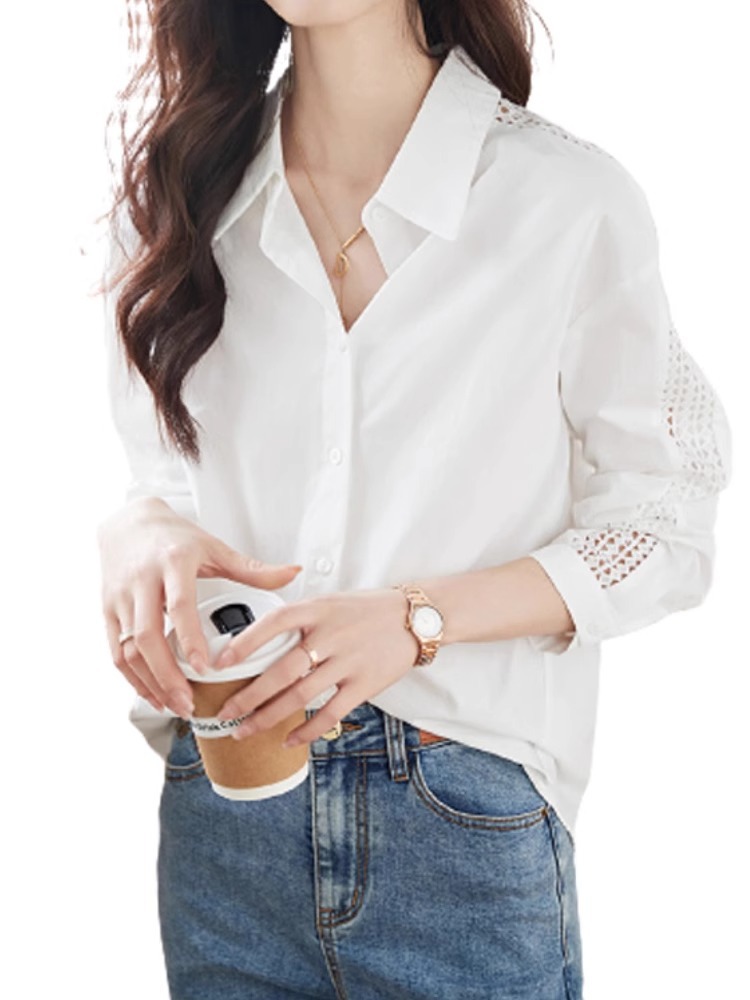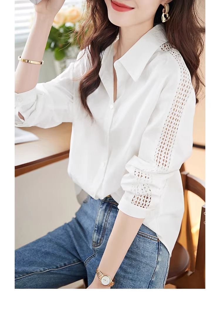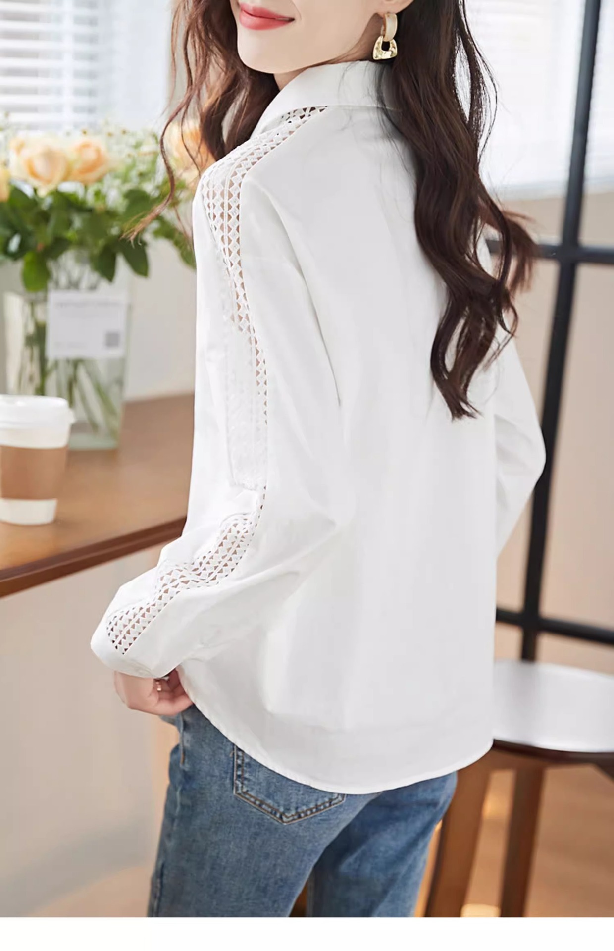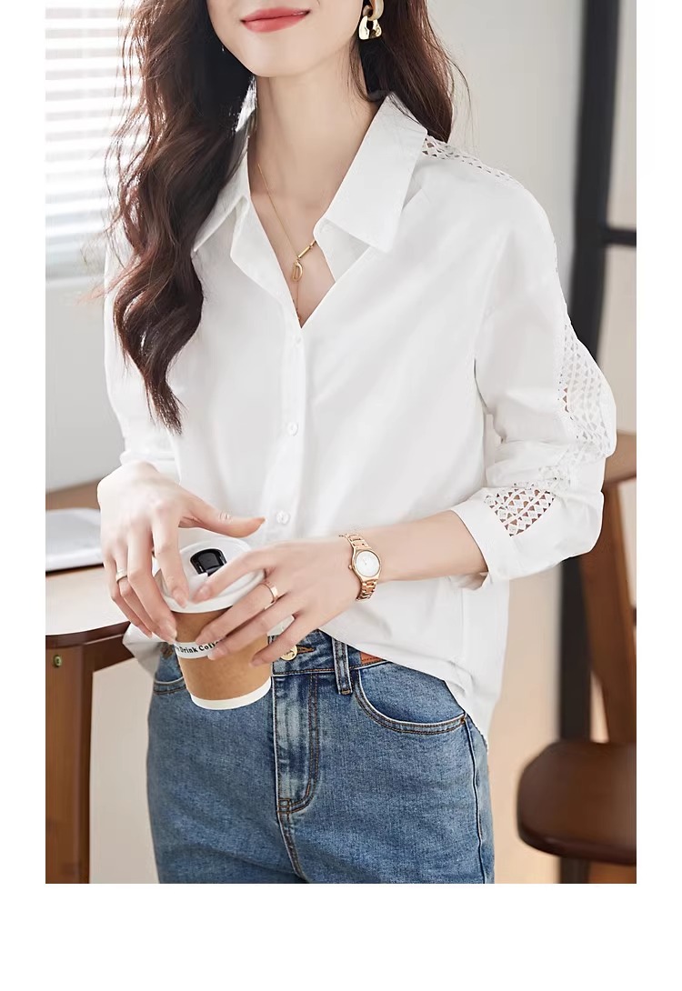 여름 새로운 하이 엔드 느슨한 대형 쉬폰 셔츠 여성 중공 긴팔 캐주얼 다목적 슬리밍 화이트 셔츠