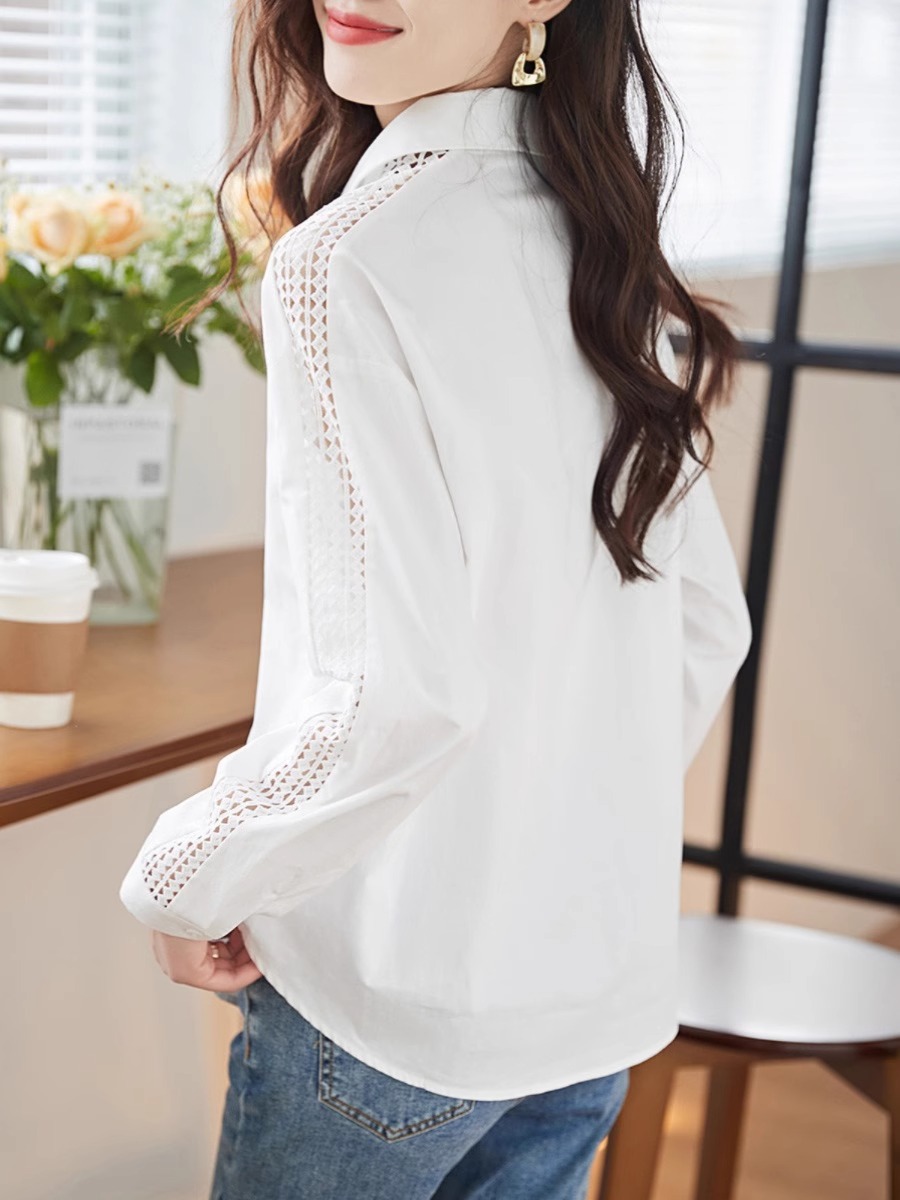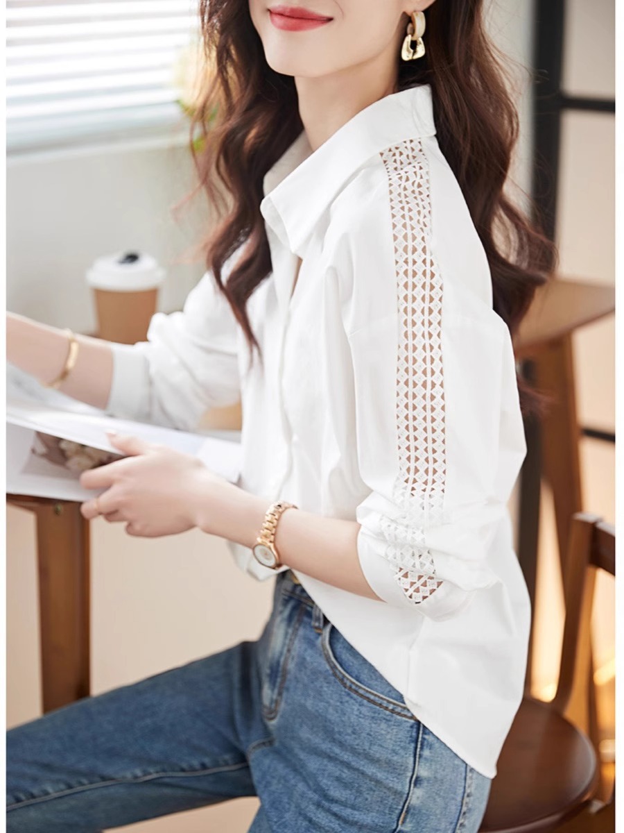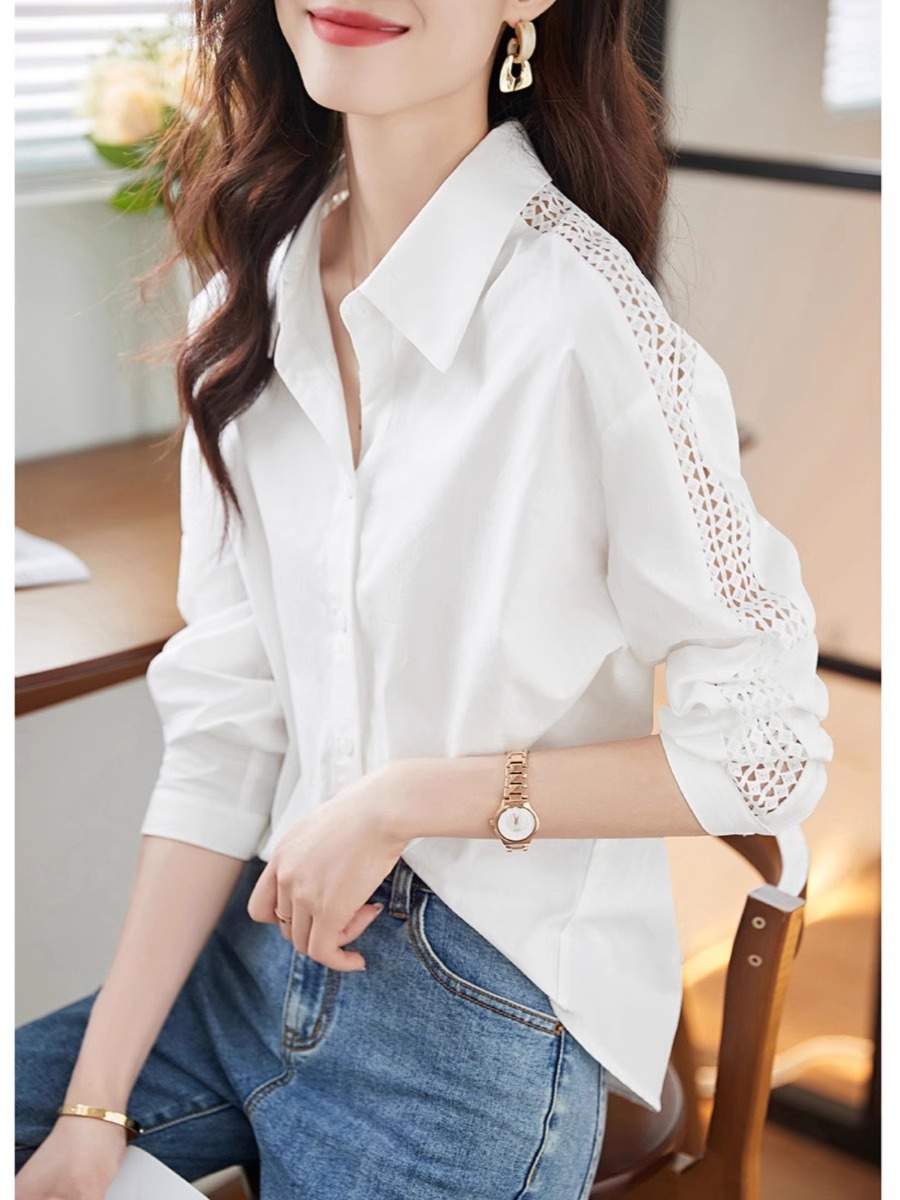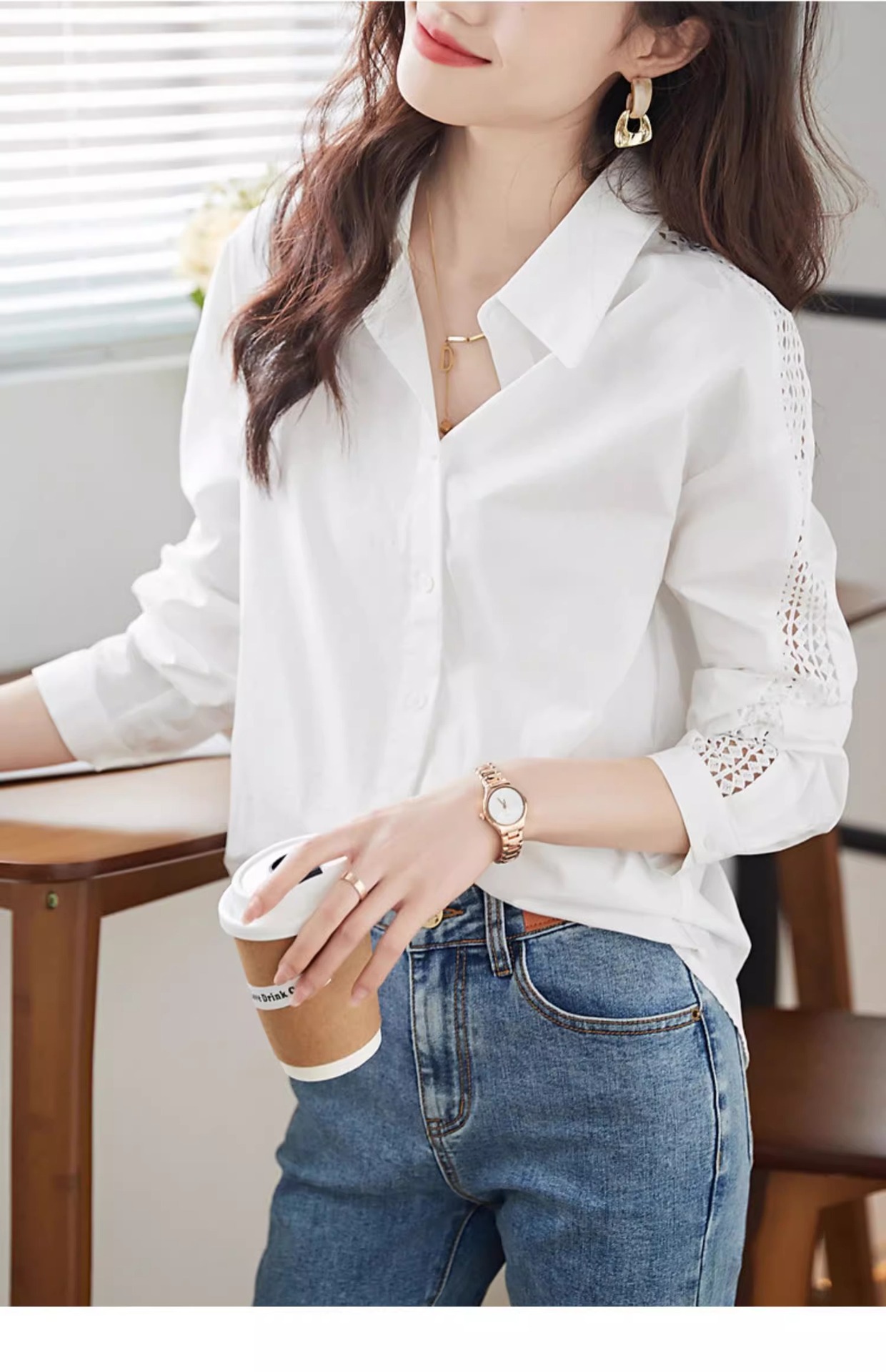 여름 새로운 하이 엔드 느슨한 대형 쉬폰 셔츠 여성 중공 긴팔 캐주얼 다목적 슬리밍 화이트 셔츠