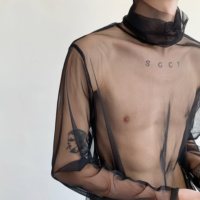 힙 하이 칼라 메쉬베이스 셔츠 선스크린 긴 소매 티셔츠 남성용 여름 빈 투명 얇은 탑 디자인 센스 틈새