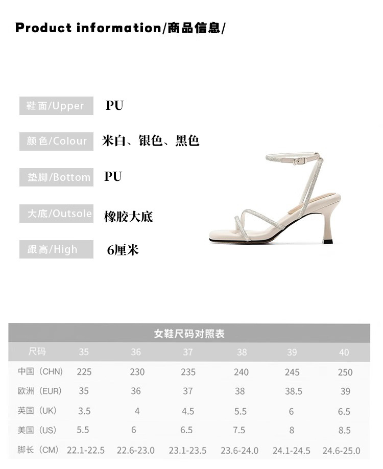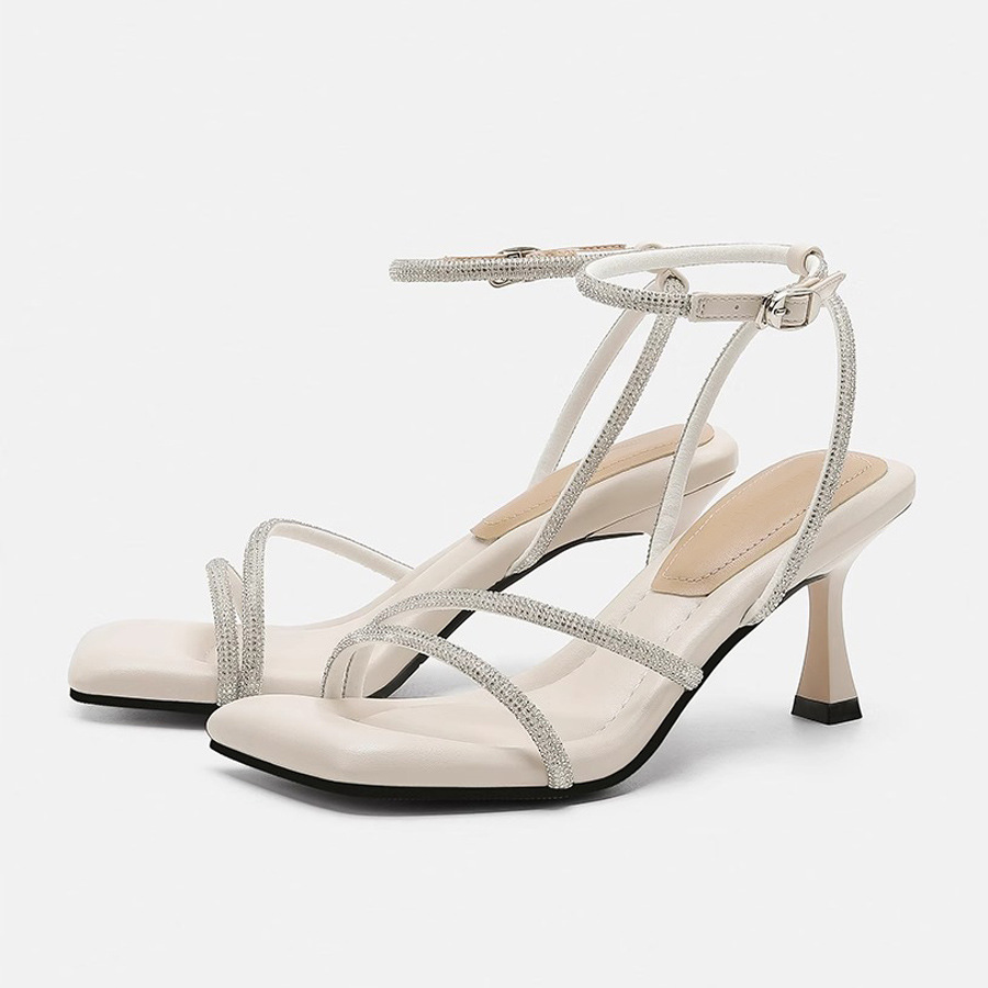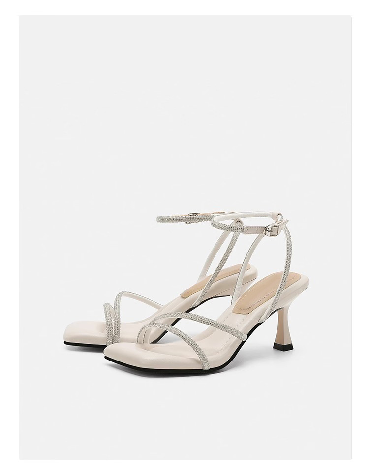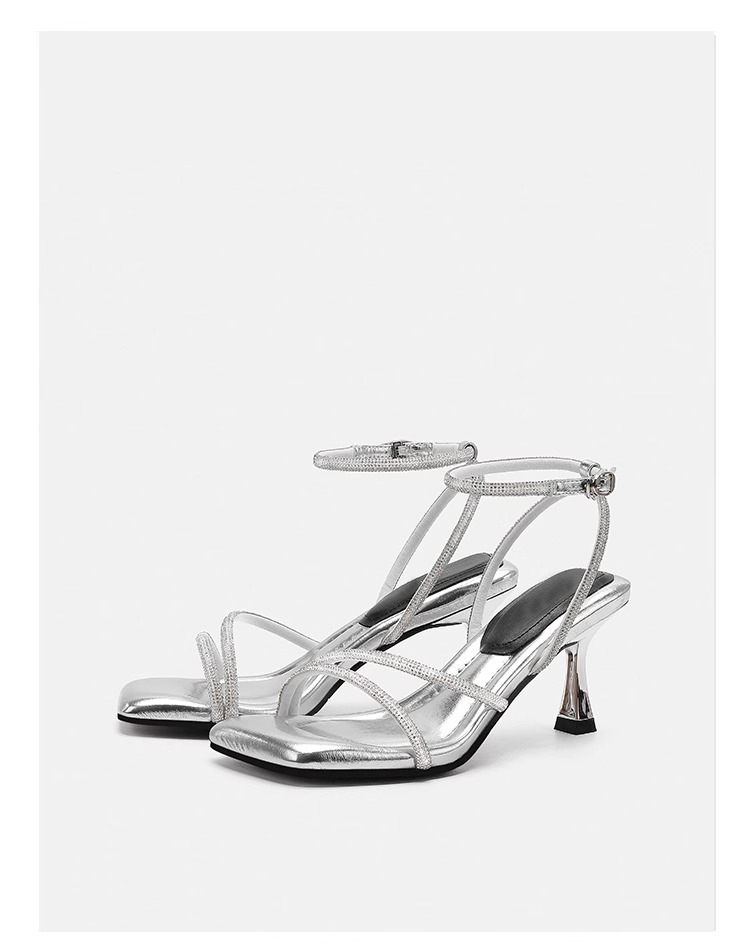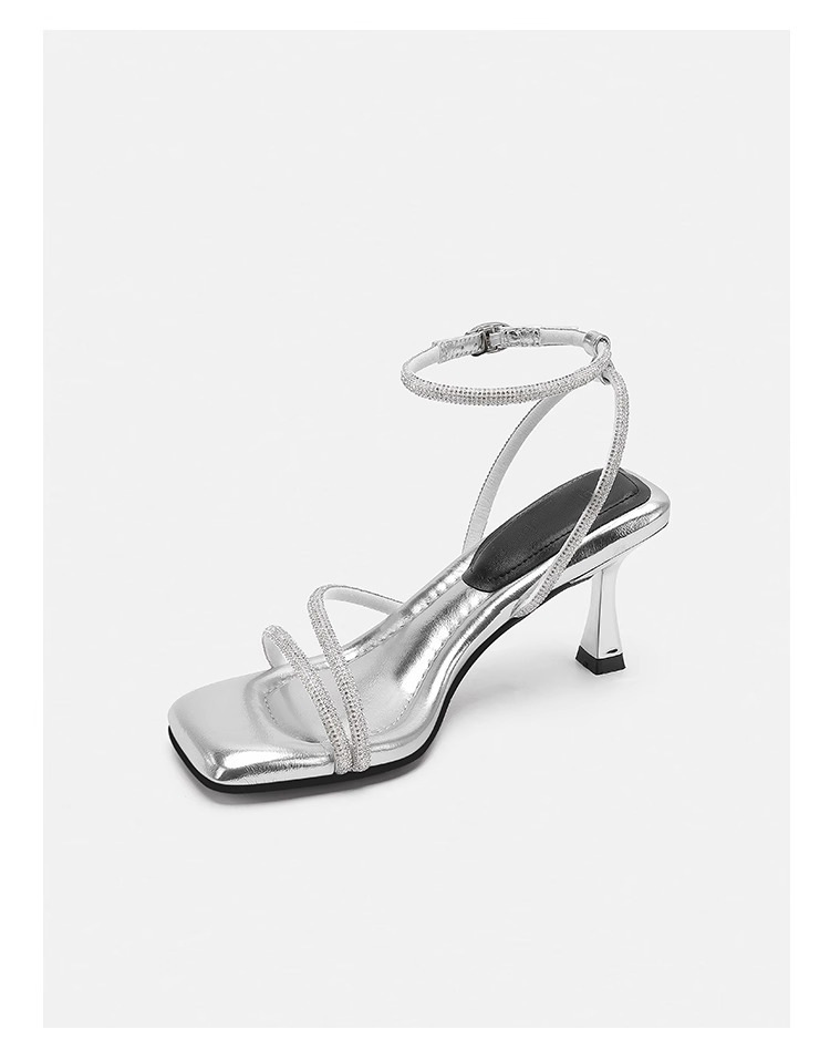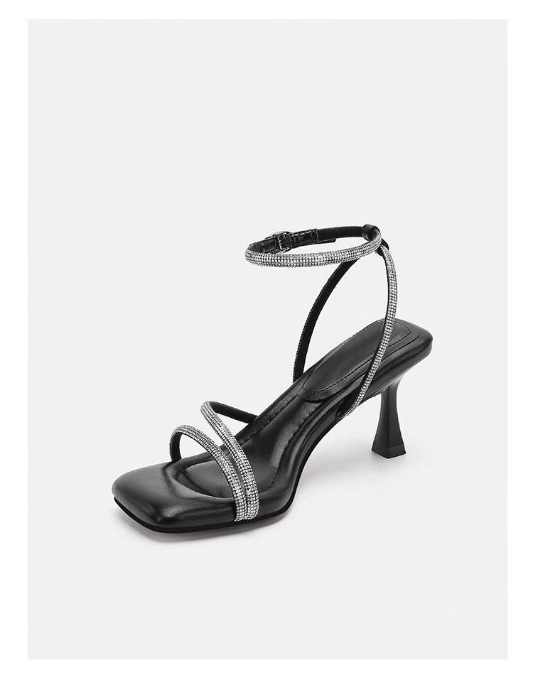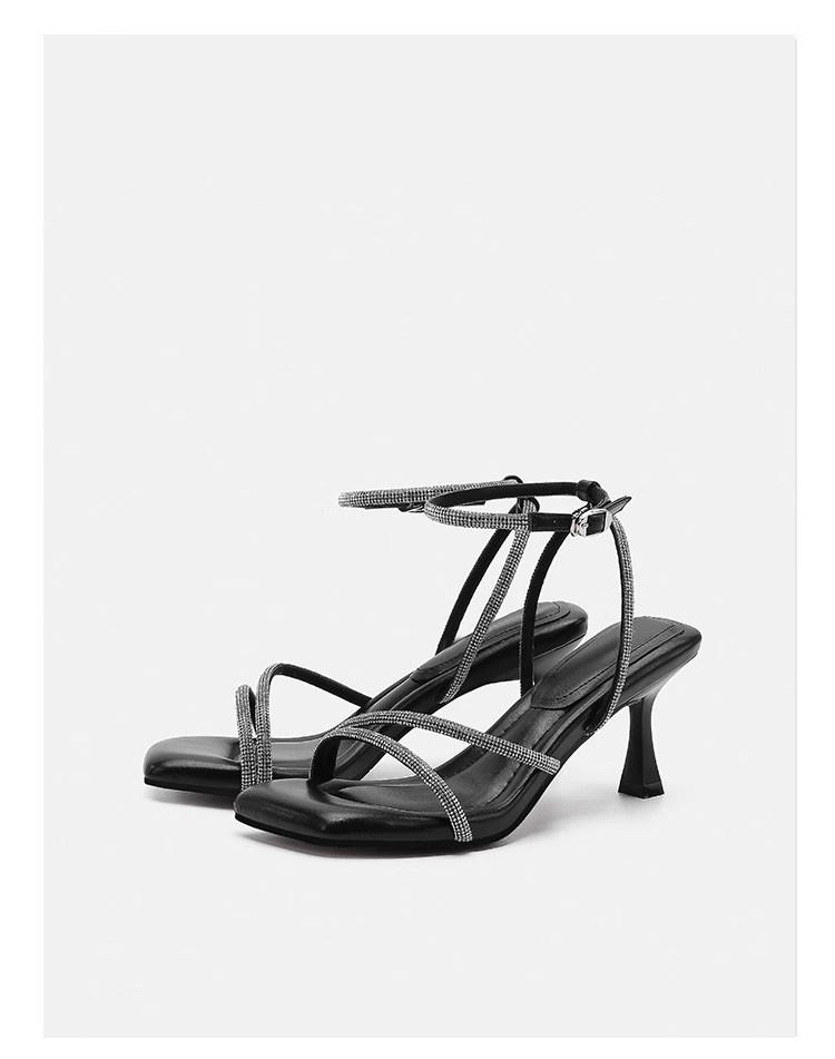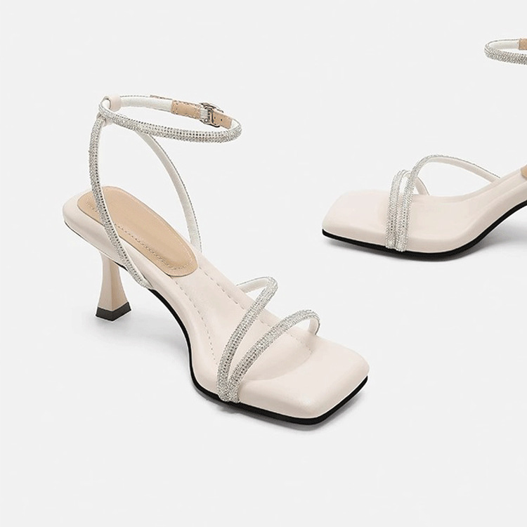 여성용 하이힐 샌들 2025 여름 신상 스퀘어 토 아름다운 하이힐 아우터용 라인스톤 원 스트랩 스틸레토 샌들